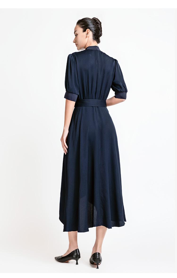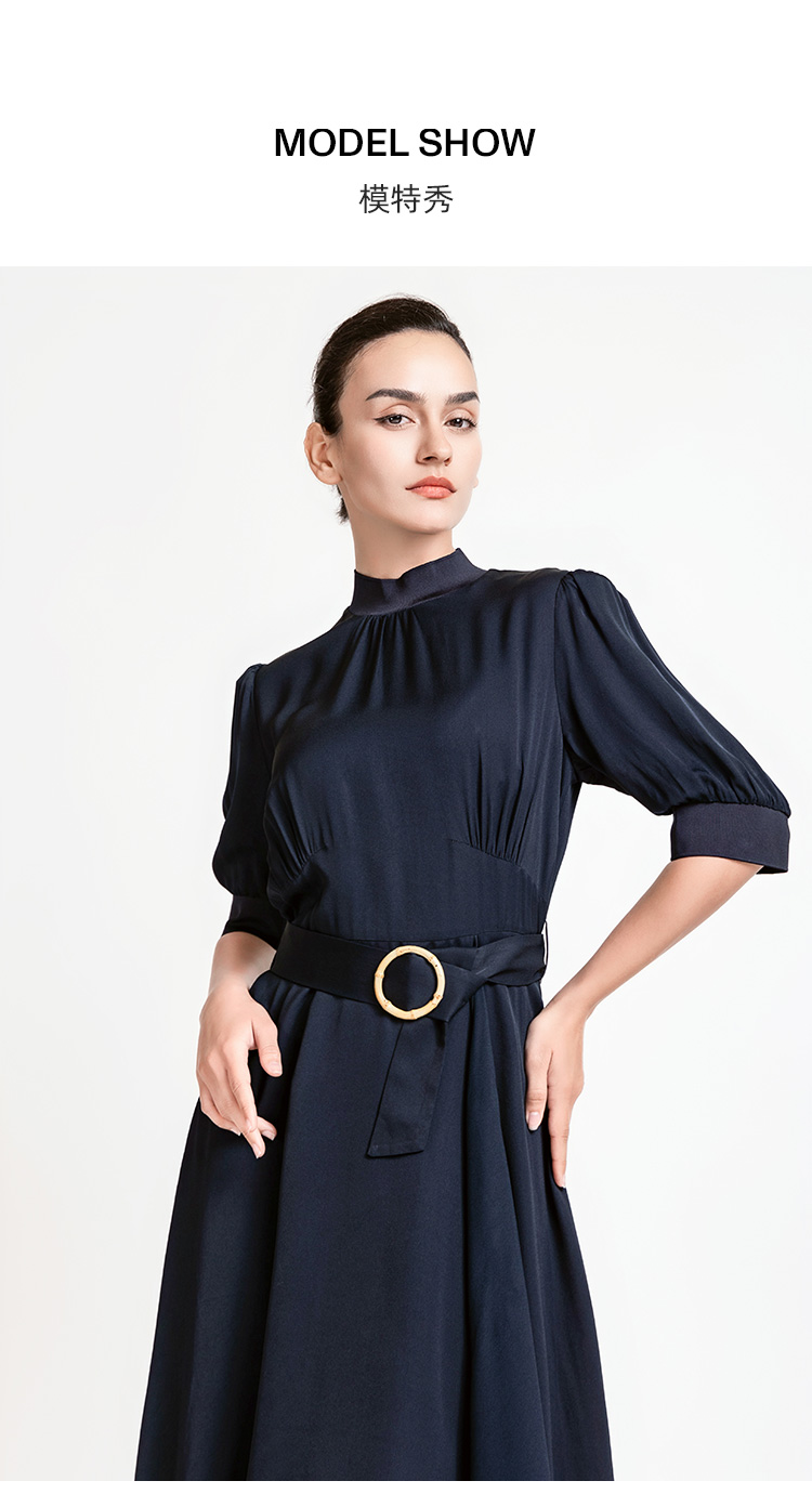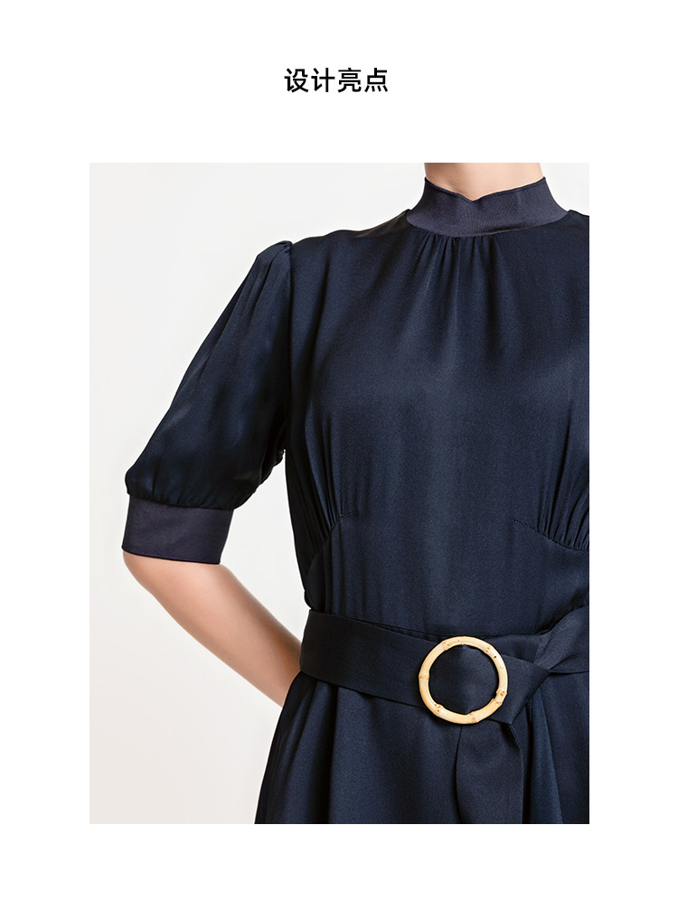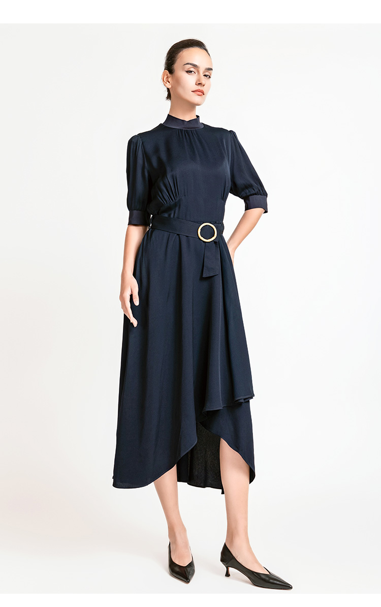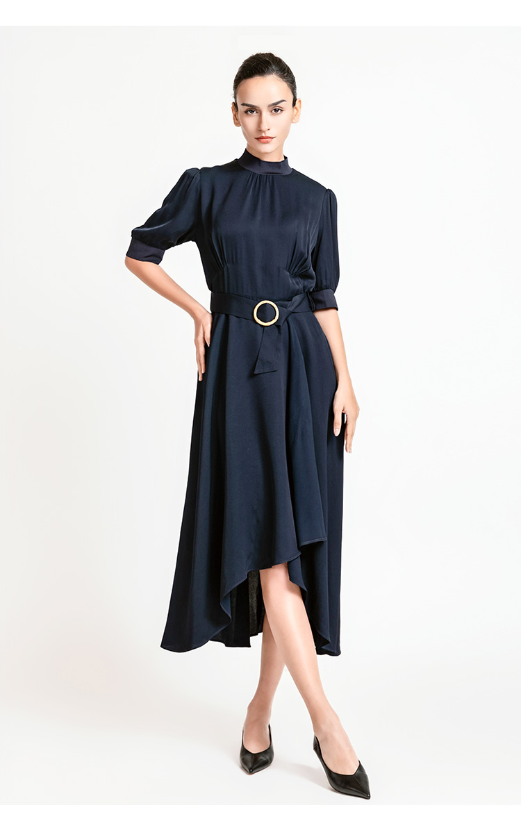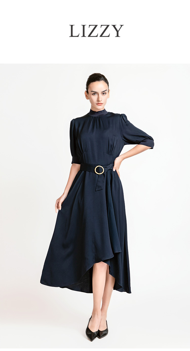 LIZZY优雅通勤收腰短袖飘逸不规则大摆连衣裙配腰带7961