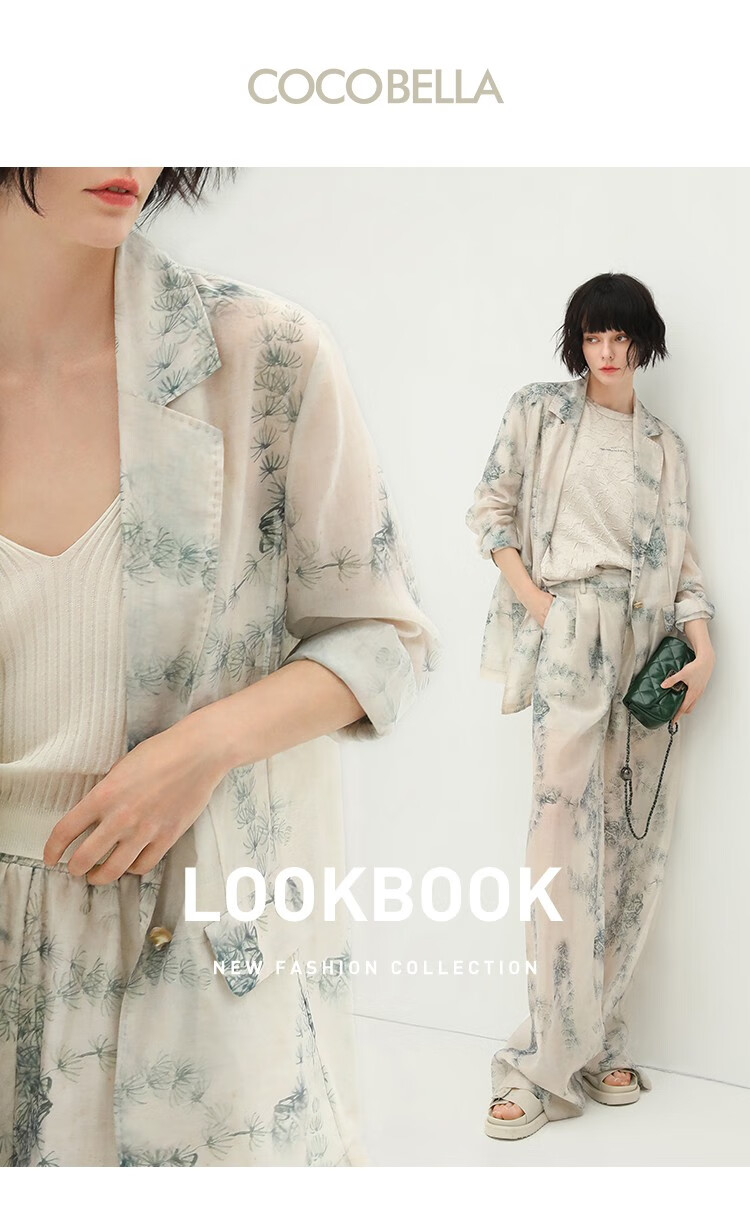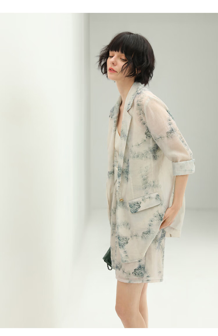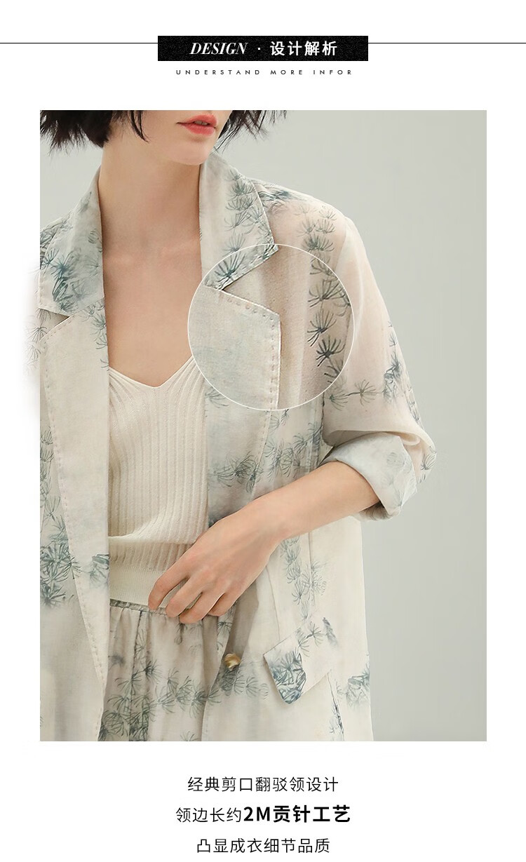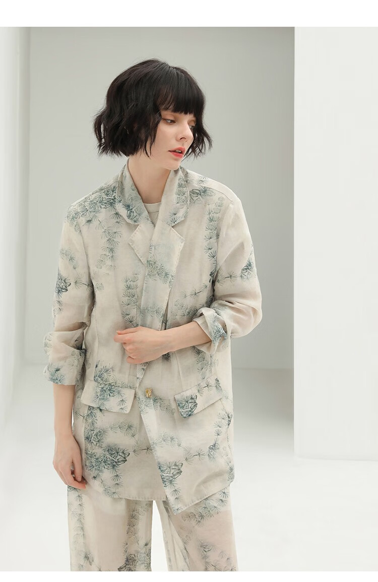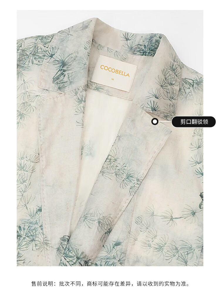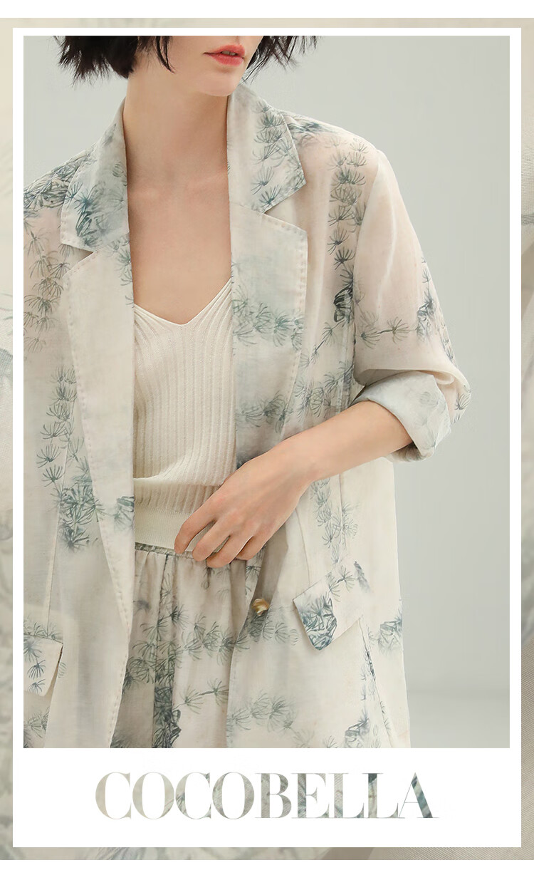 COCOBELLA国风写意印花新中式贡针西装莱赛尔微透视外套SI532