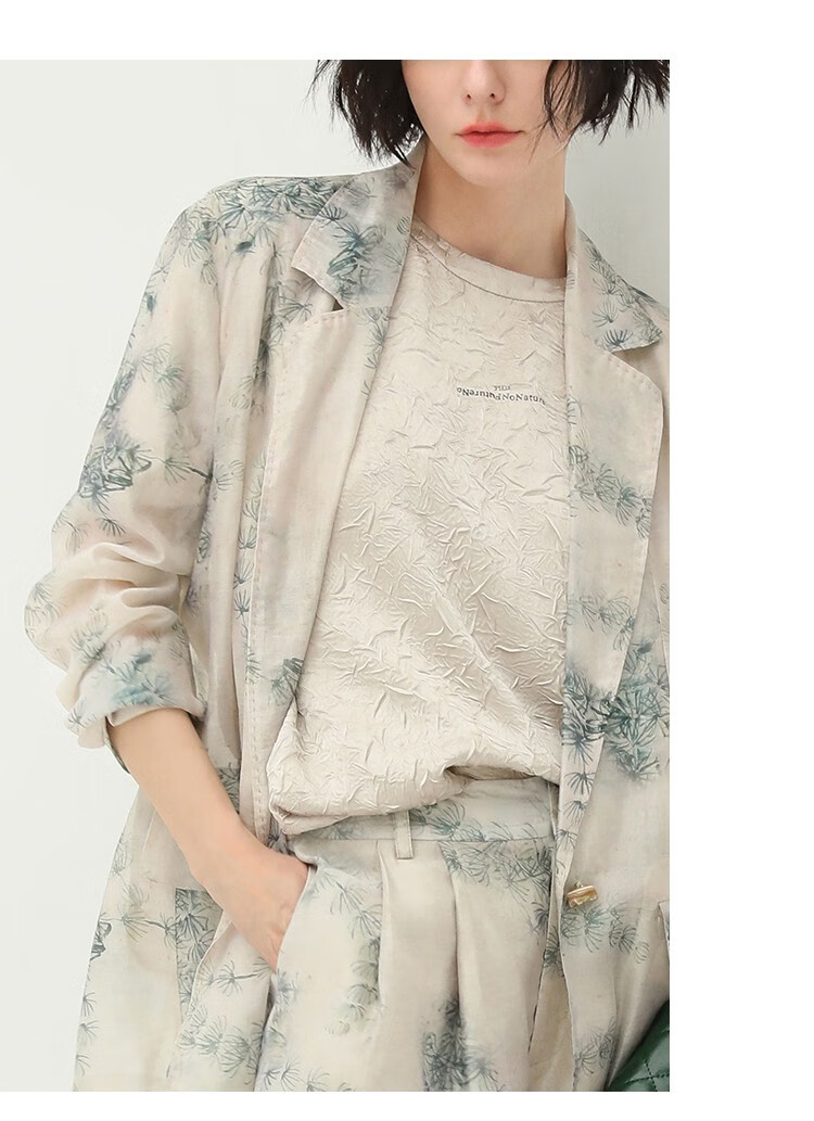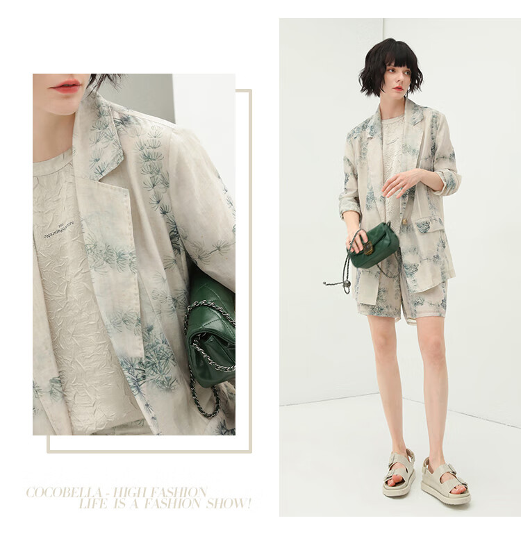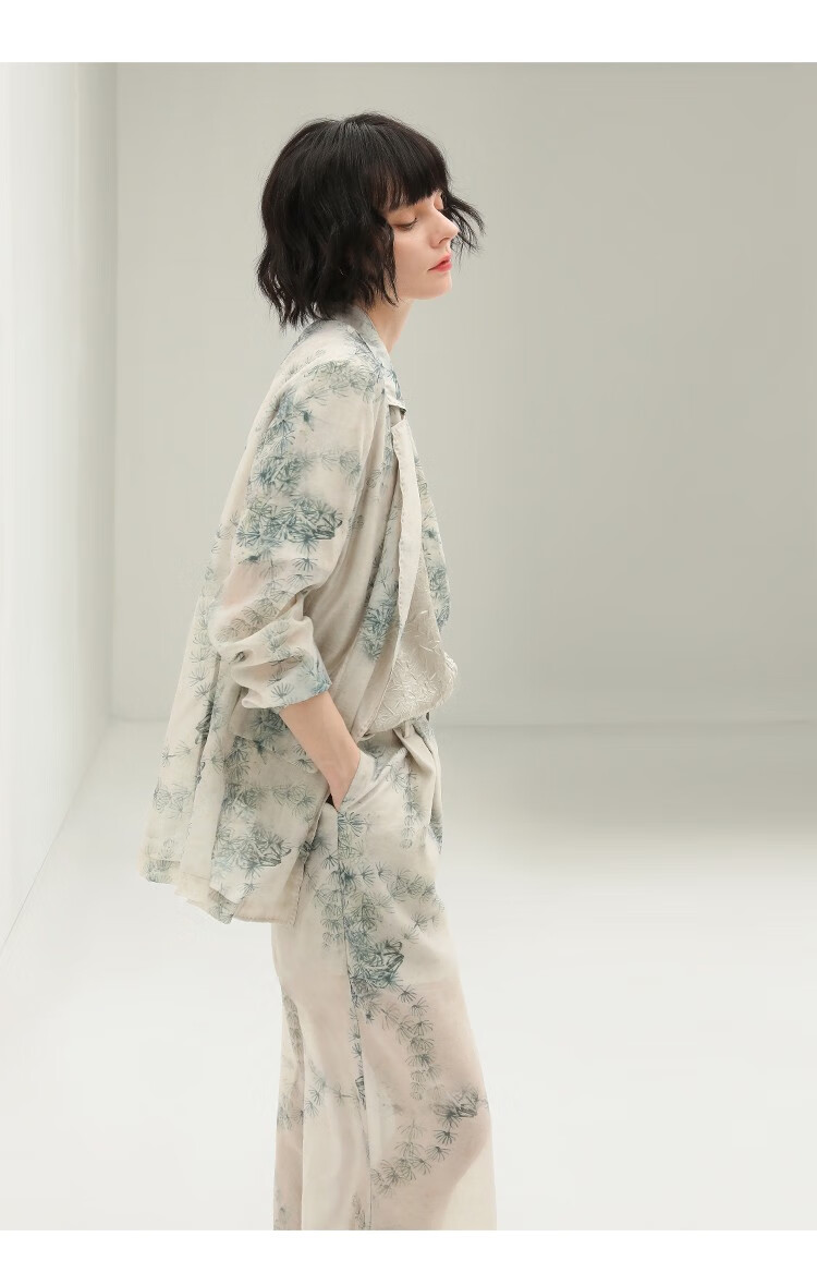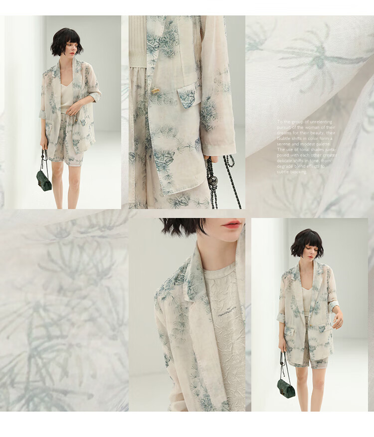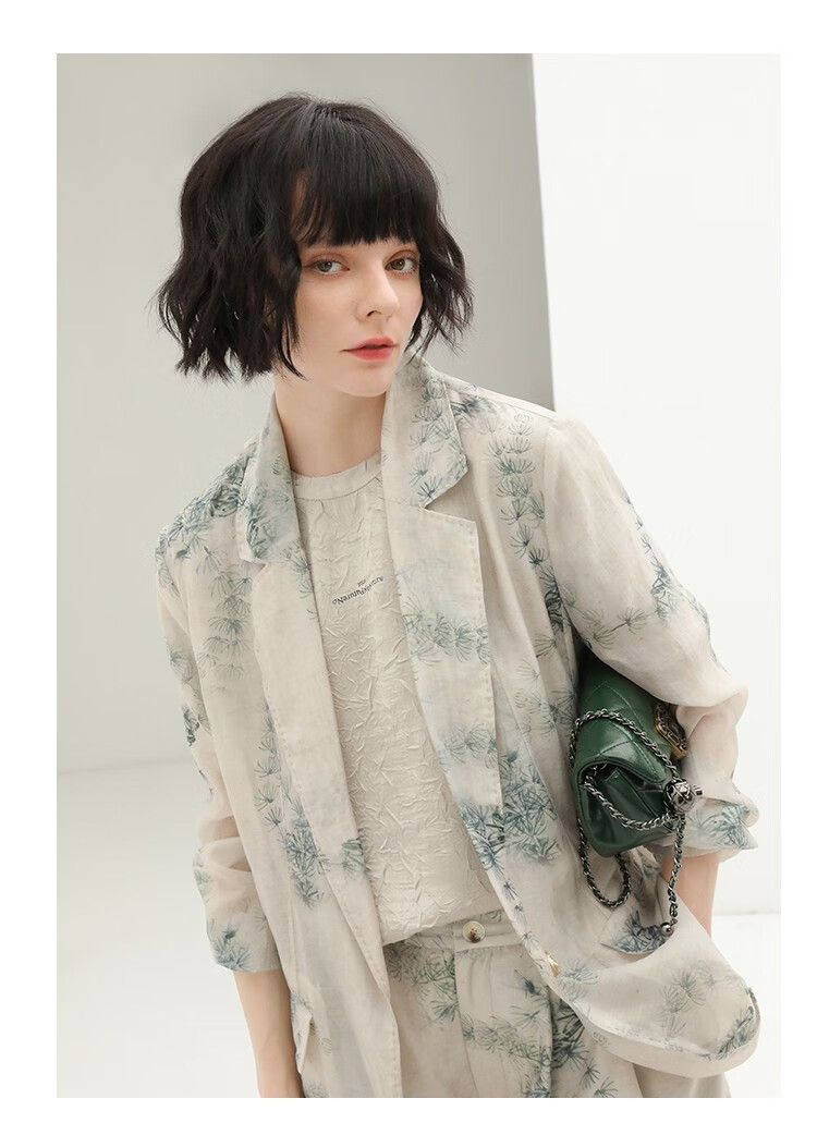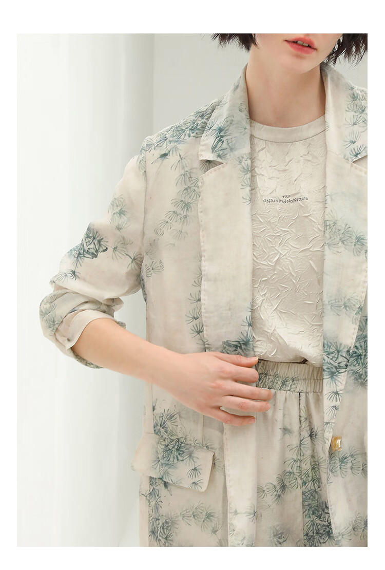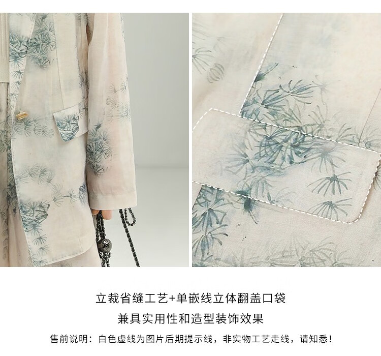 COCOBELLA国风写意印花新中式贡针西装莱赛尔微透视外套SI532