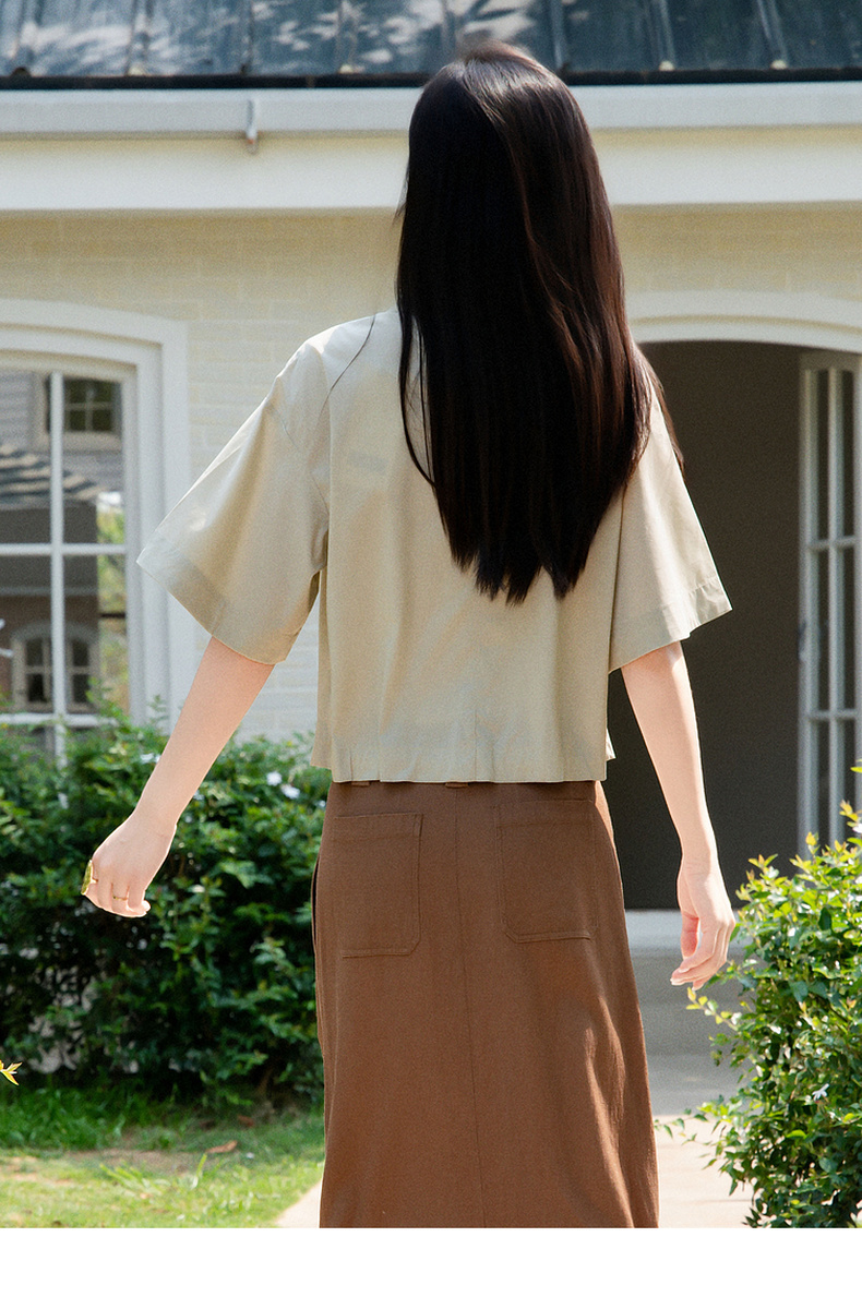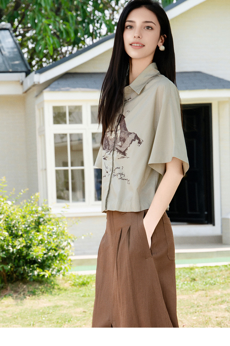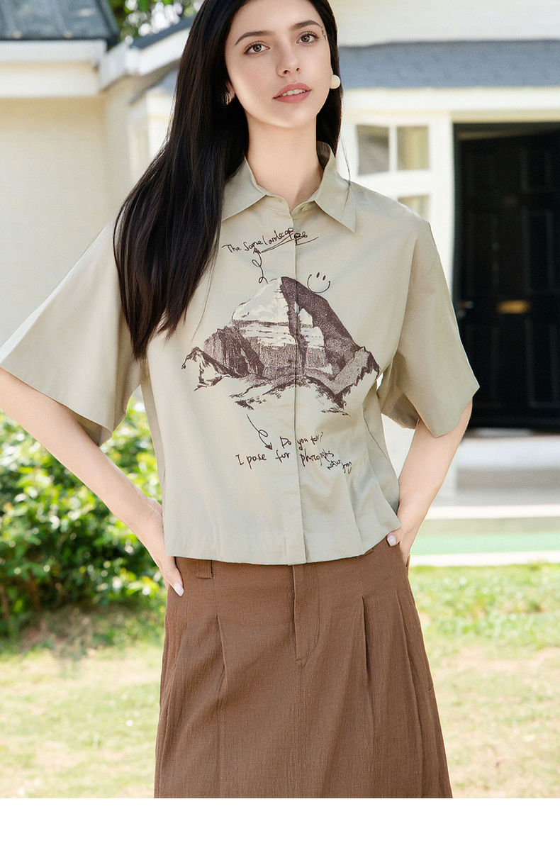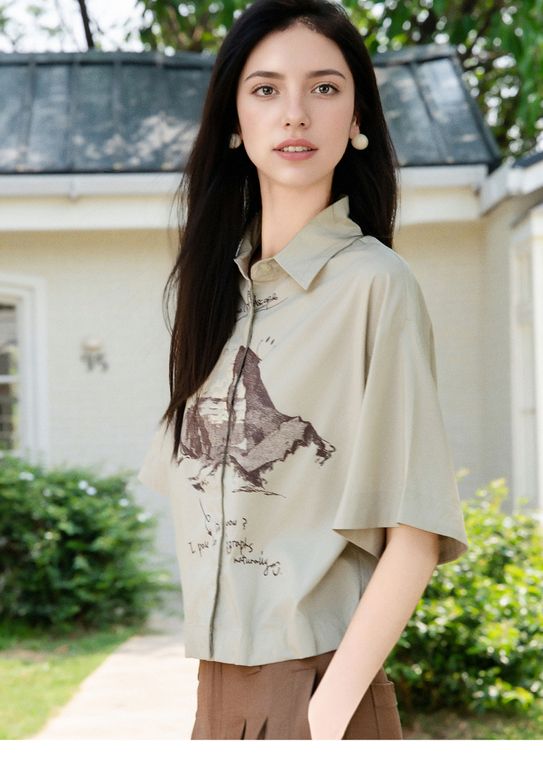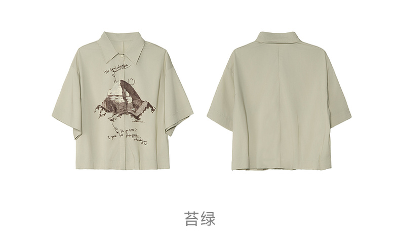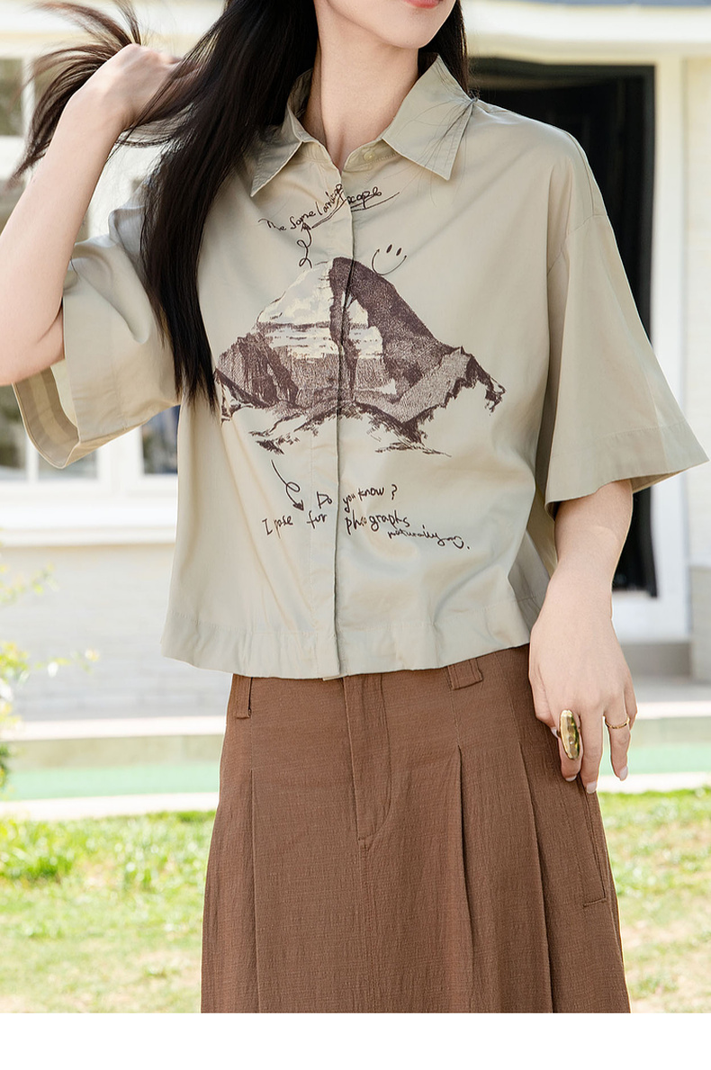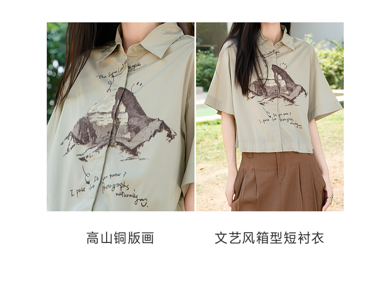 谜底大廓形印花衬衫短袖女2025夏季新款下摆可收缩衬衣256MC6209