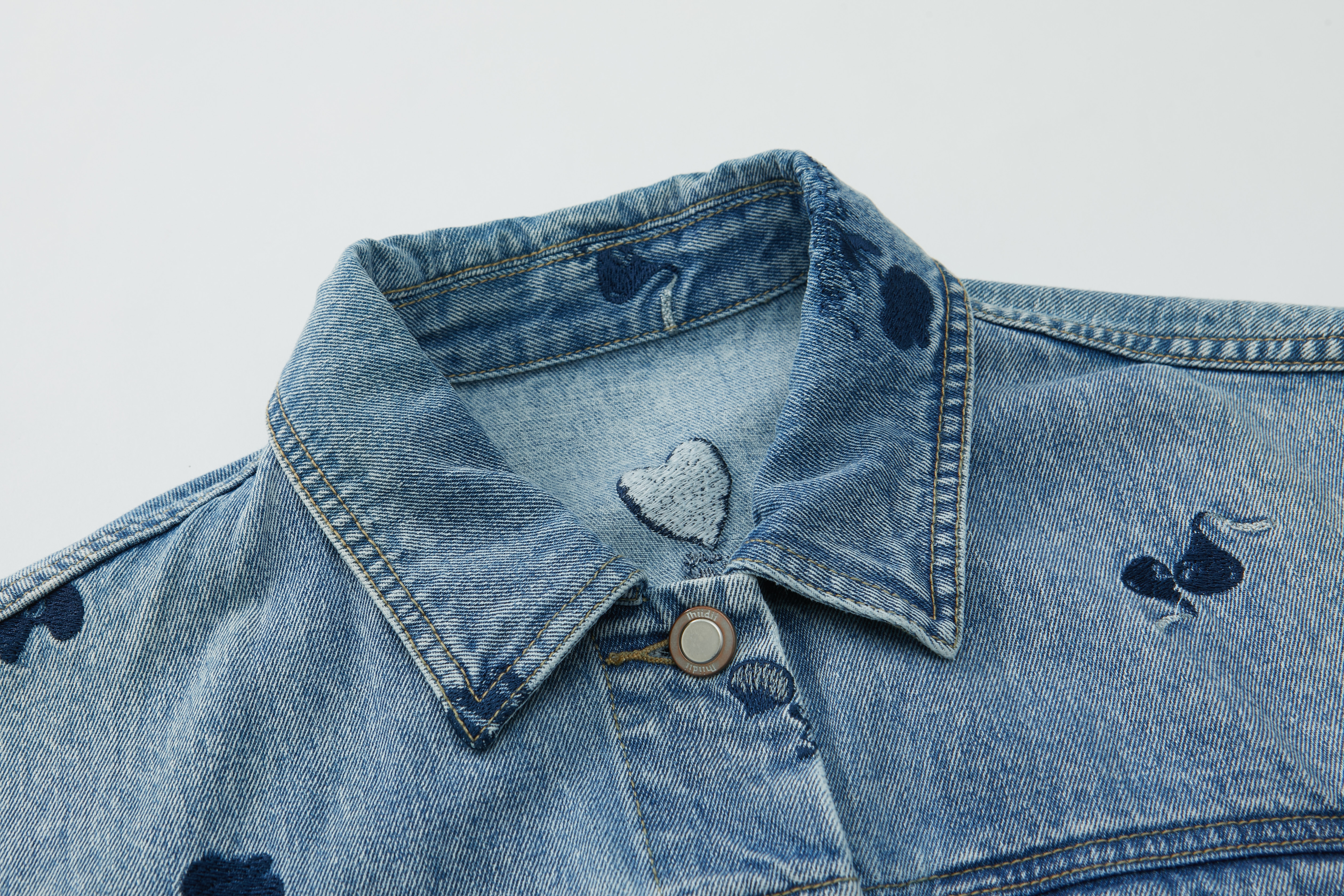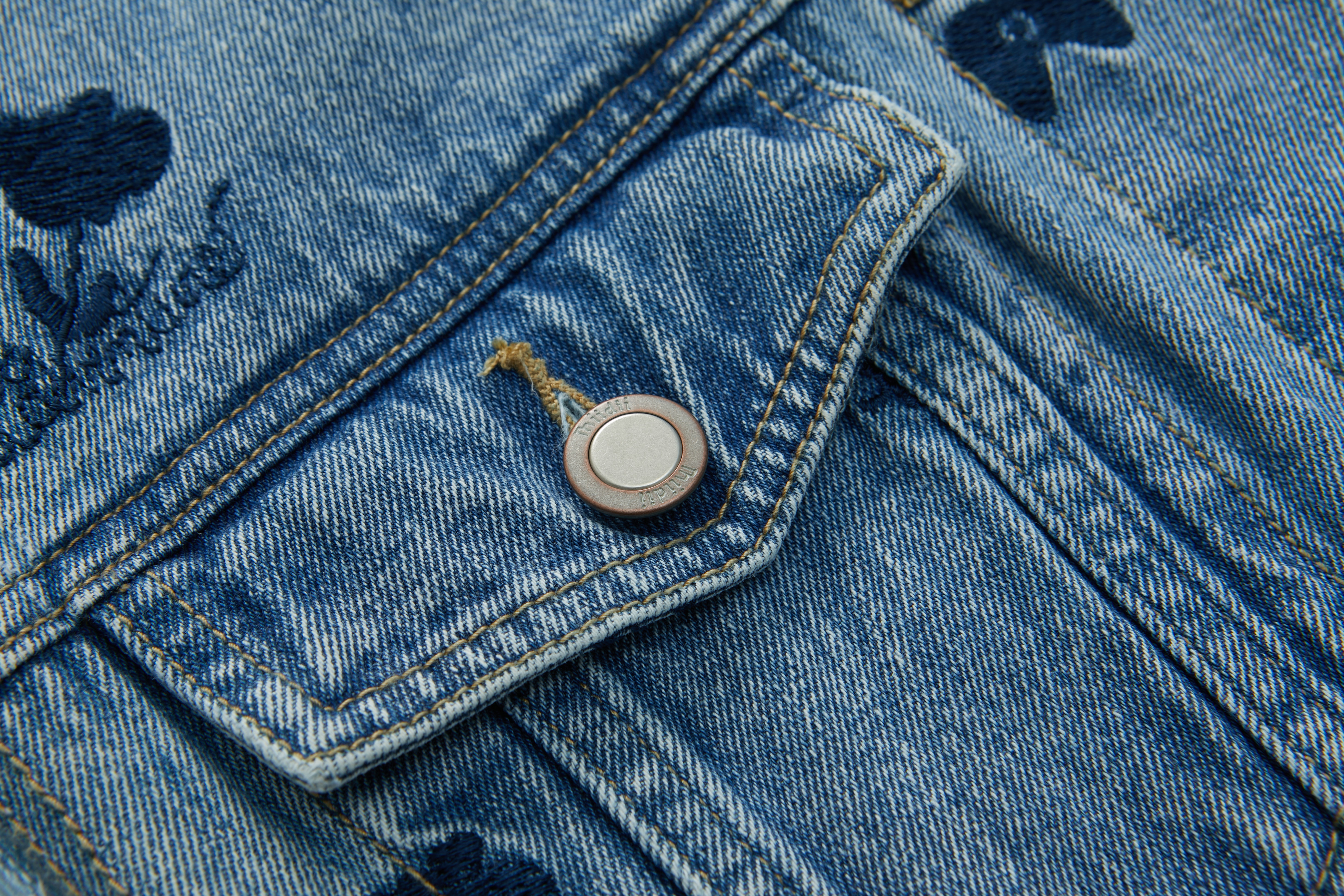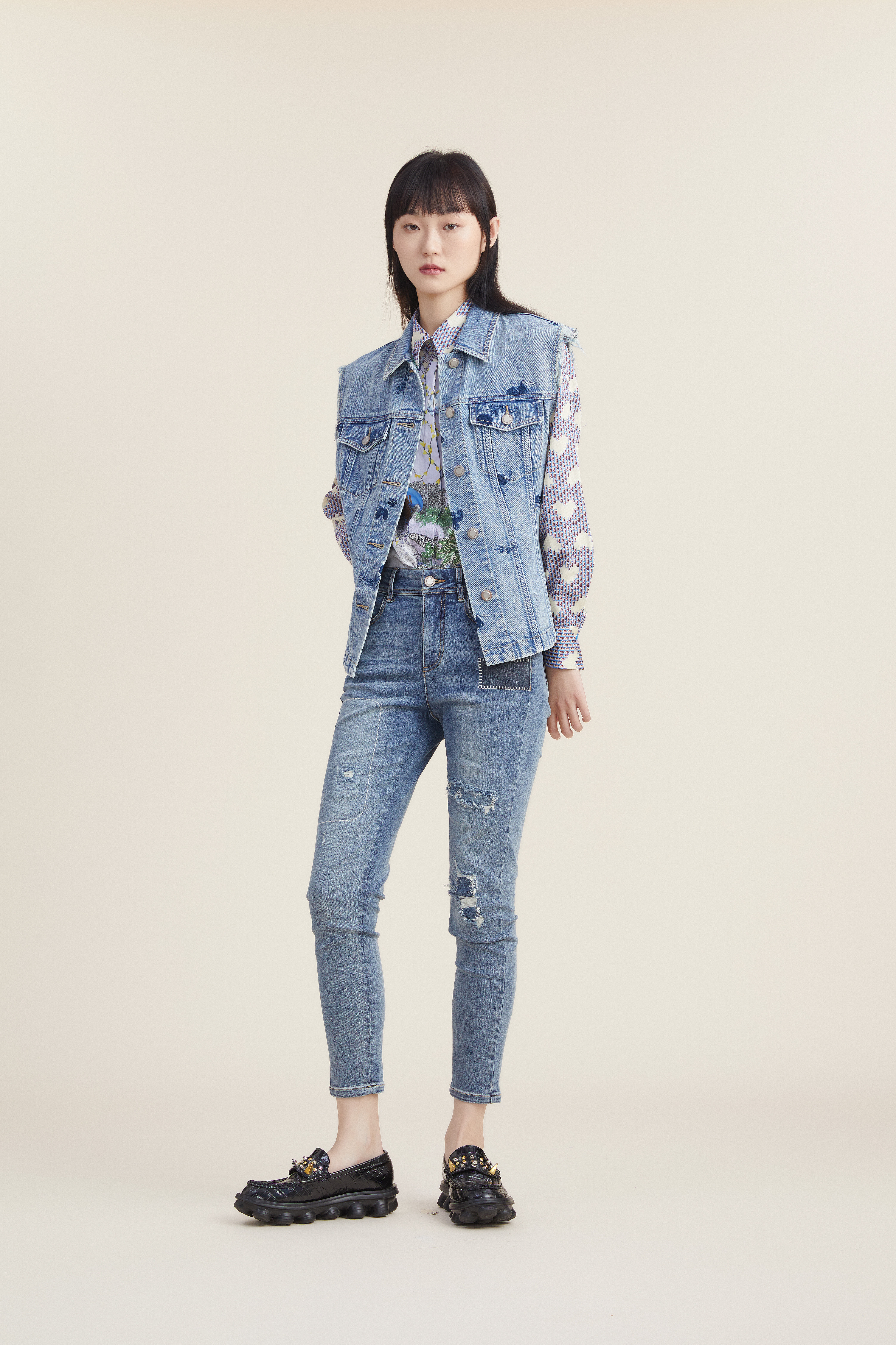 谜底2022秋新款衬衫翻领水洗做旧图案刺绣牛仔马甲女223MM1169