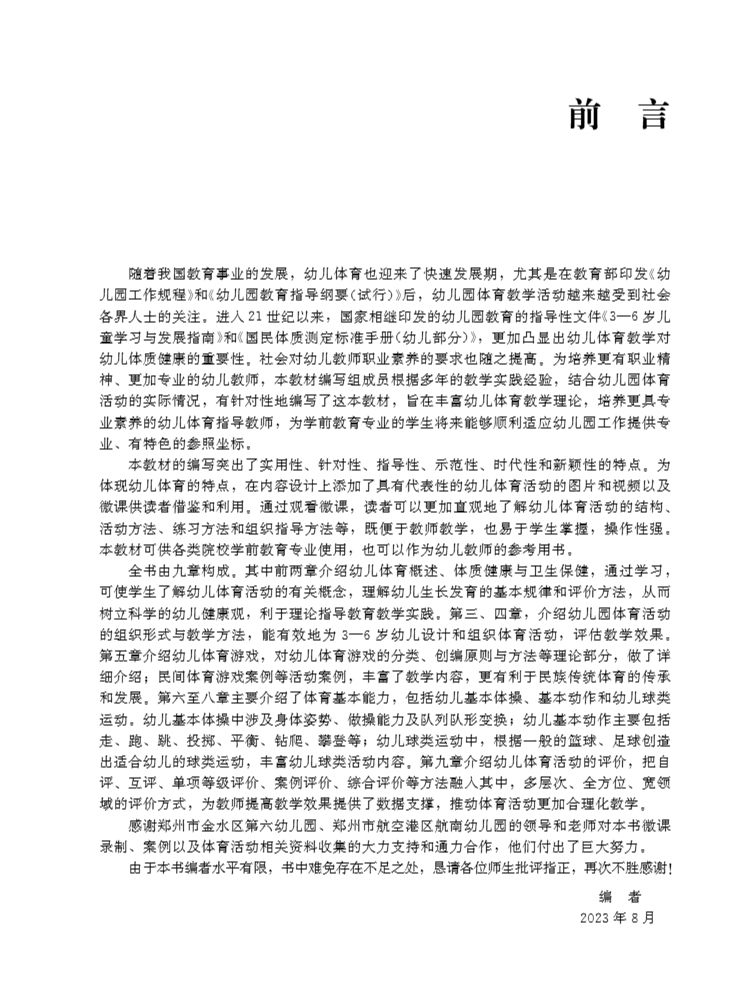 《学前体育基础教程》由九章构成。其中前两章介绍幼儿体育概述、体质健康与卫生保健,通过学习,可使学生了解幼儿体育活动的有关概念,理解幼儿生长发育的基本规律和评价方法,从而树立科学的幼儿健康观,利于理论指导教育教学实践。第三、四章,介绍幼儿园体育活动的组织形式与教学方法,能有效地为3—6岁幼儿设计和组织体育活动,评估教学效果。第五章介绍幼儿体育游戏,对幼儿体育游戏的分类、创编原则与方法等理论部分,做了详细介绍;民间体育游戏案例等活动案例,丰富了教学内容,更有利于民族传统体育的传承和发展。第六至八章主要介绍了体育基本能力,包括幼儿基本体操、基本动作和幼儿球类运动。幼儿基本体操中涉及身体姿势、做操能力及队列队形变换;幼儿基本动作主要包括走、跑、跳、投掷、平衡、钻爬、攀登等;幼儿球类运动中,根据一般的篮球、足球创造出适合幼儿的球类运动,丰富幼儿球类活动内容。第九章介绍幼儿体育活动的评价,把自评、互评、单项等级评价、案例评价、综合评价等方法融入其中,多层次、全方位、宽领域的评价方式,为教师提高教学效果提供了数据支撑,推动体育活动更加合理化教学。