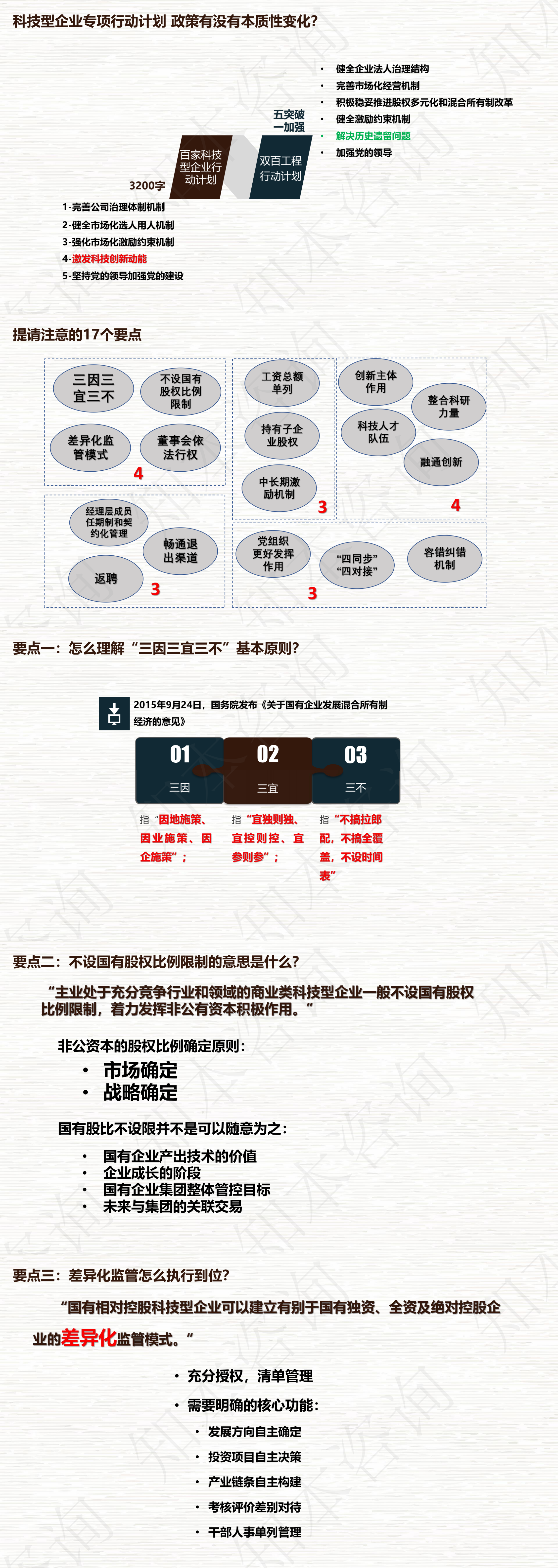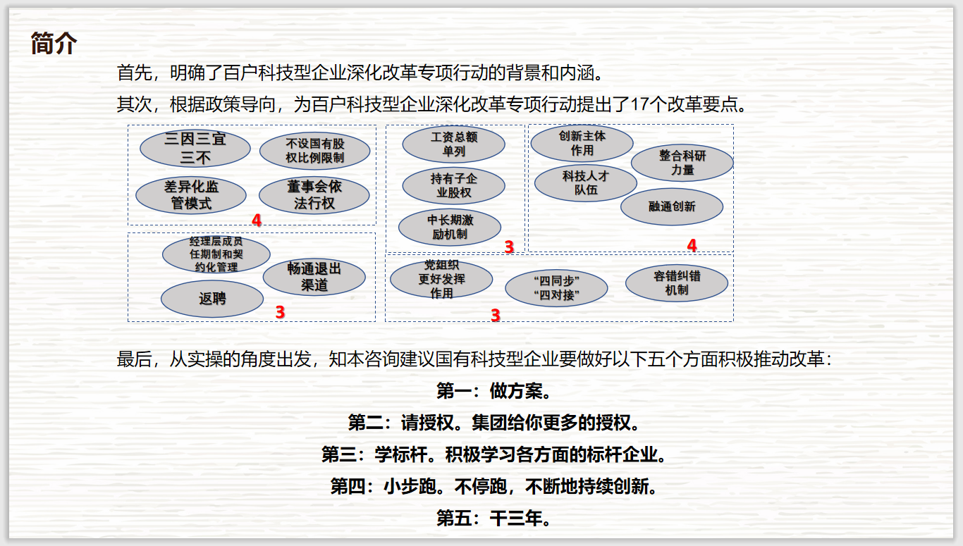 国企改革方法论 主要是在相关政策研究的基础上,结合典型案例,针对国有企业改革过程中存在的方方面的问题,提炼而出的具有实操性、系统性的解决方案。知本咨询国企改革方法论,聚焦于 混改和股权多元化、干部机制、三项制度、国企创新、两类公司、中长期激励、管控与治理优化、对标世界一流、国有企业产业整合和重组 等不同领域,为国有企业提供可快速落地的改革模型、改革路径、改革举措等,帮助国有企业早日实现改革目标。