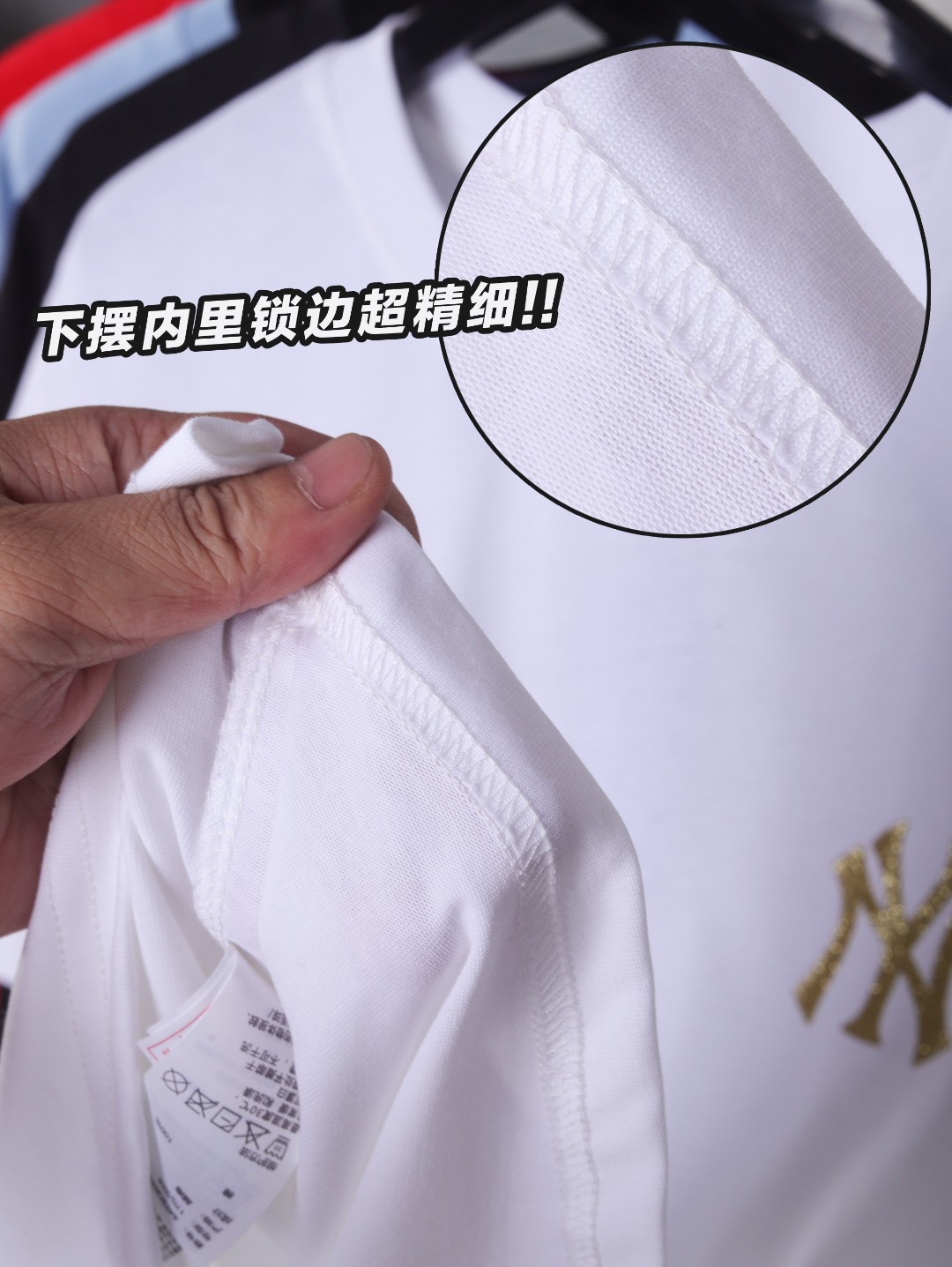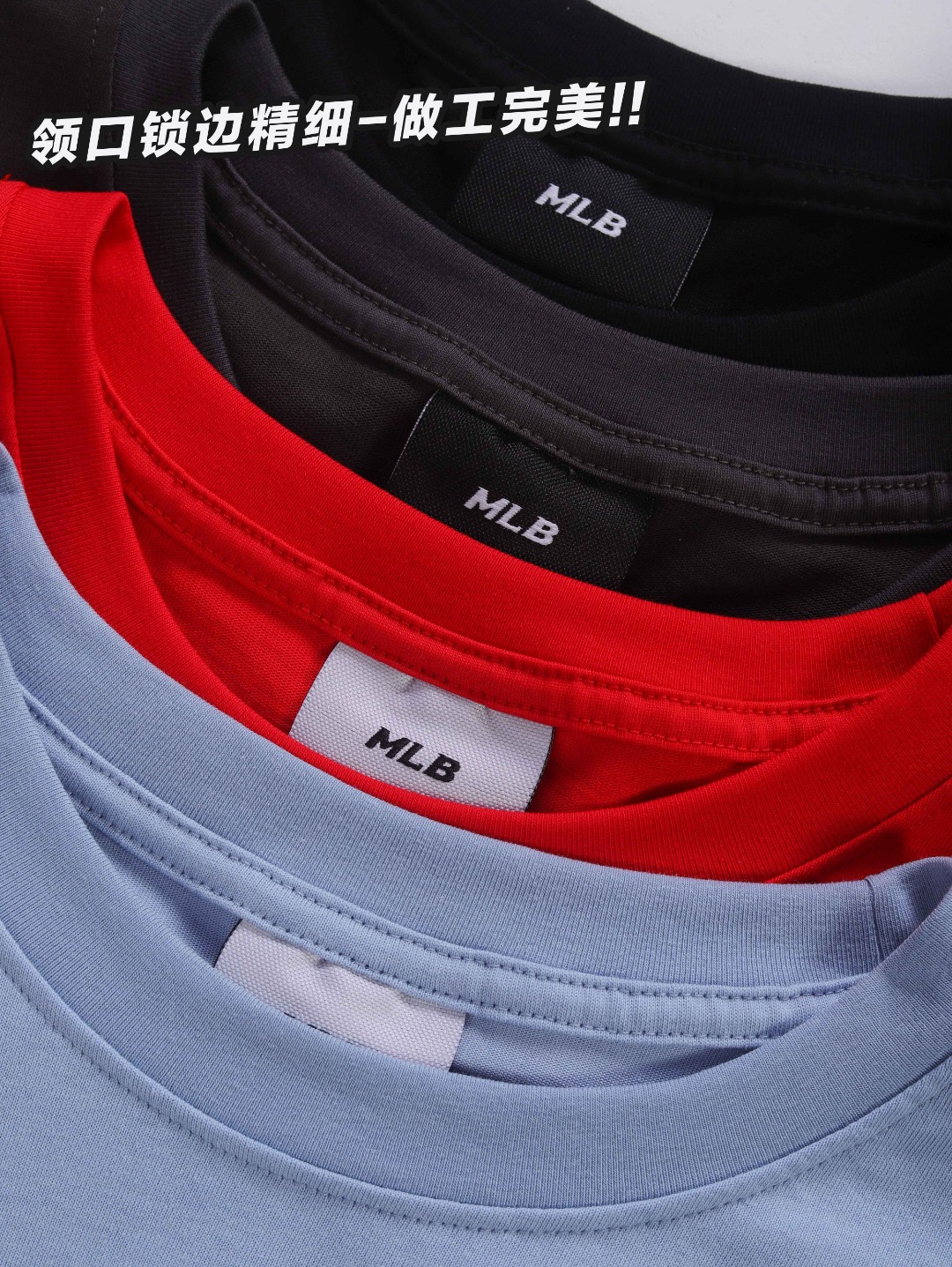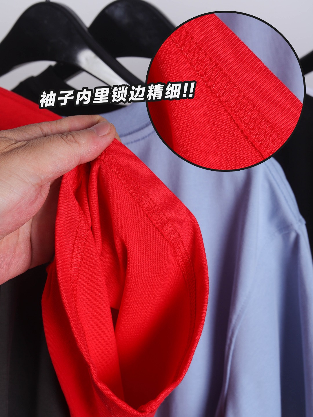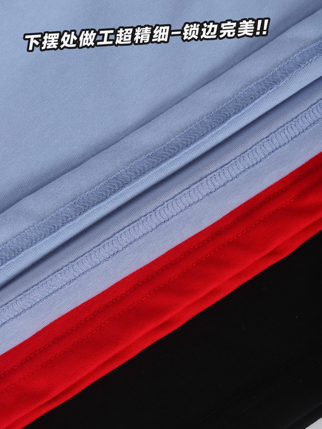 领口采用高密度螺纹面料+三本针加固工艺