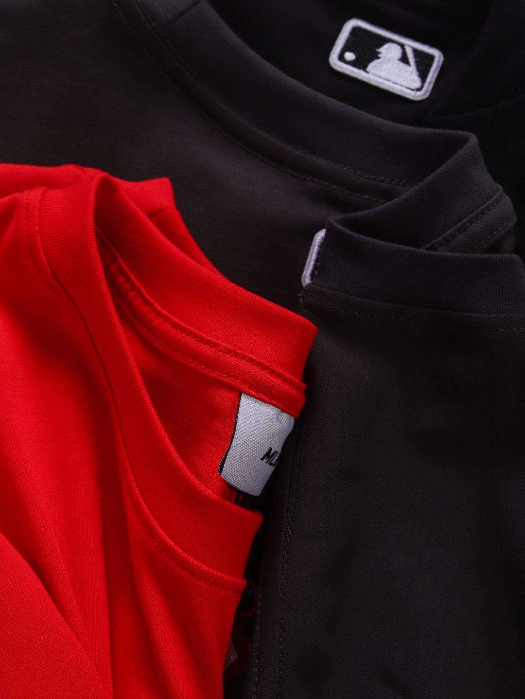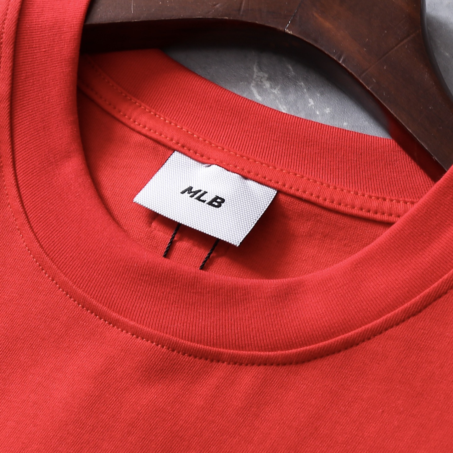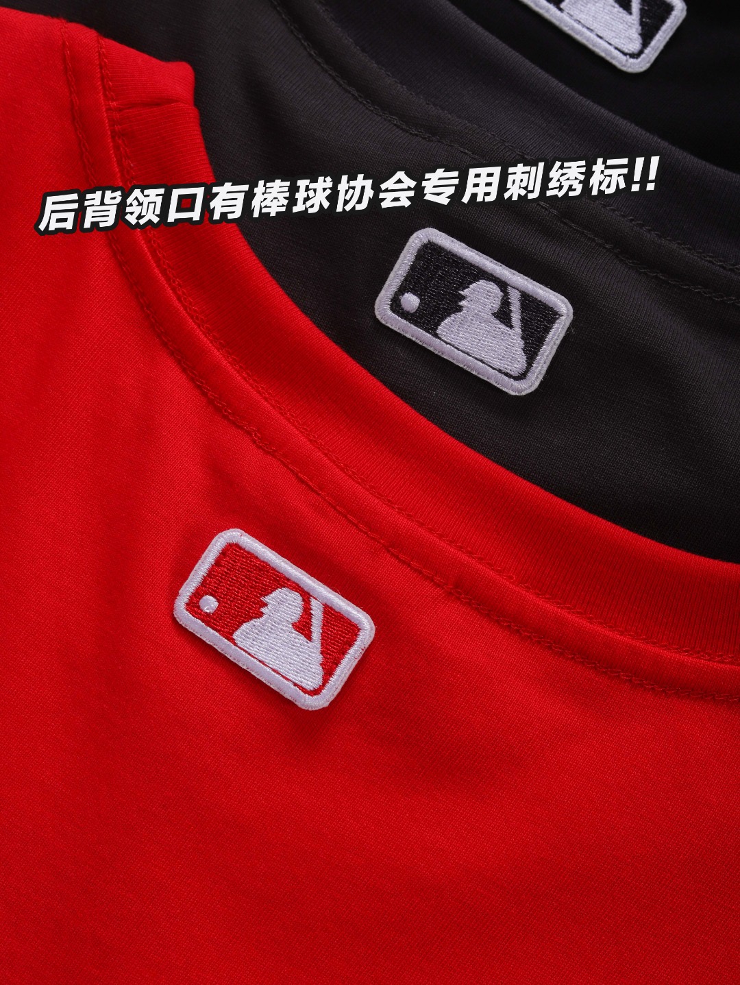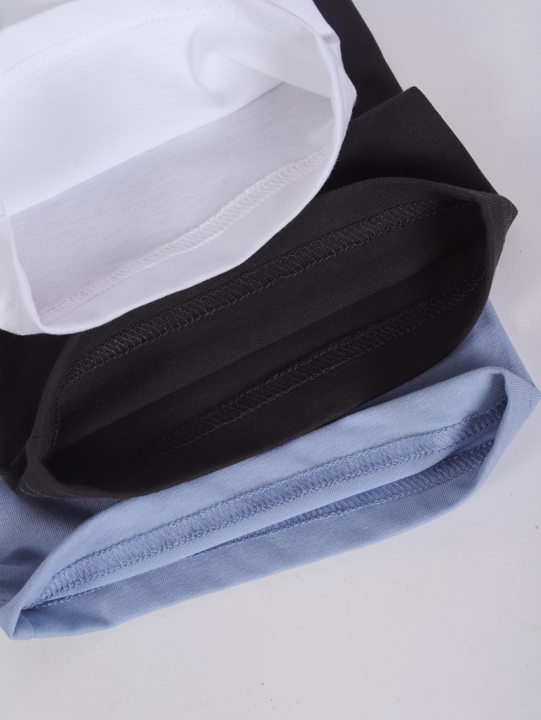 领口采用高密度螺纹面料+三本针加固工艺