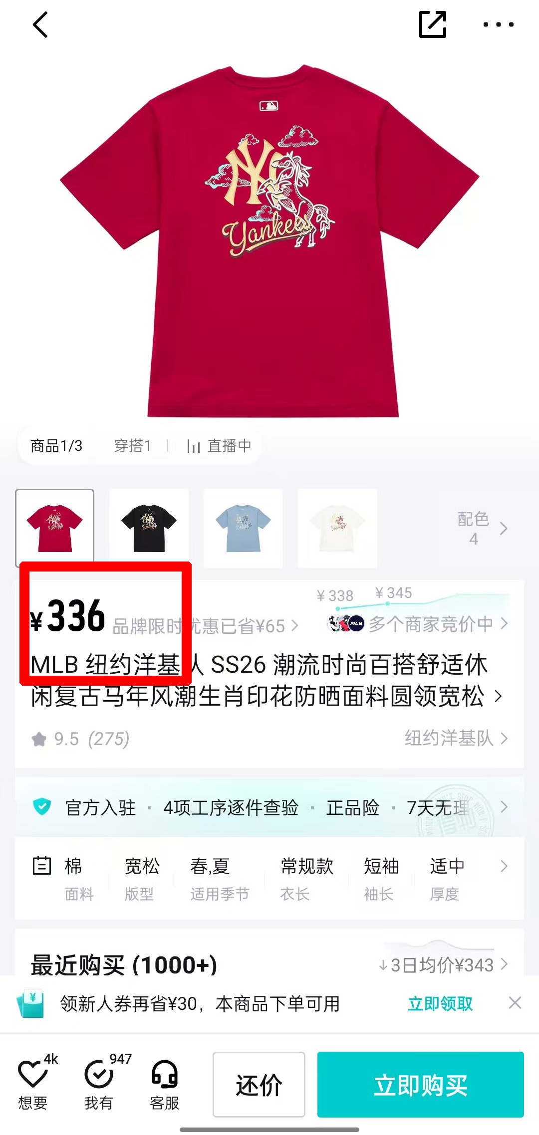 💰109元包邮, 【正品授权】 MLB招财小马 ,限定款 情侣印花T恤