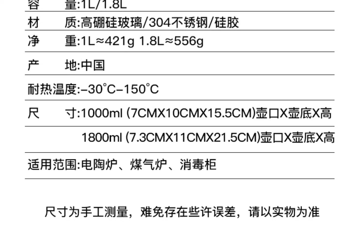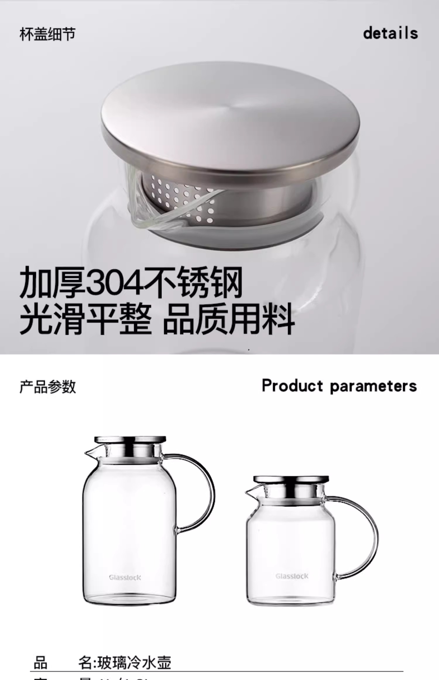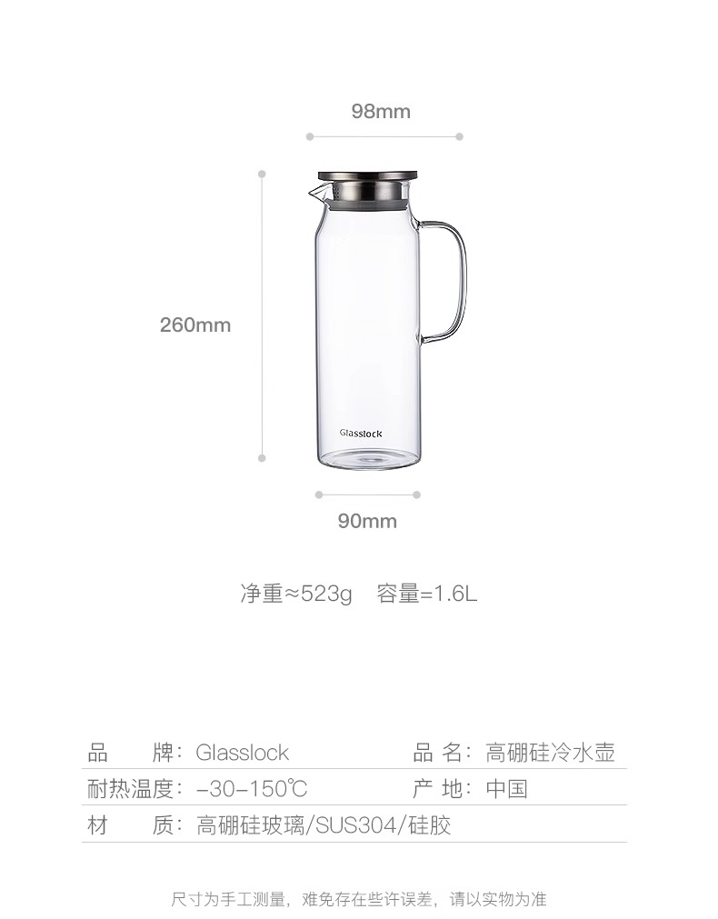 Glasslock耐高温通透玻璃冷水壶家用大容量凉白开水壶果汁壶泡茶1.6L/1.8L