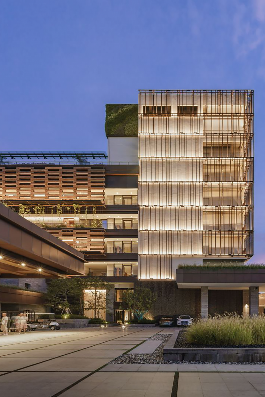 在外立面玻璃和室内灯光的叠加下,夜色下的酒店氤氲出柔和的光辉,仿佛是轻盈梦幻的艺术装置。