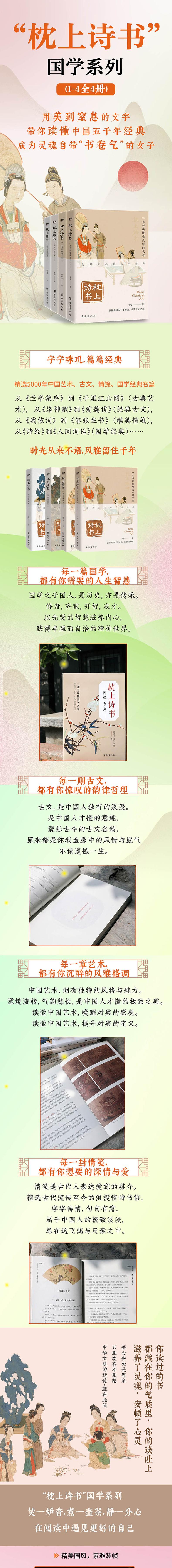 《枕上诗书:一本书读懂唯美中国艺术艺术》 中国艺术,拥有独特的风格与魅力。 风雅千年,意蕴悠长,是中国人才懂的很好之美。 读懂中国艺术,是中国人的美学必修课。 读懂中国艺术,才能读懂中国人的美。 《枕上诗书:一本书读懂经典古文》 古文,是中国人独有的浪漫。 是中国人才懂的风情,是中华文明智慧的传承。 本书精选从夏商到晚清的经典古文篇章, 一生一定要读一次。 《枕上诗书:一本书读懂唯美情笺》 情笺是古代人表达爱意的媒介。 本书精选古代Zui浪漫的情诗书信,字字传情,句句有意,美得让人心醉。 《枕上诗书:一本书读懂经典国学》 国学之于国人,是传承,是智慧。能修身,齐家,开智,成才。 学习和了解国学,有助于丰富和提升我们的精神生命,使我们获得安身立命的精神家园。