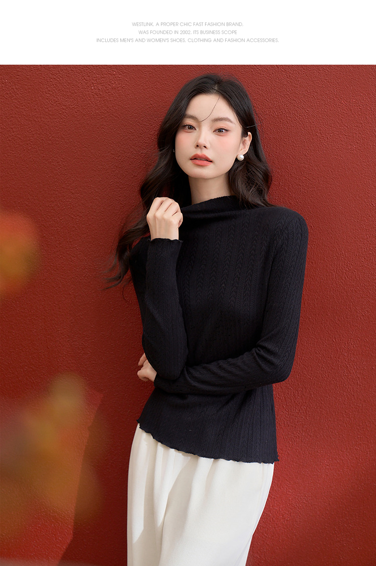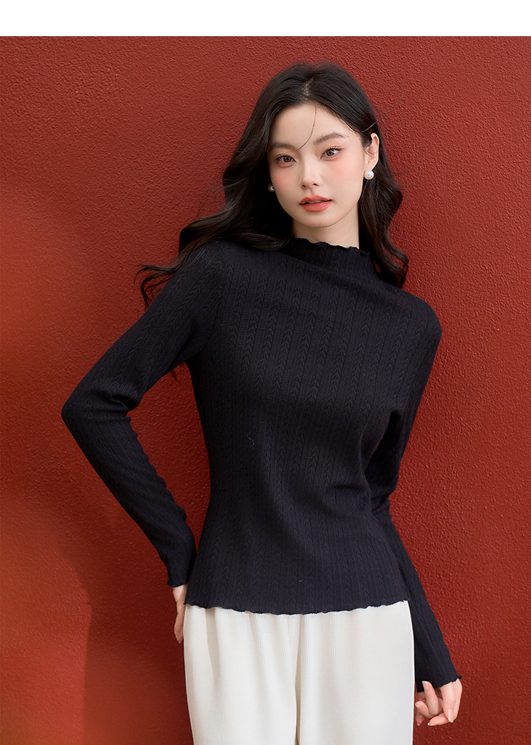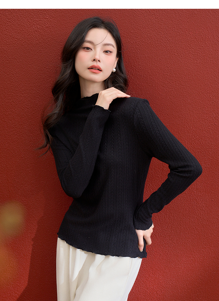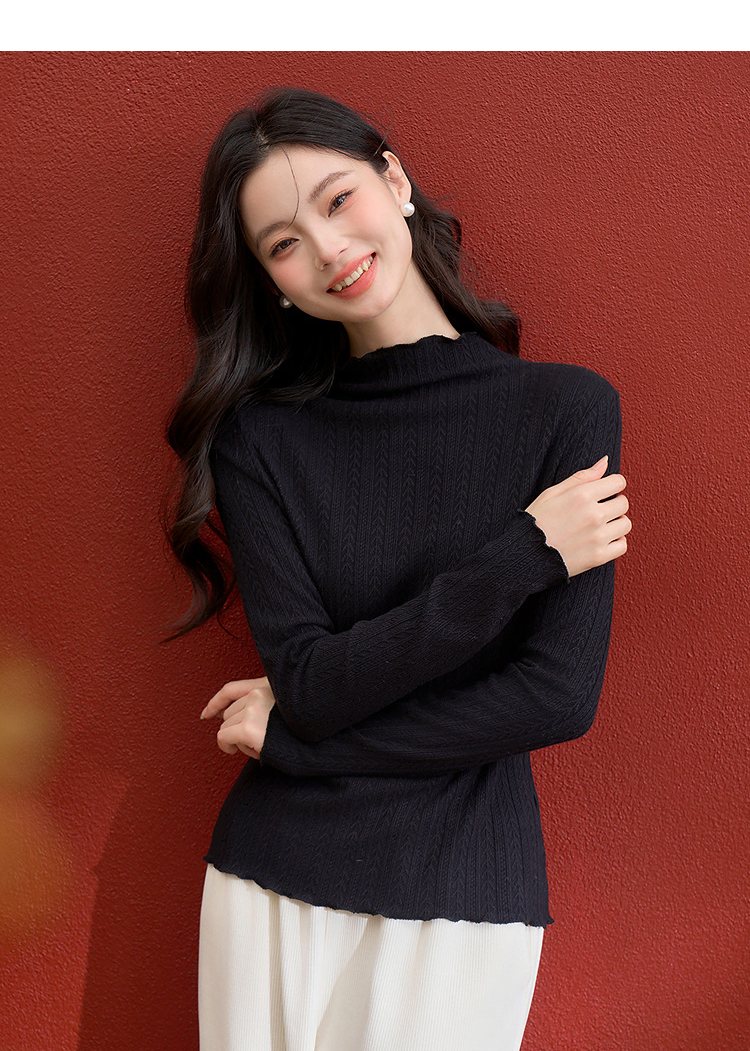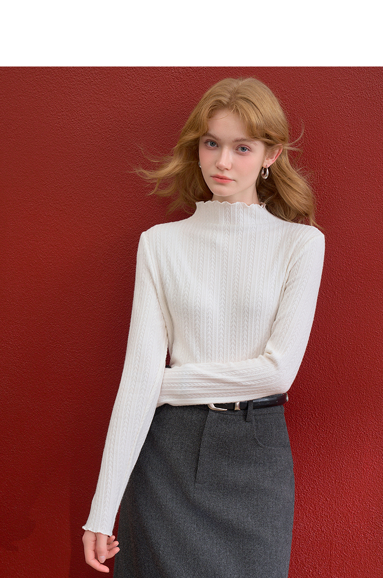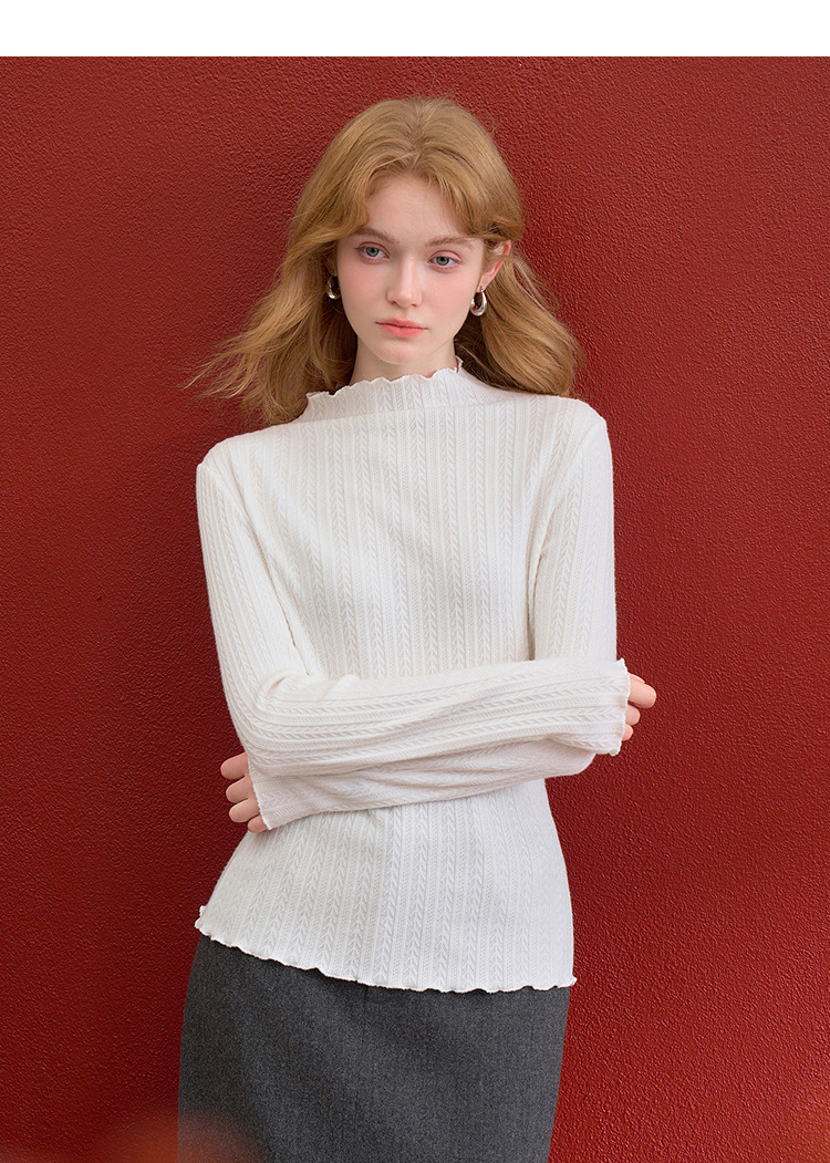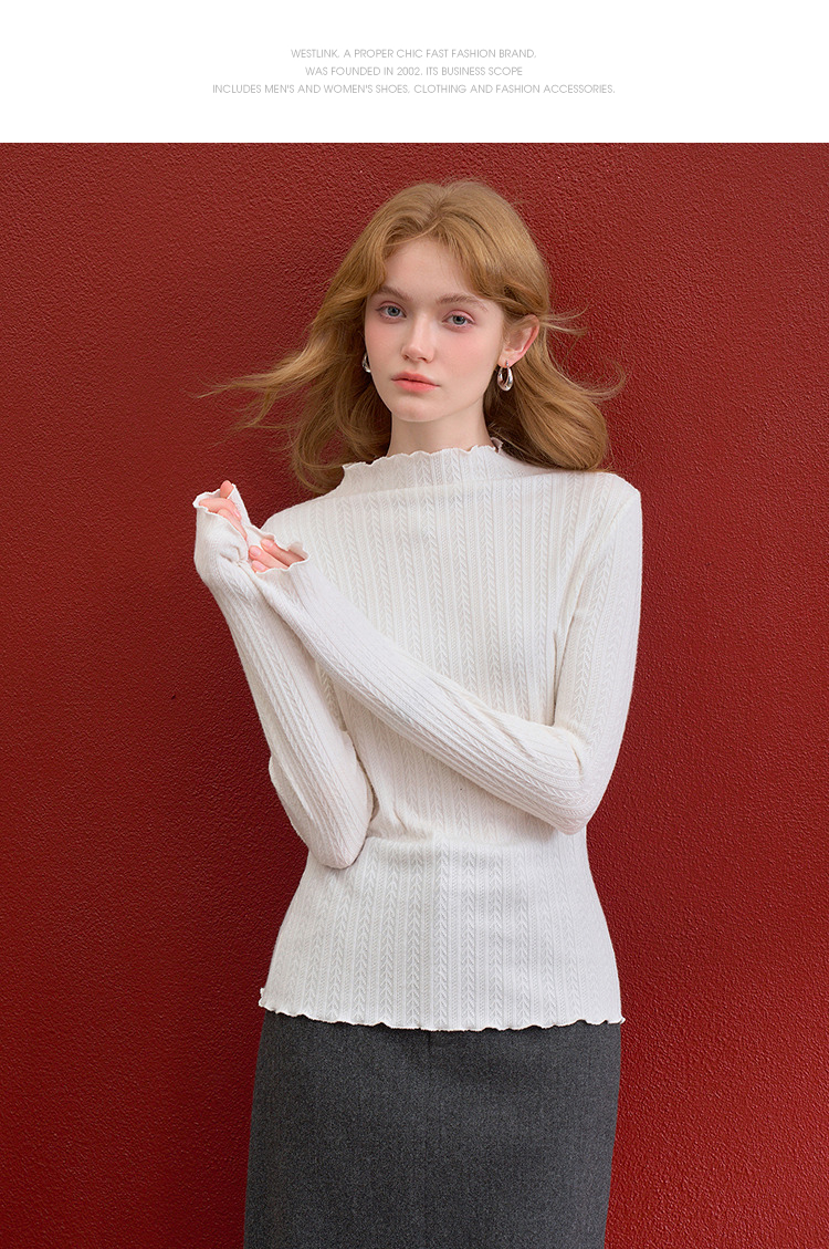 西遇木耳边半高领长袖T恤女冬季新款麦穗纹亲肤内搭针织衫V3955363