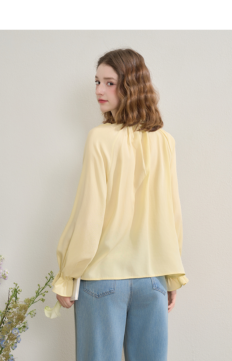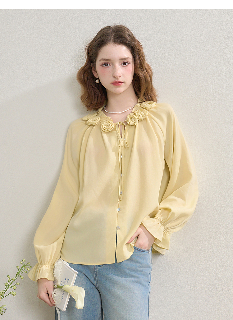 西遇绝美立体花朵圆领系带衬衫女秋季甜美荷叶边长袖衬衣V2551106