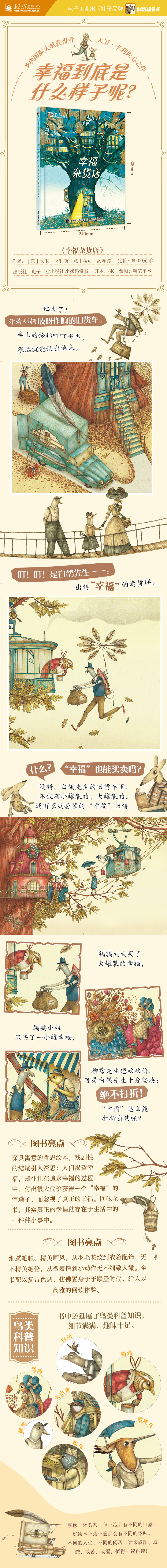 他来了,开着那辆吱呀作响的旧货车。车上的铃铛叮叮当当,很远就能认出他来。叮!叮!是白鸽先生——出售“幸福”的卖货郎。什么?幸福也能买卖吗?没错,白鸽先生的旧货车里,不仅有小罐装的、大罐装的,还有家庭套装的“幸福”出售……这是一本深具寓意的哲思绘本,戏剧性的结尾引人深思:人们渴望幸福,却往往在追求幸福的过程中,付出很大代价获得一个“幸福”的空罐子,而忽视了真正的幸福。回味全书,其实真正的幸福就存在于生活中的一件件小事中。