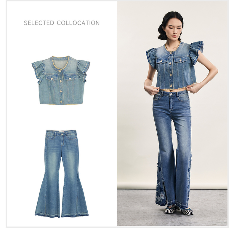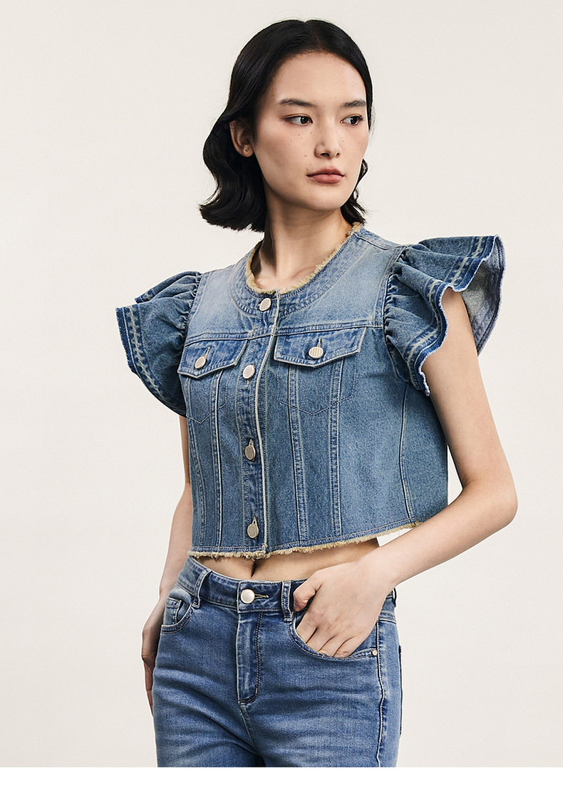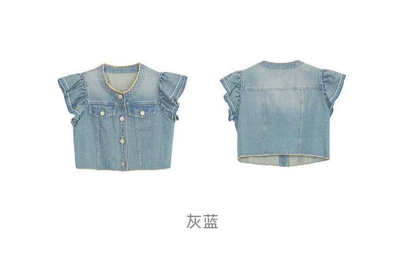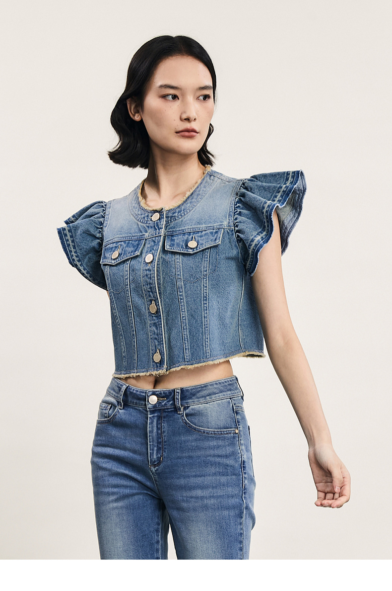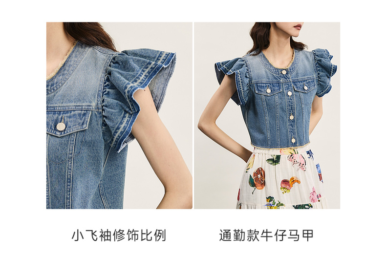 谜底牛仔马甲外套女2024夏新品复古文艺风荷叶袖短上衣242MW0562