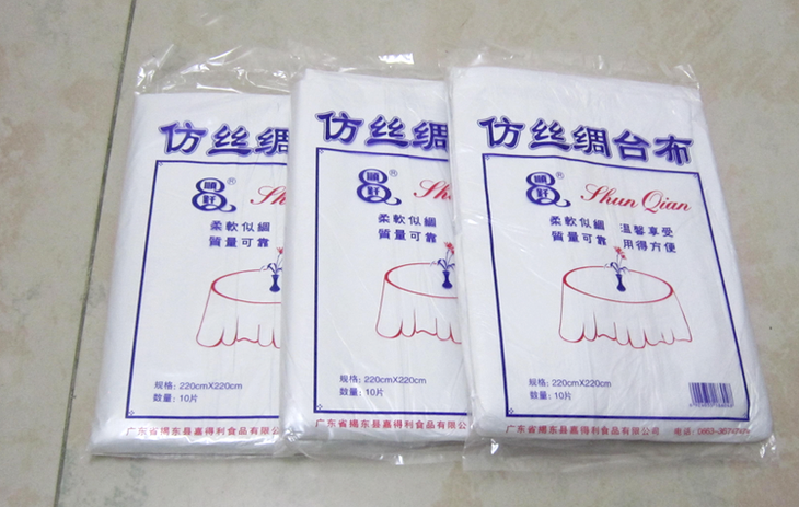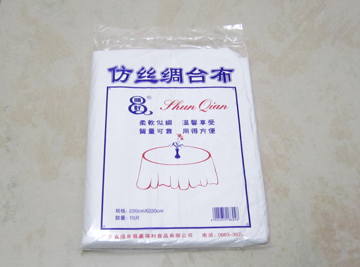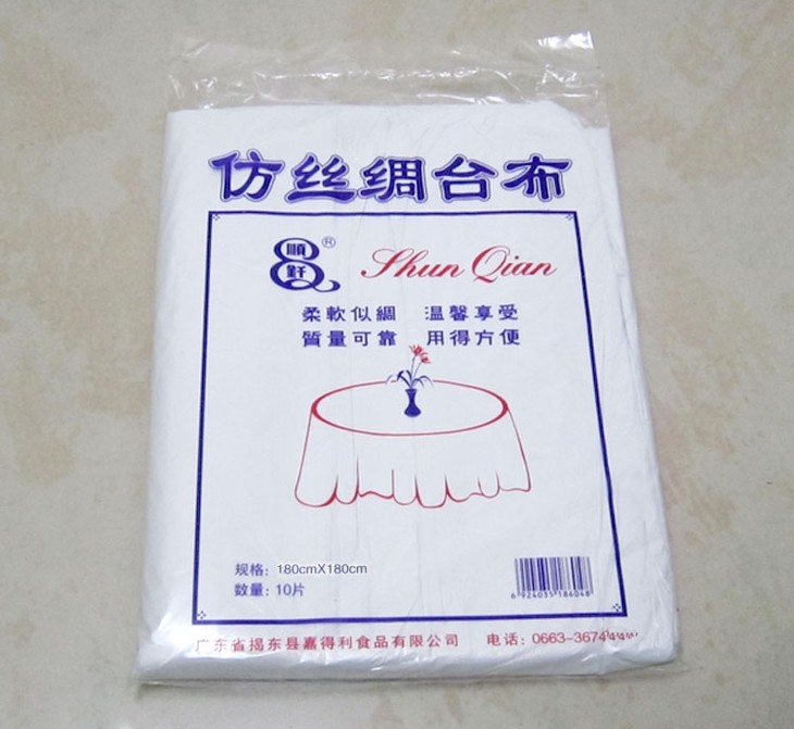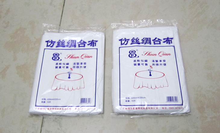 【产品介绍】顺釺牌一次性桌布无毒无味,用于宾馆酒店饭店餐馆、婚庆酒席、家庭宴席、聚会野餐等,免去清洗很方便,免除餐后擦桌子的麻烦。