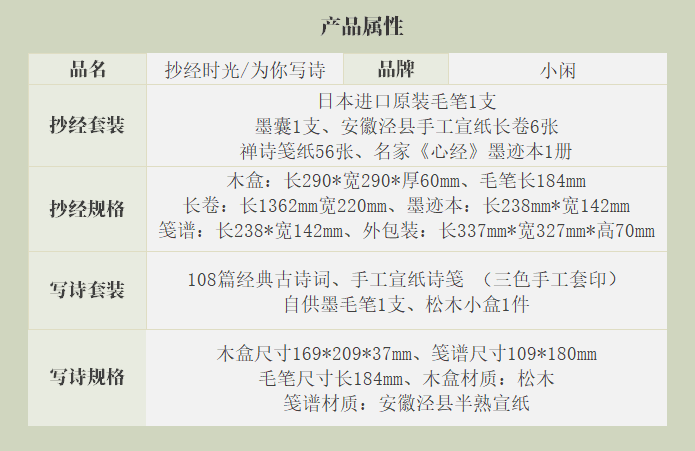 套装内包含:安徽泾县手工宣纸长卷6张、禅诗笺纸56张、名家《心经》墨迹本1个、日本进口原装毛笔、墨囊各1支。