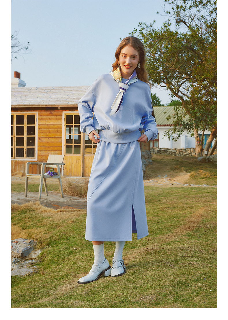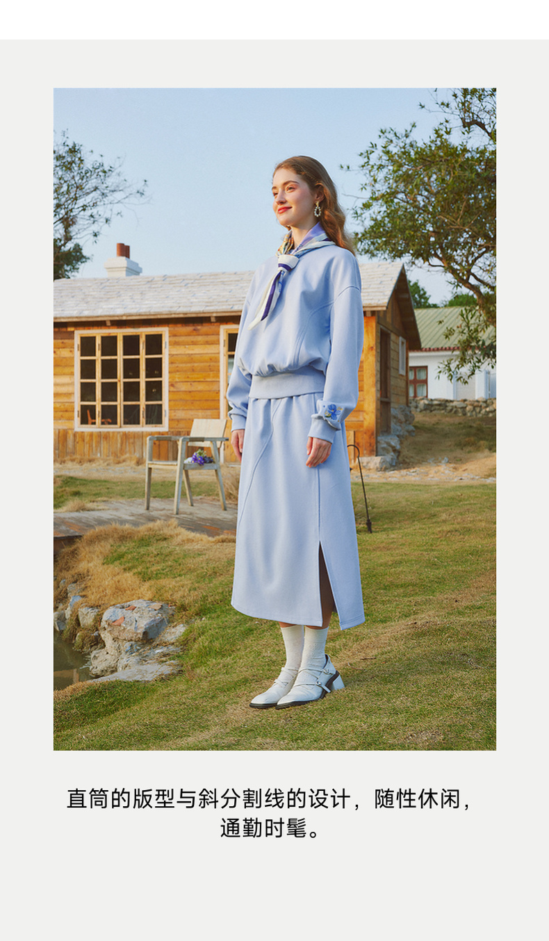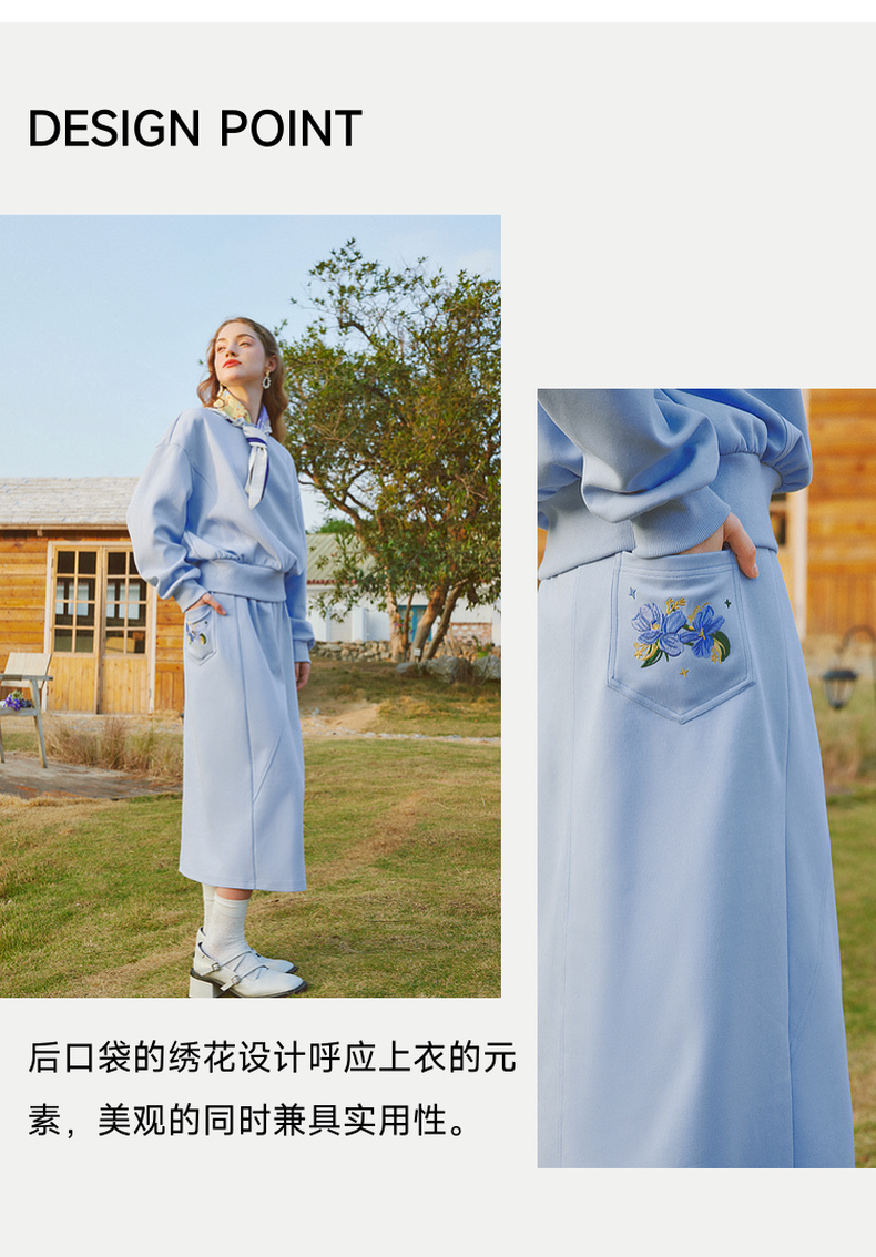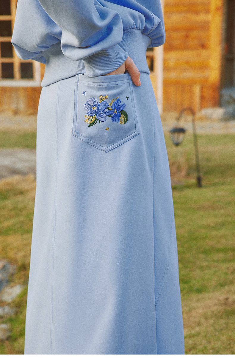 两三事漫想天空2024春季新款简约绣花口袋开叉高腰半身裙长裙