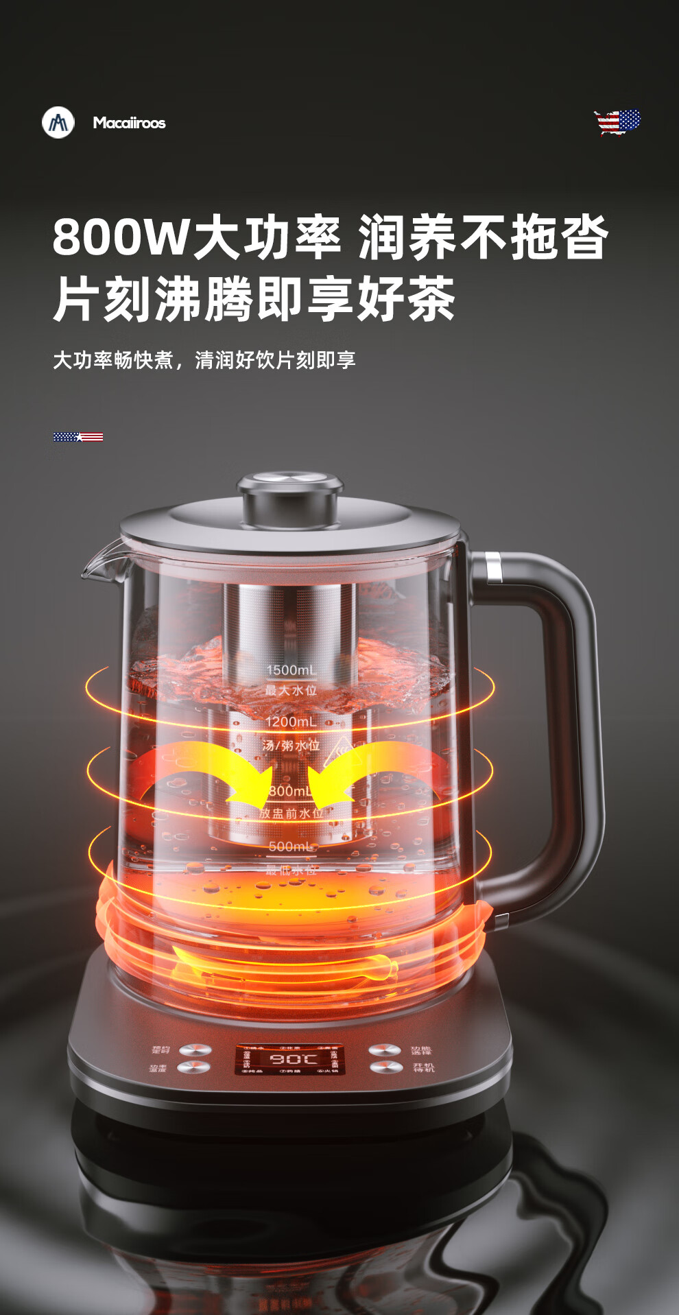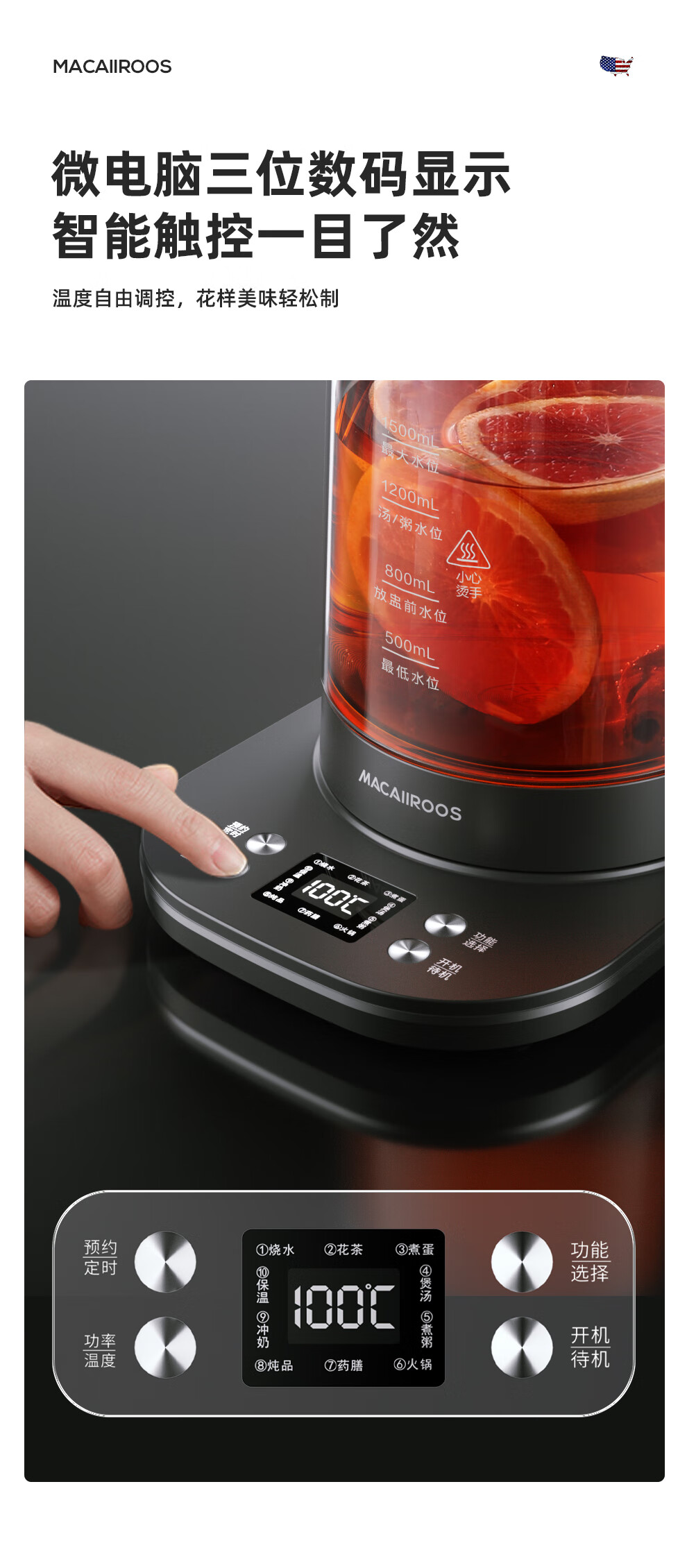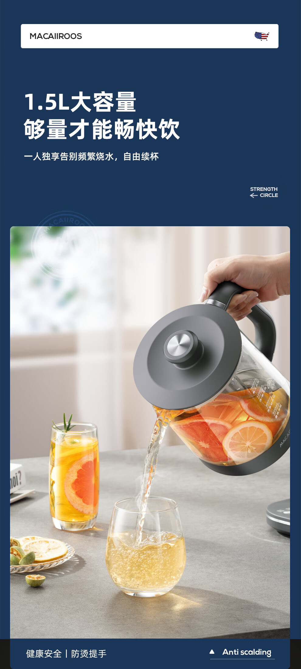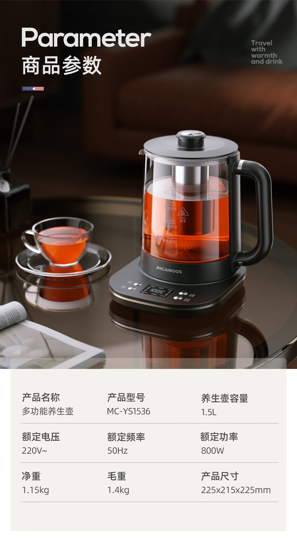 【小家电】迈卡罗MACAIIROOS养生壶纯钛发热盘 1.5L电水壶高硼硅玻璃烧水壶电热水壶开水壶 煮茶壶玻璃电茶壶 MC-YS1536 HF