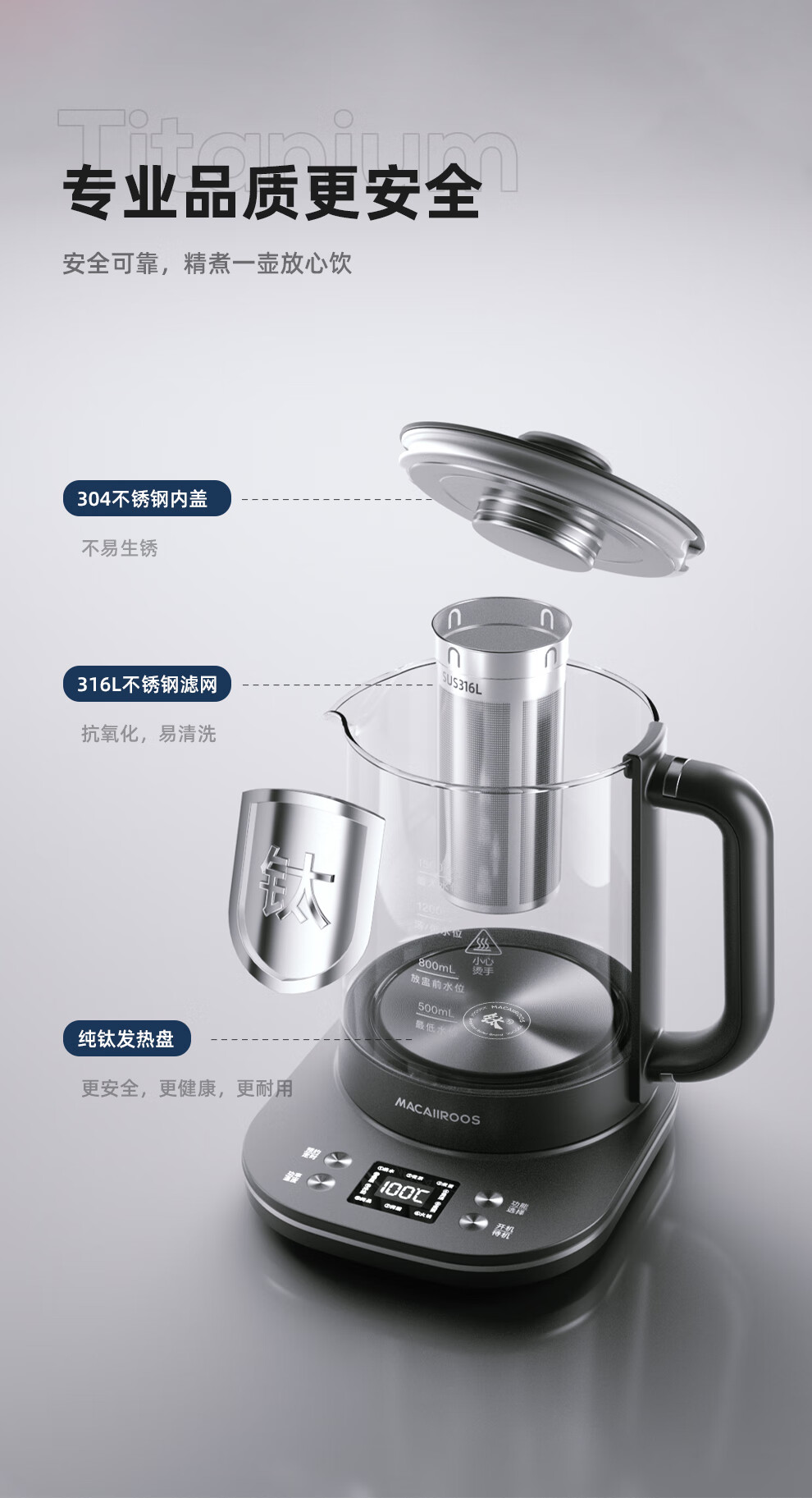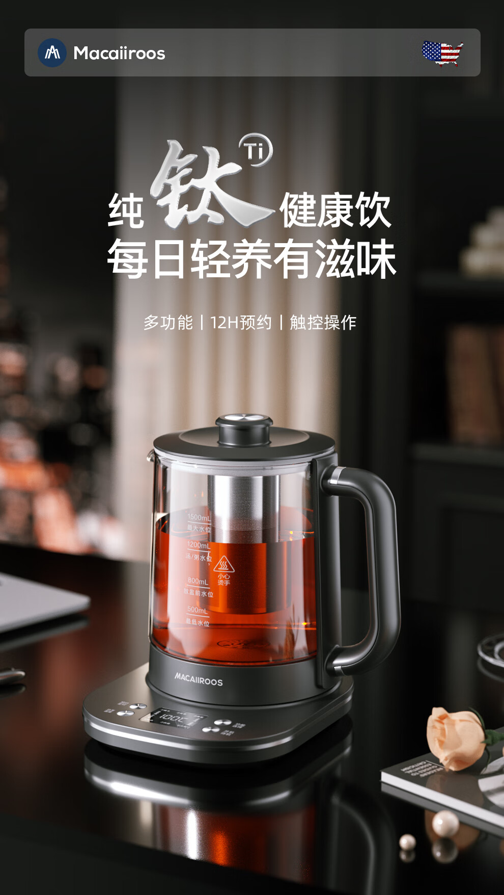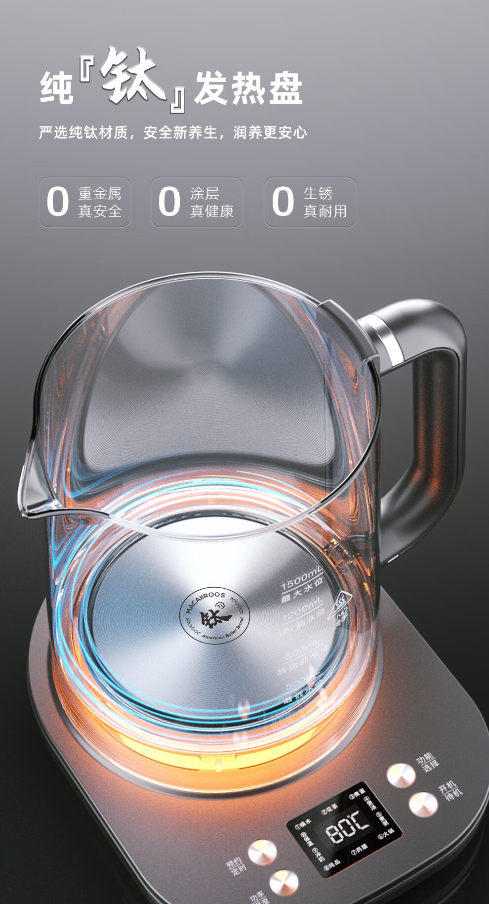 【小家电】迈卡罗MACAIIROOS养生壶纯钛发热盘 1.5L电水壶高硼硅玻璃烧水壶电热水壶开水壶 煮茶壶玻璃电茶壶 MC-YS1536 HF