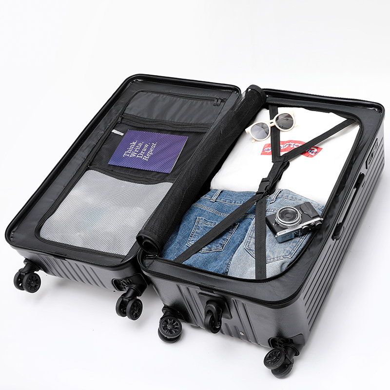 一边是网面内衬隔离适合放日常用品,一边可以用弹力带固定适合放衣物、书本、电脑等大件的物品。