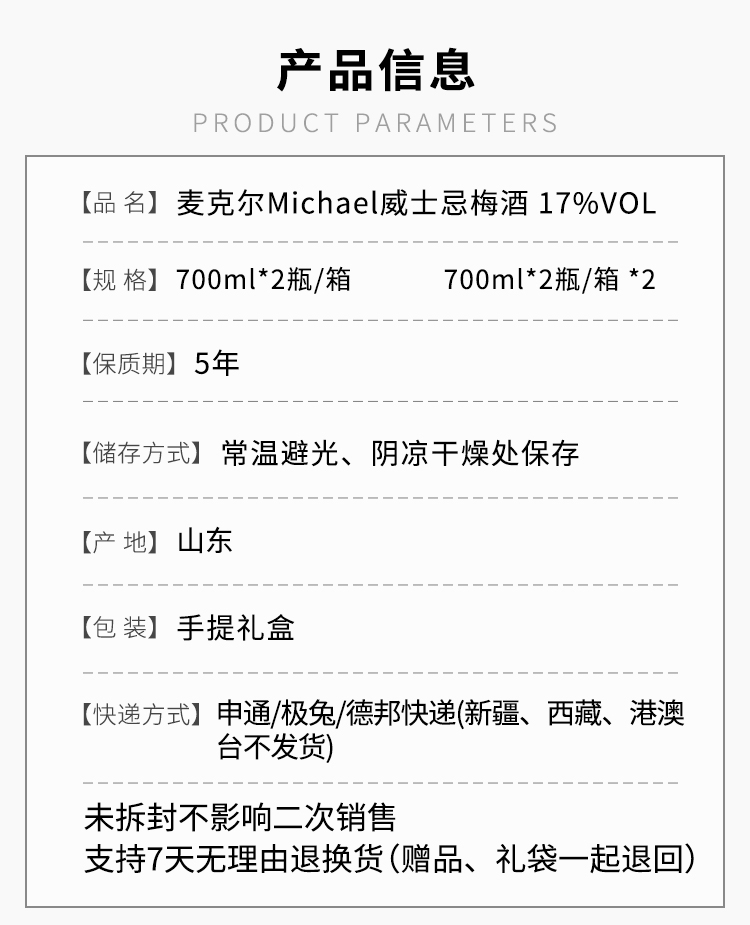 【麦克尔Michael威士忌梅酒】酸甜与醇厚交织,尽享微醺时刻 17%VOL 1919全球酒水连锁专柜款 带手提礼盒