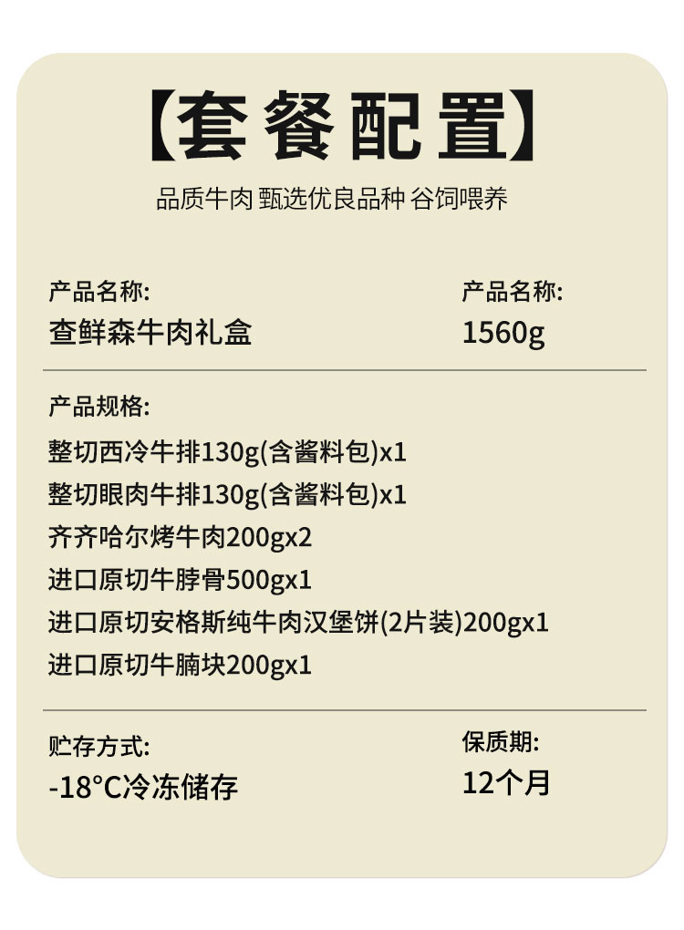 查鲜森 牛肉礼盒298型 1560g 【实物/礼券】
