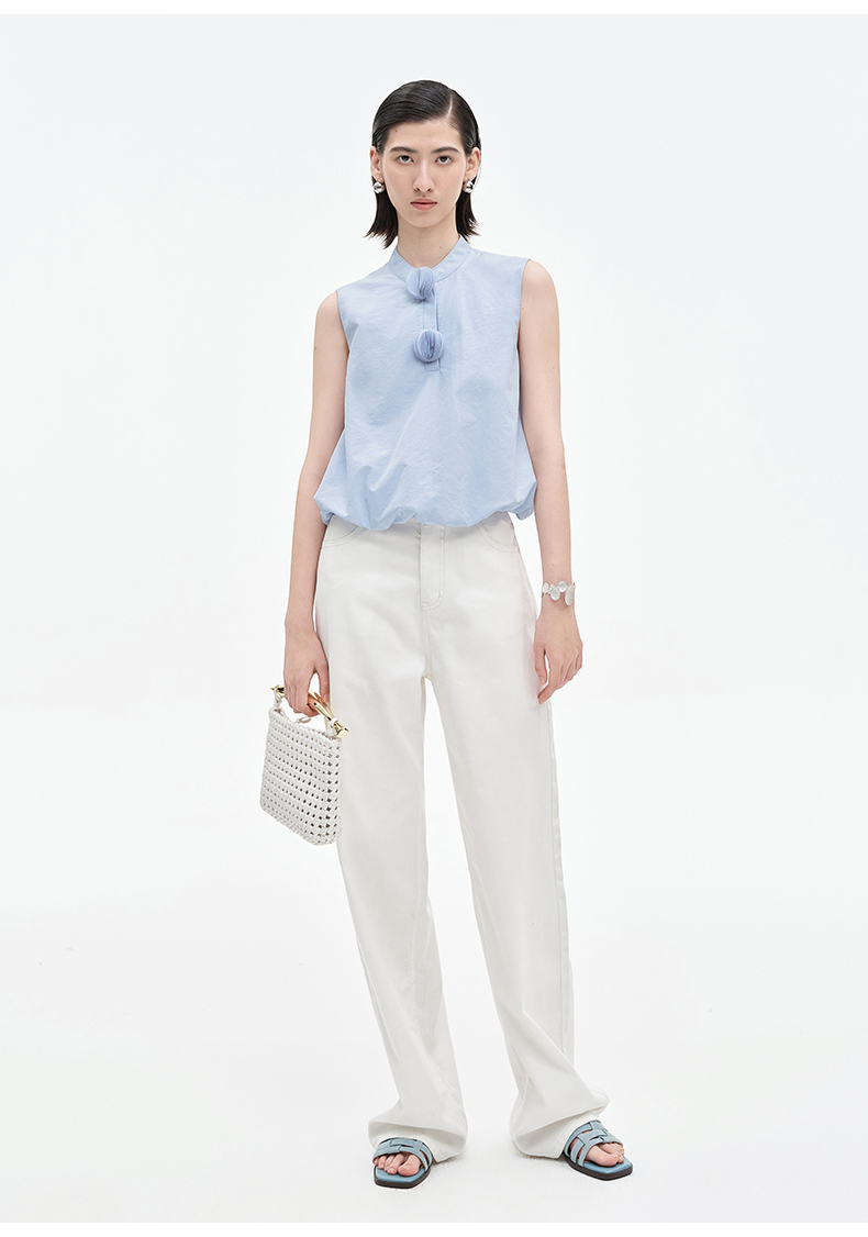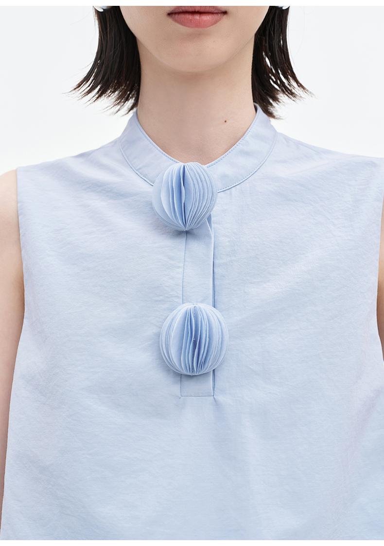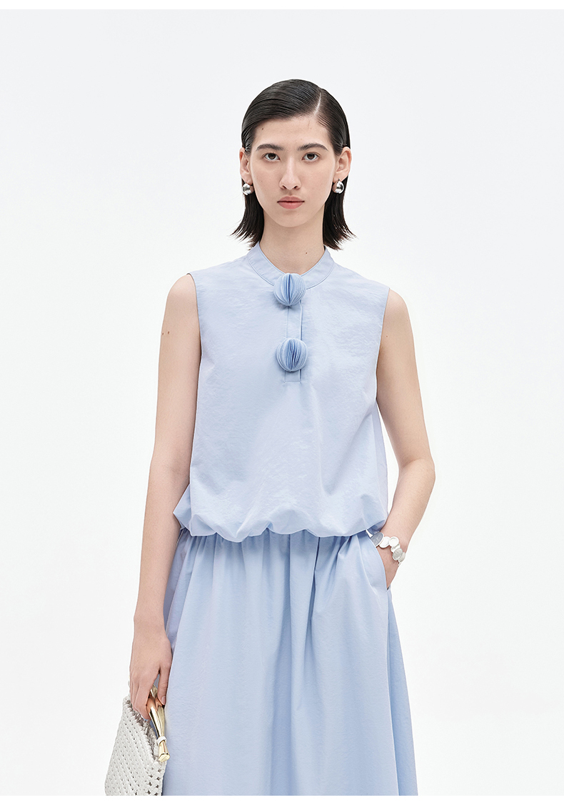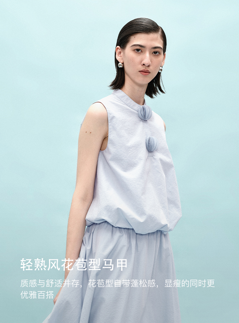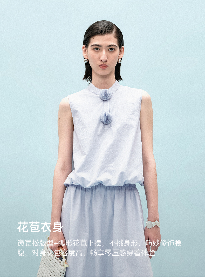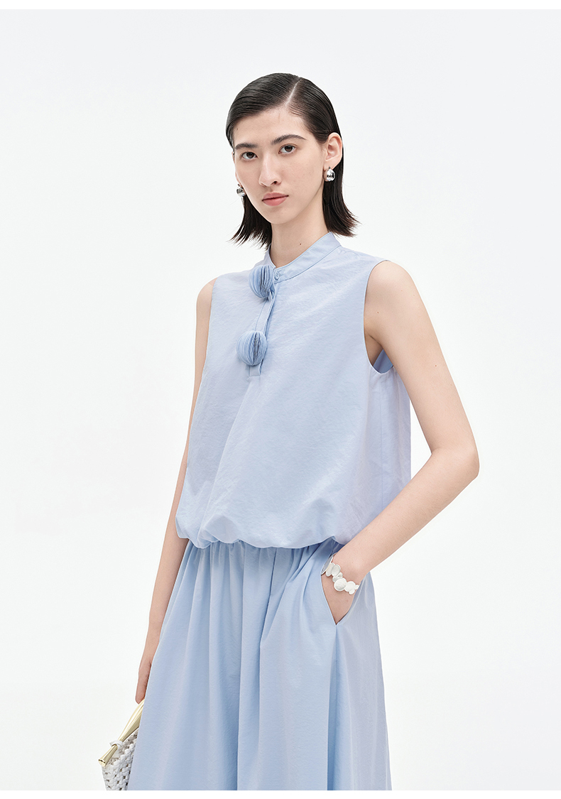 [乔欣同款]SELFWHO蓝色棉混纺立领无袖花苞背心女夏新款短款马甲