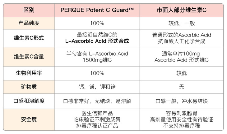 终上,总结PERQUE Potent C Guard 维C粉和普通维生素C的产品区别: