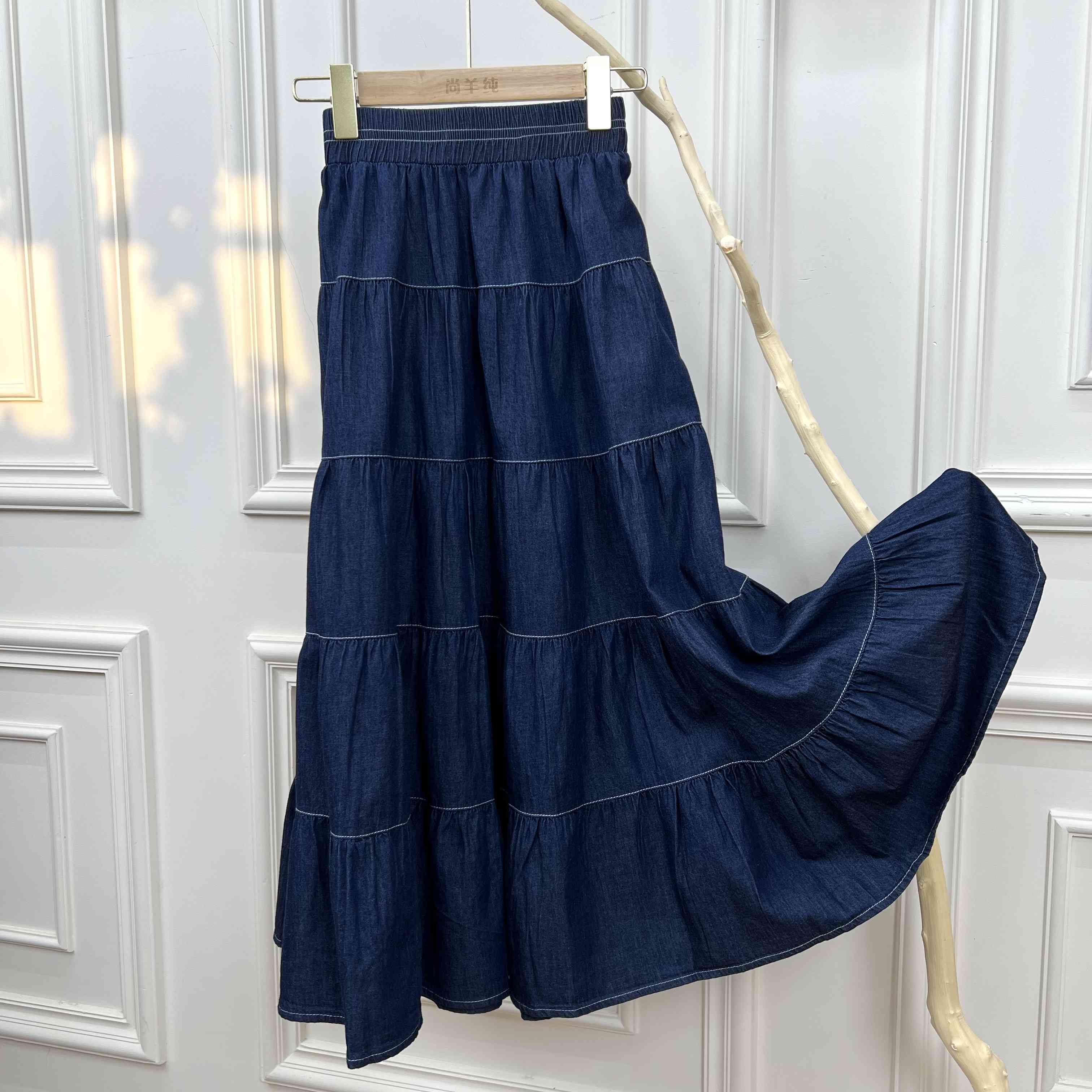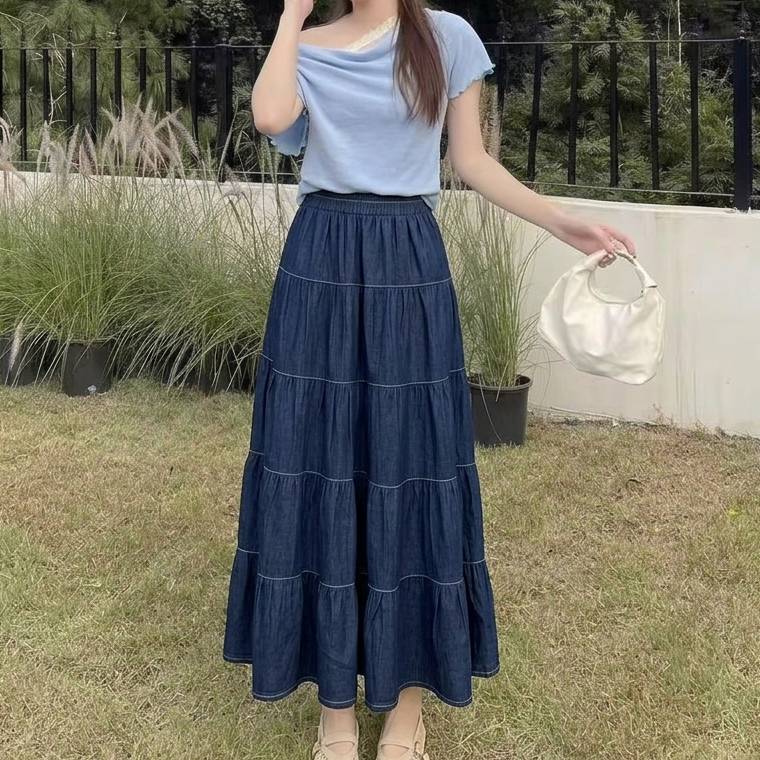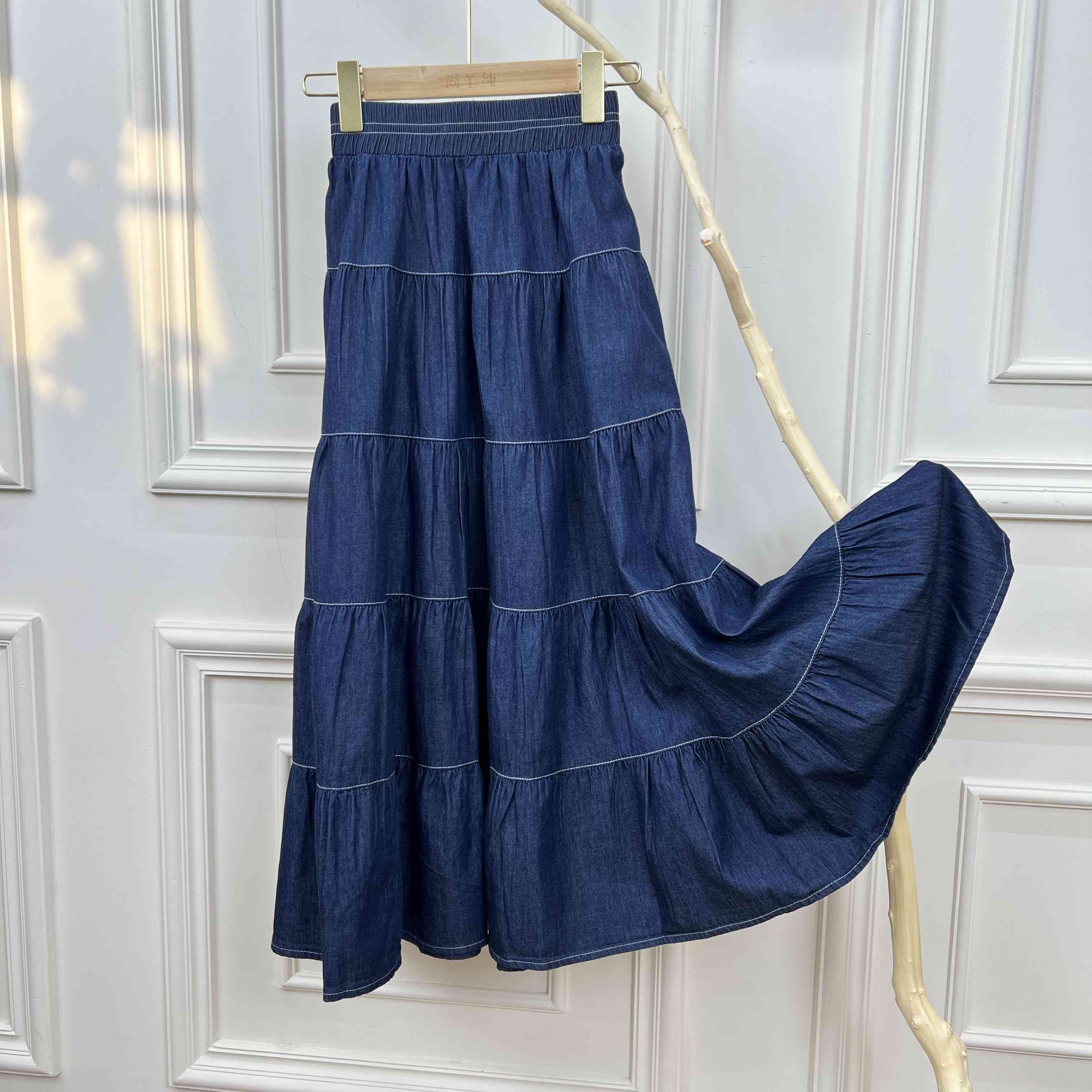 复古丹宁蓝~高腰宽松显瘦压褶中长蛋糕半身裙女薄款牛仔裙