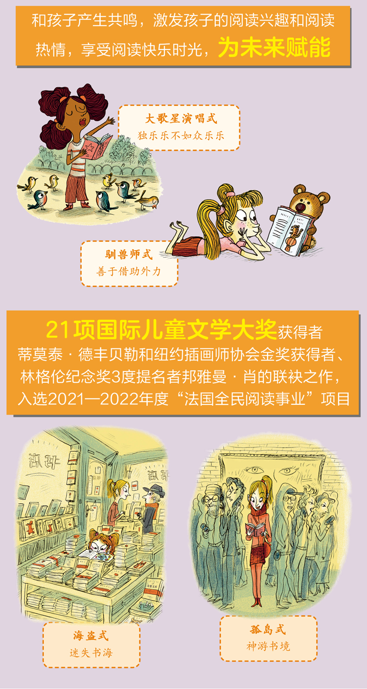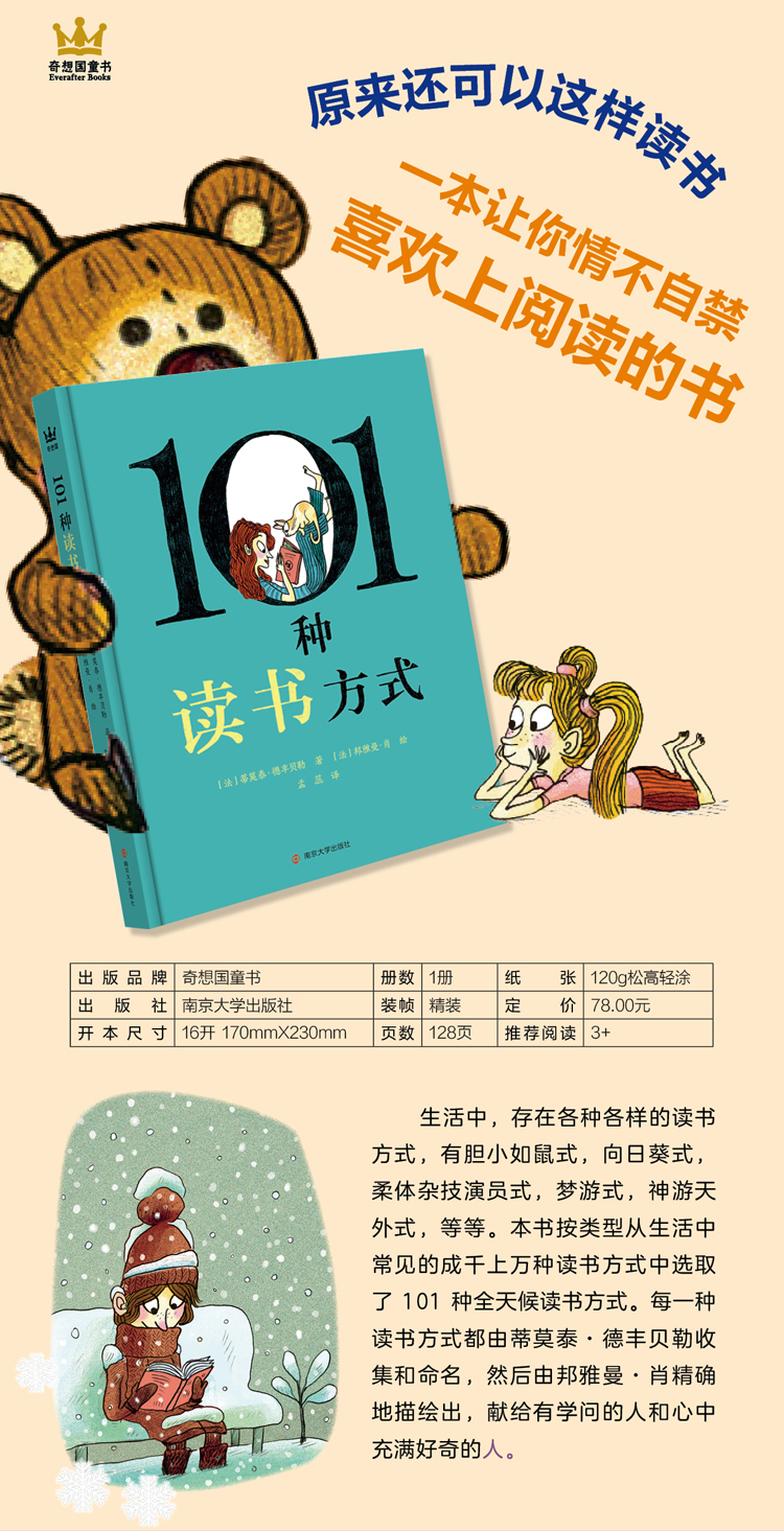 生活中,存在各种各样的读书方式,有胆小如鼠式,向日葵式,柔体杂技演员式,梦游式,神游天外式,等等。本书按类型从生活中常见的成千上万种读书方式中选取了 101 种全天候读书方式。每一种读书方式都由蒂莫泰·德丰贝勒收集和命名,然后由邦雅曼·肖精确地描绘出,献给有学问的人和心中充满好奇的人。