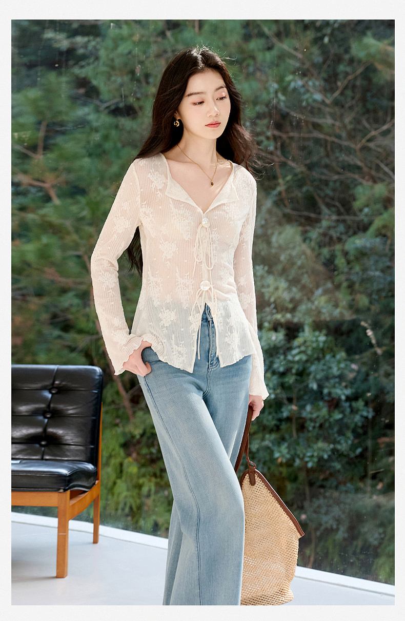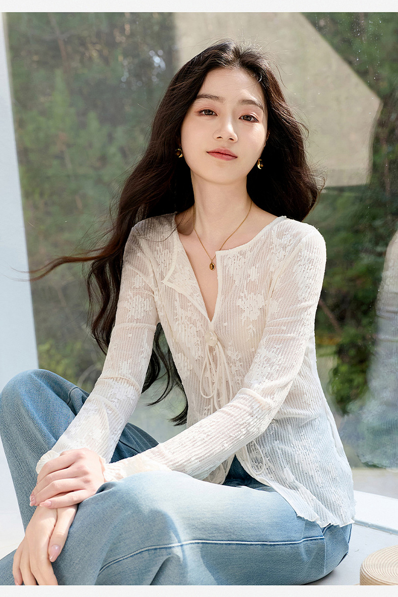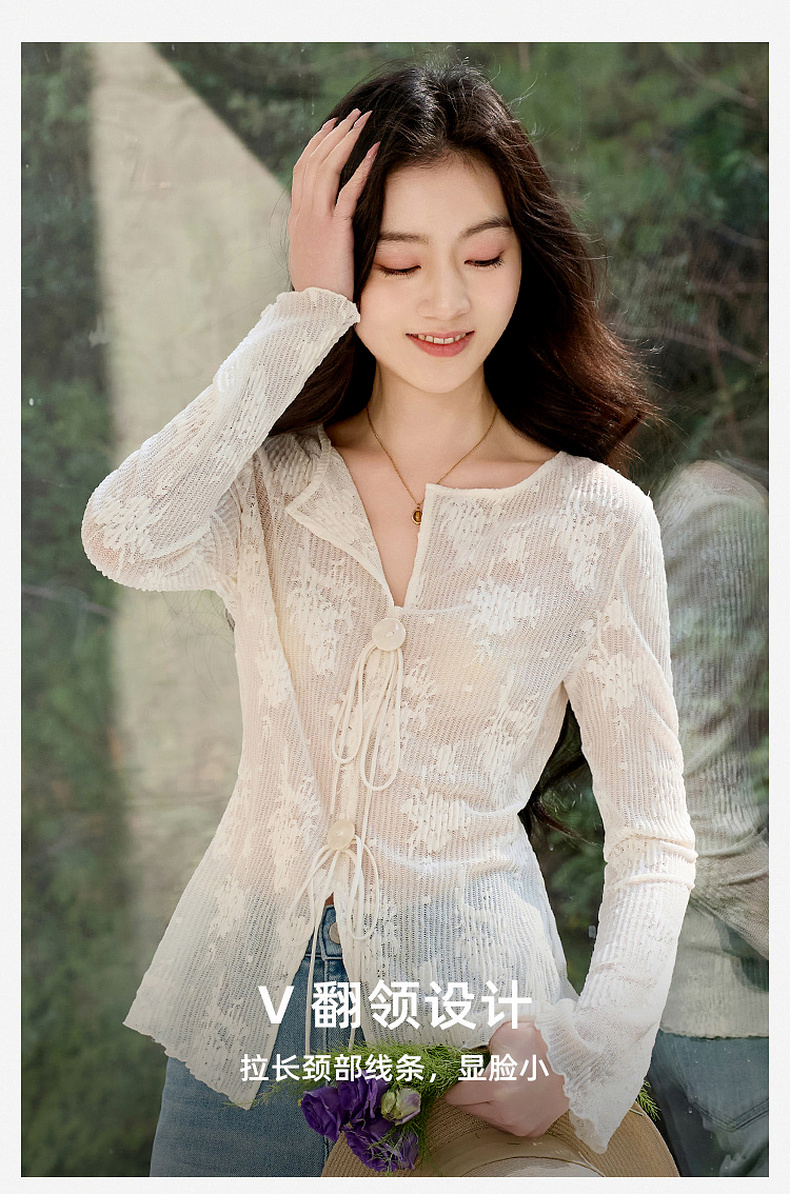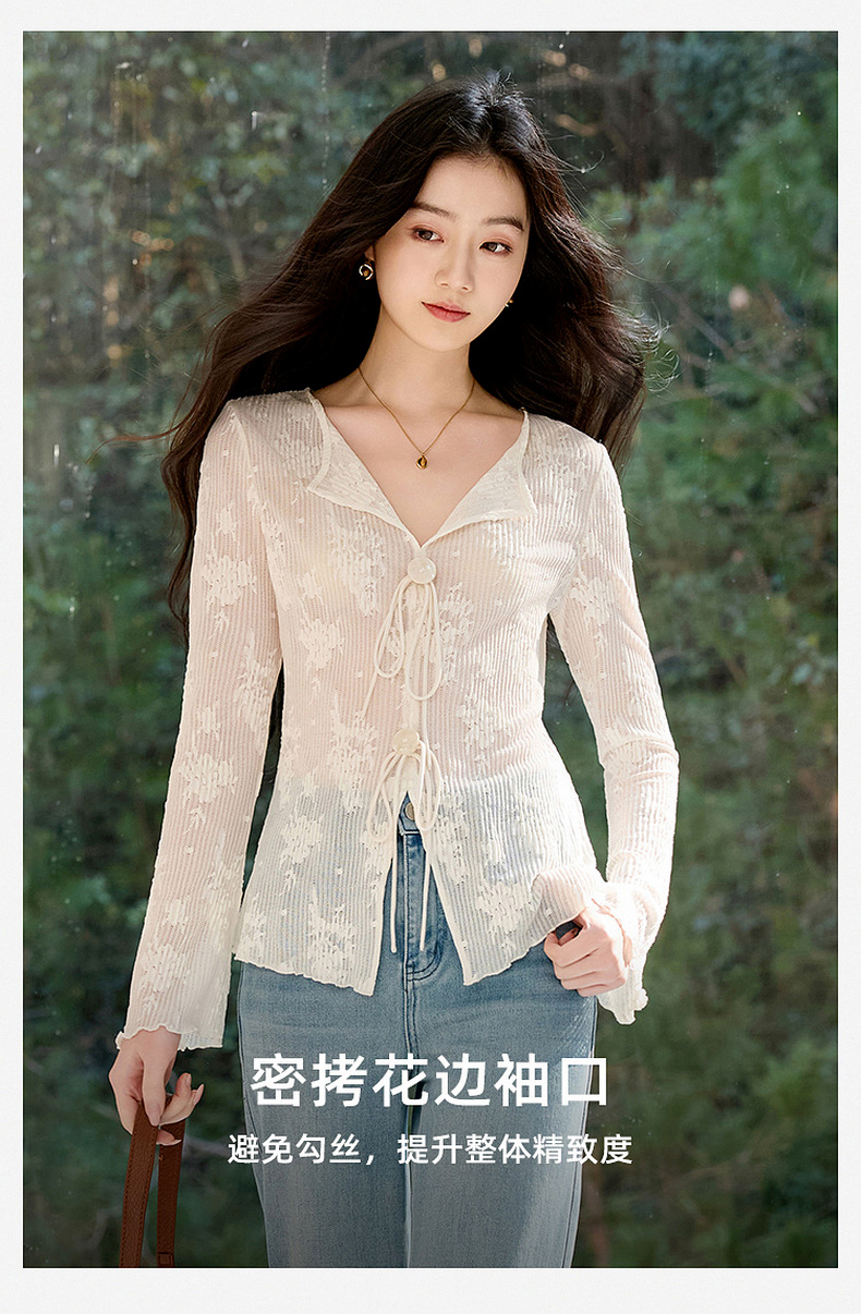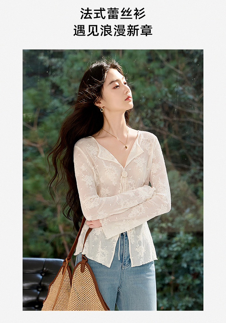 三彩2026春季新款修身长袖V领蕾丝衫法式衬衣套头小衫气质上衣S