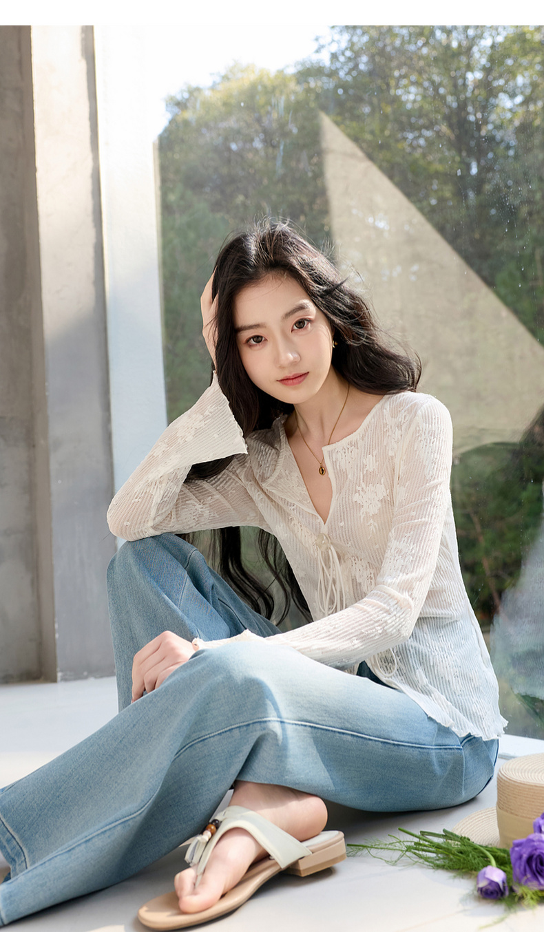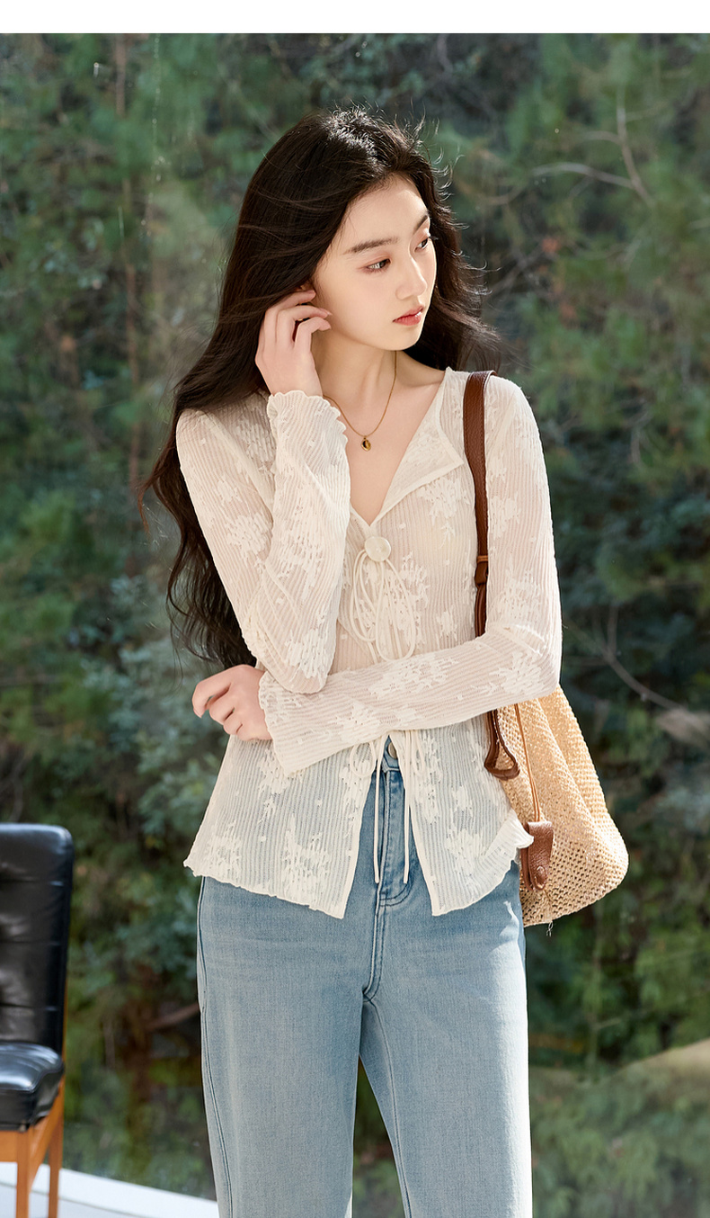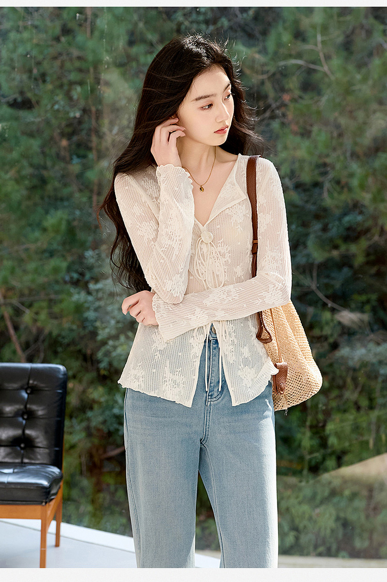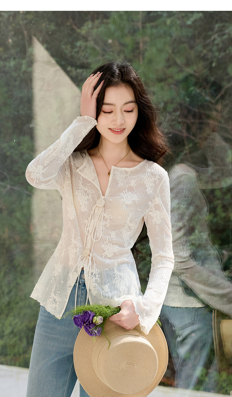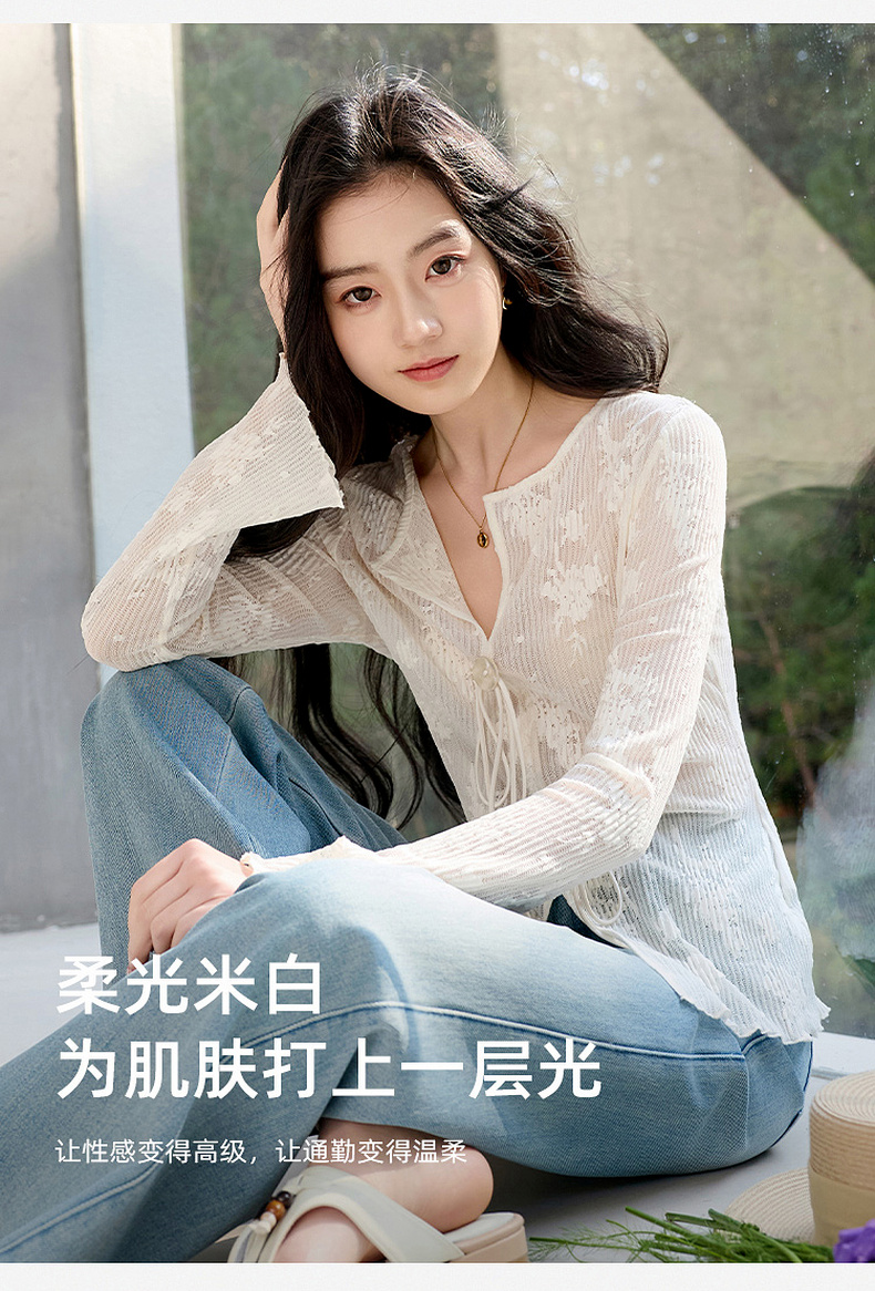 三彩2026春季新款修身长袖V领蕾丝衫法式衬衣套头小衫气质上衣S