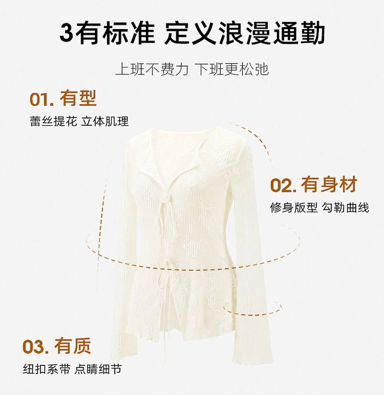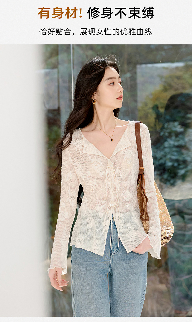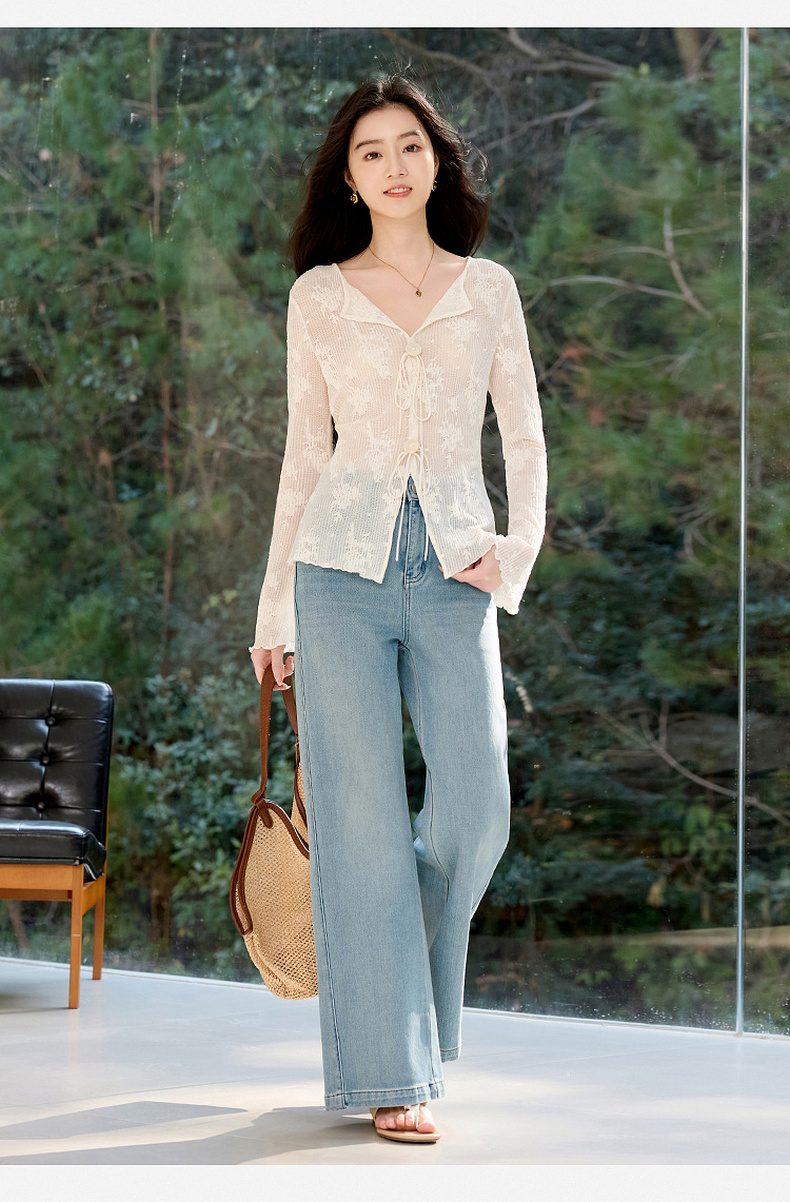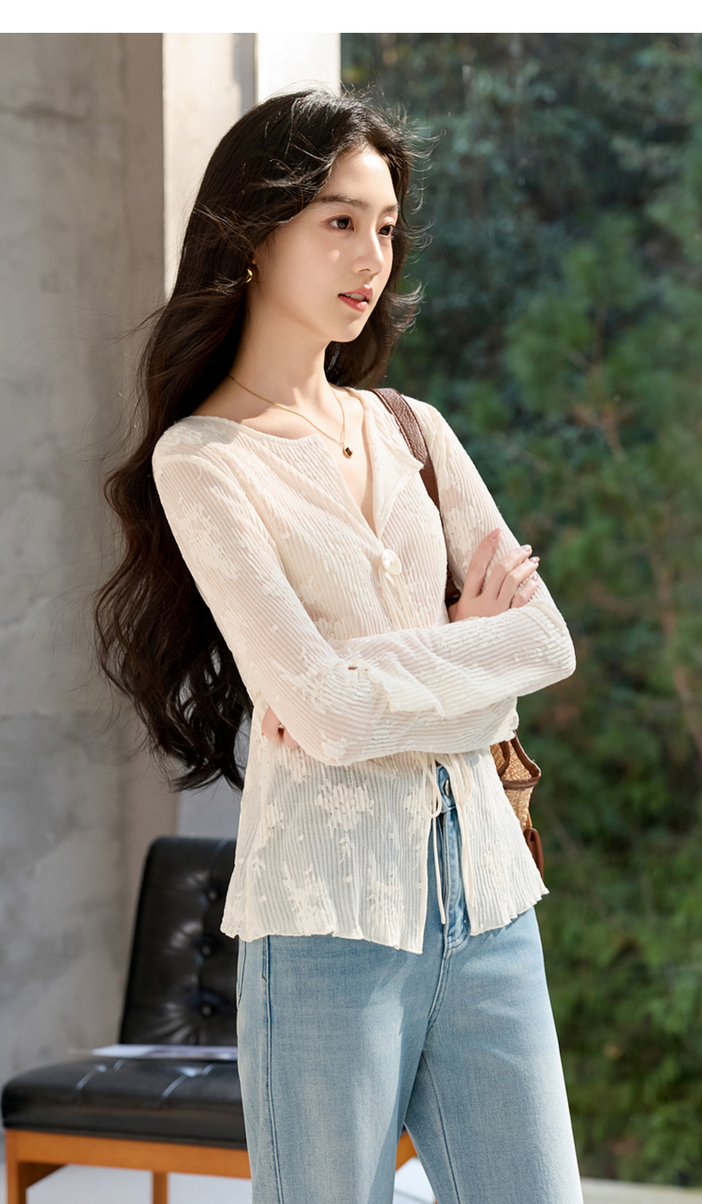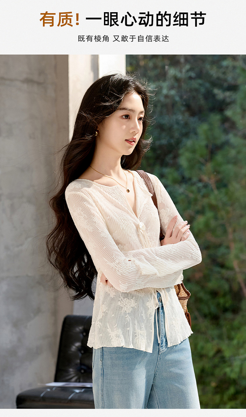 三彩2026春季新款修身长袖V领蕾丝衫法式衬衣套头小衫气质上衣S