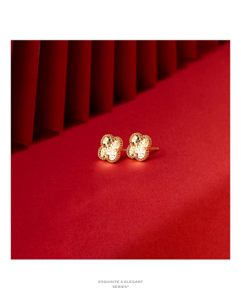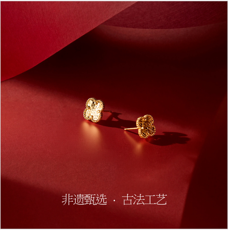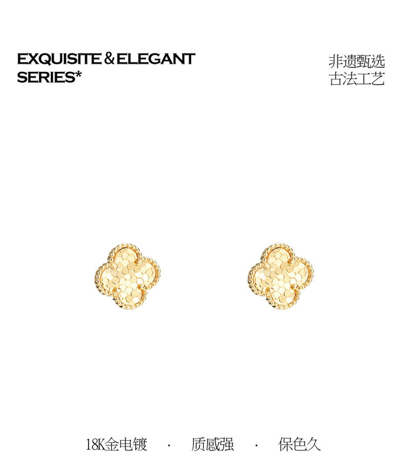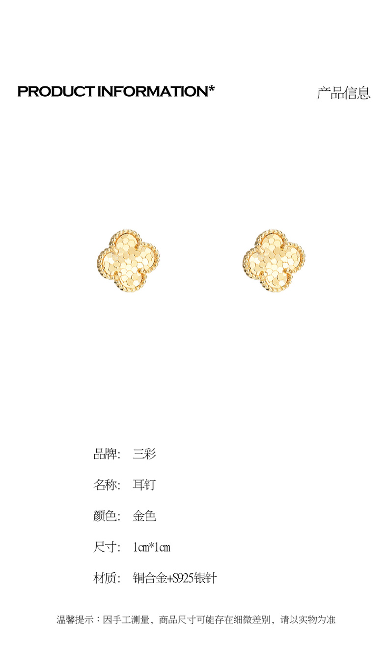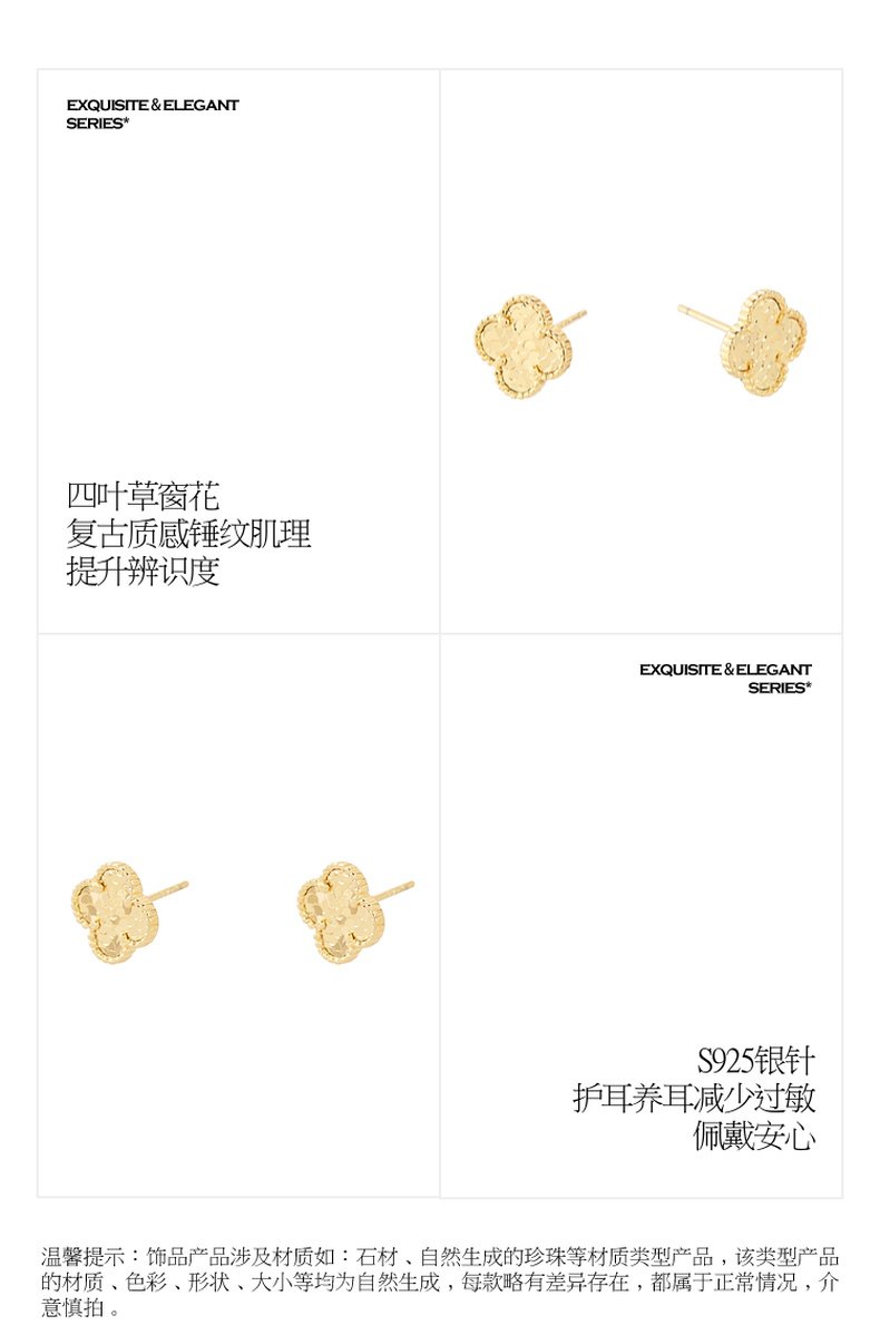 三彩2026新款四叶草窗花锤纹肌理耳钉S925银针国风松弛复古文艺女