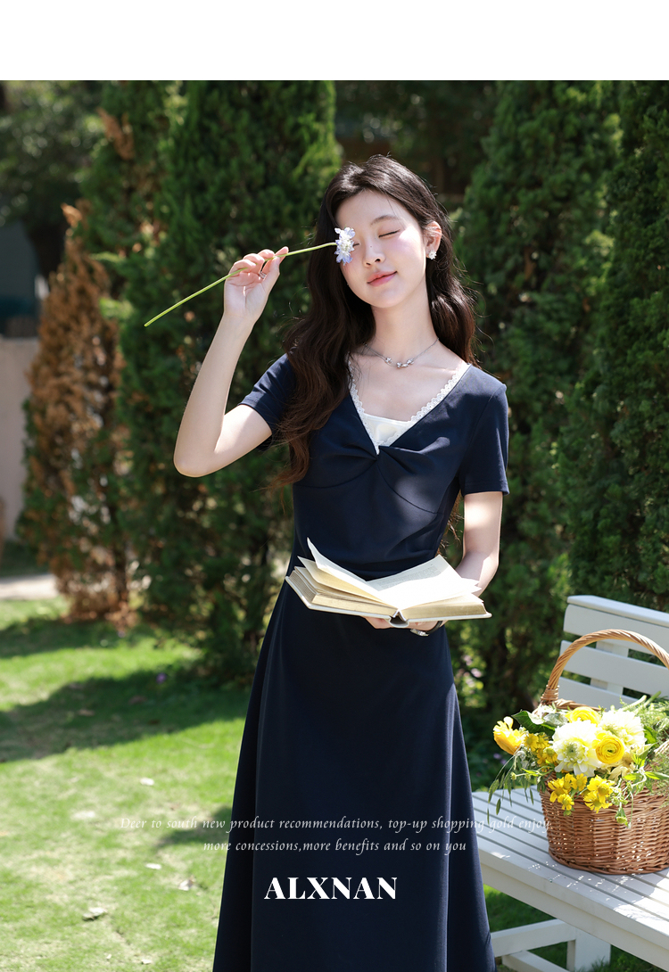 鹿向南「雾岛来信」藏青色法式短袖连衣裙夏季新款收腰A字长裙女