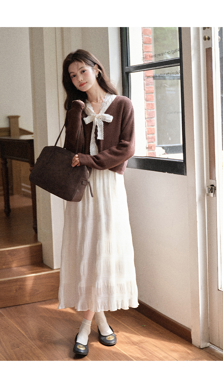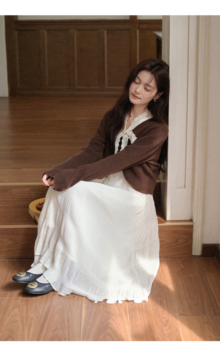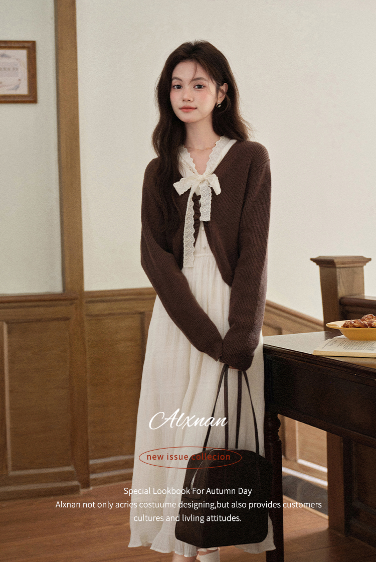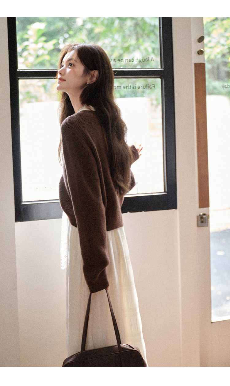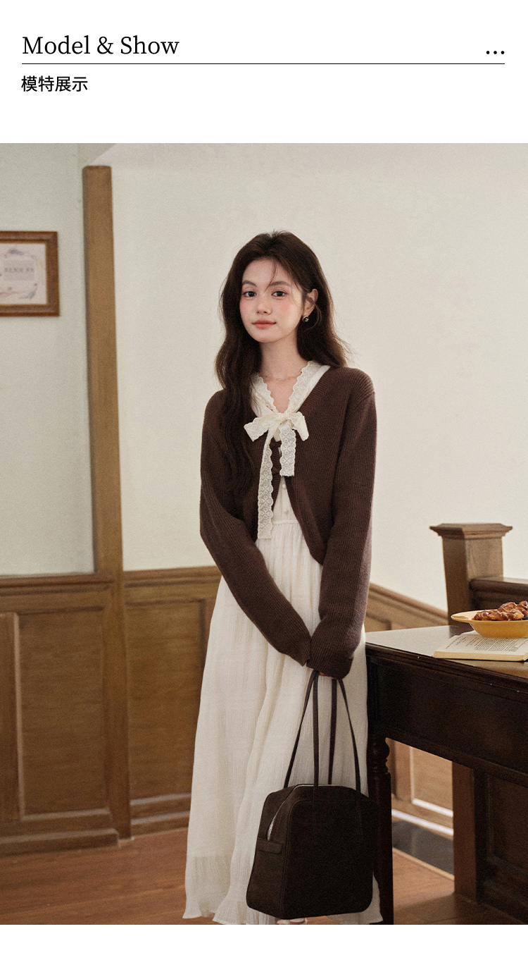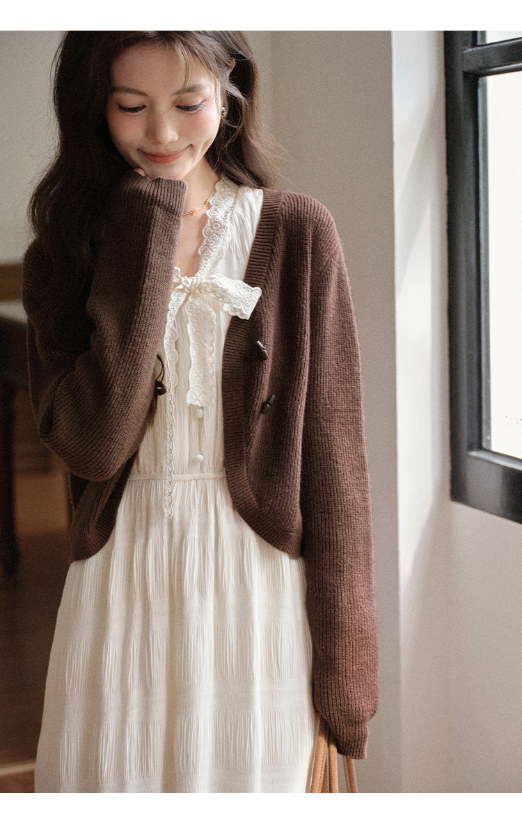 鹿向南「褐屿风吟」棕色长袖V领针织衫秋新款百搭通勤短款开衫女