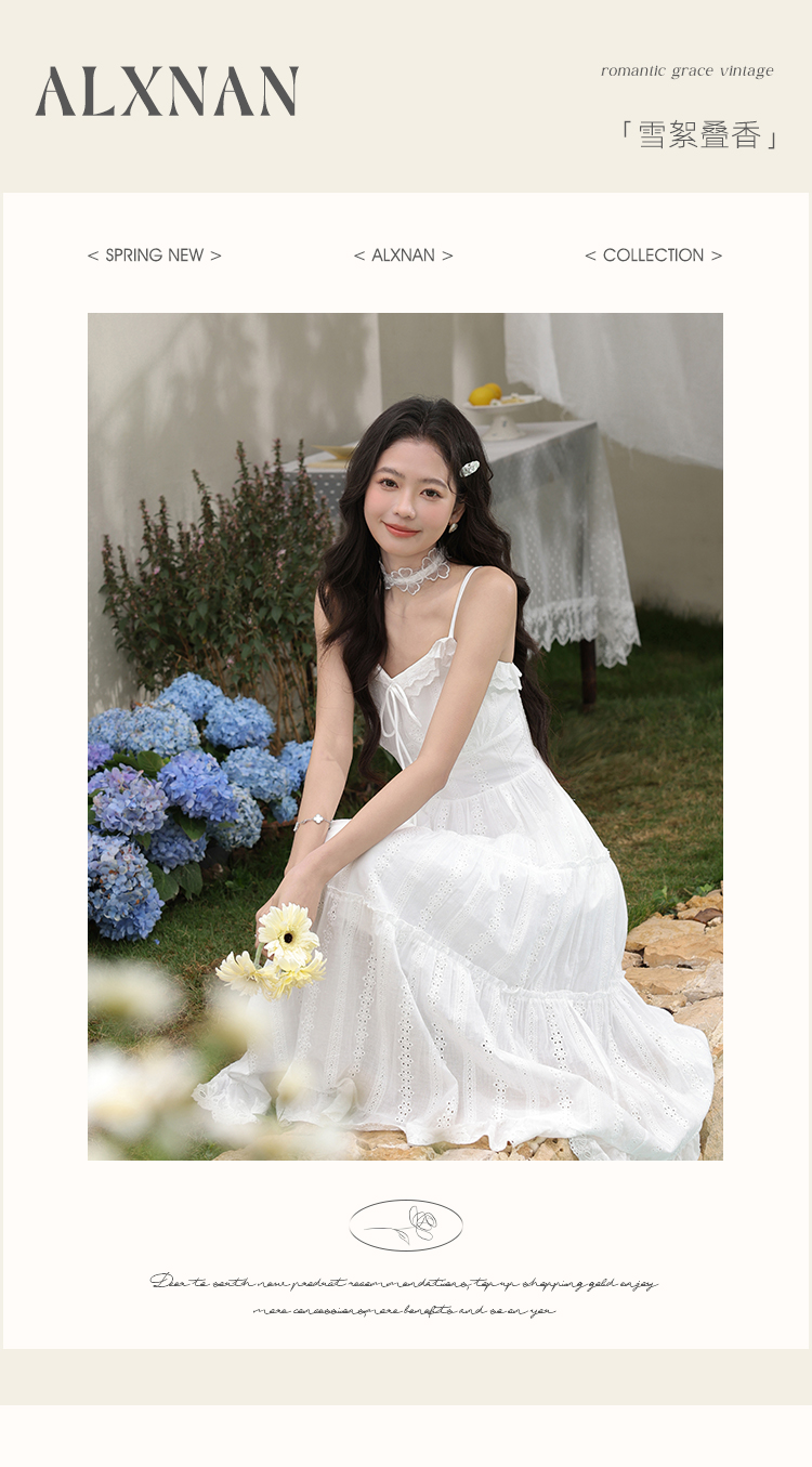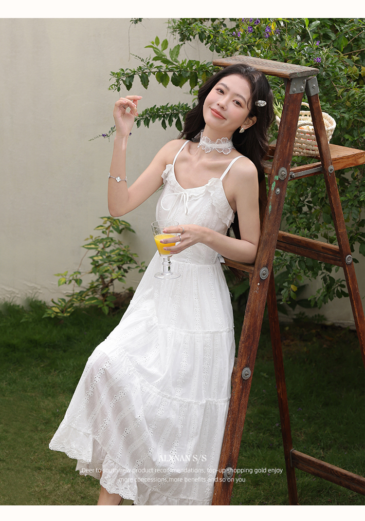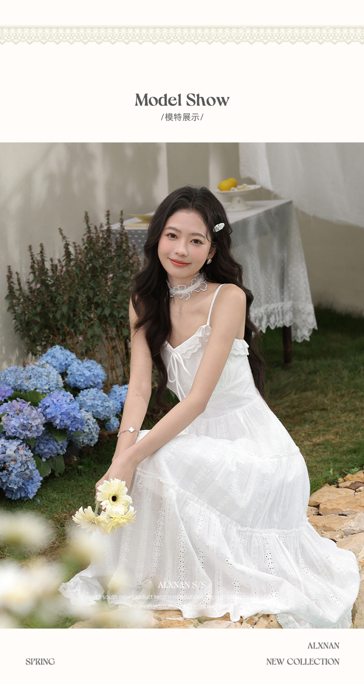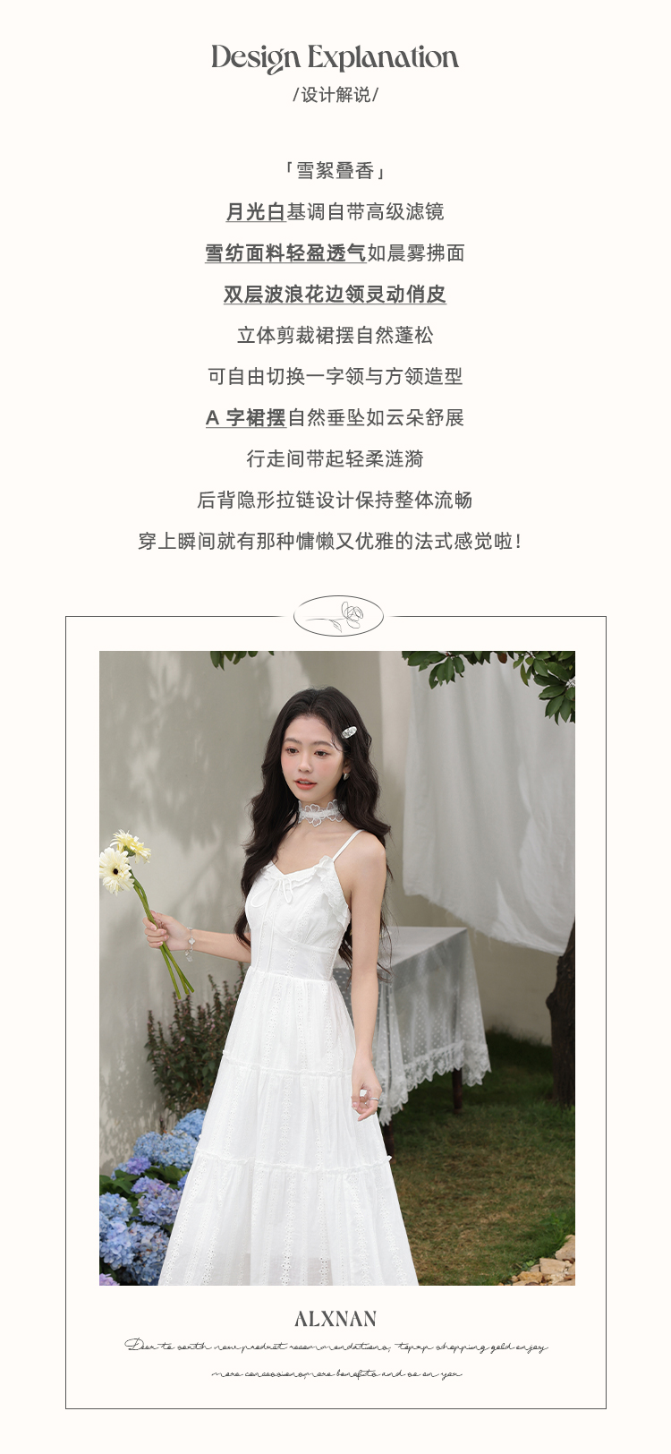 鹿向南「雪絮叠香」白色温柔镂空蕾丝吊带长裙女夏新款优雅连衣裙