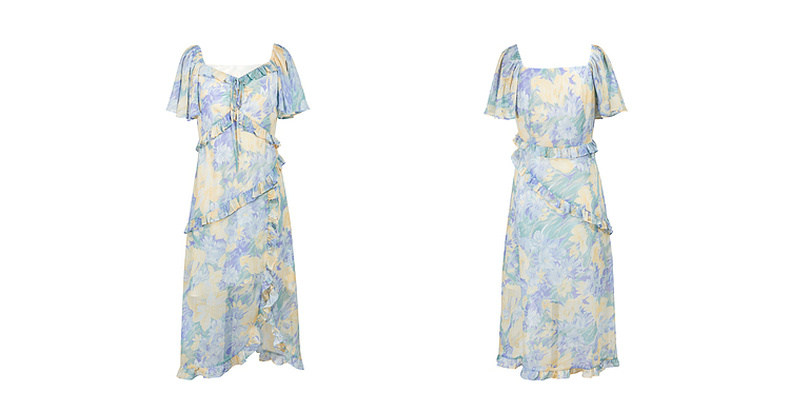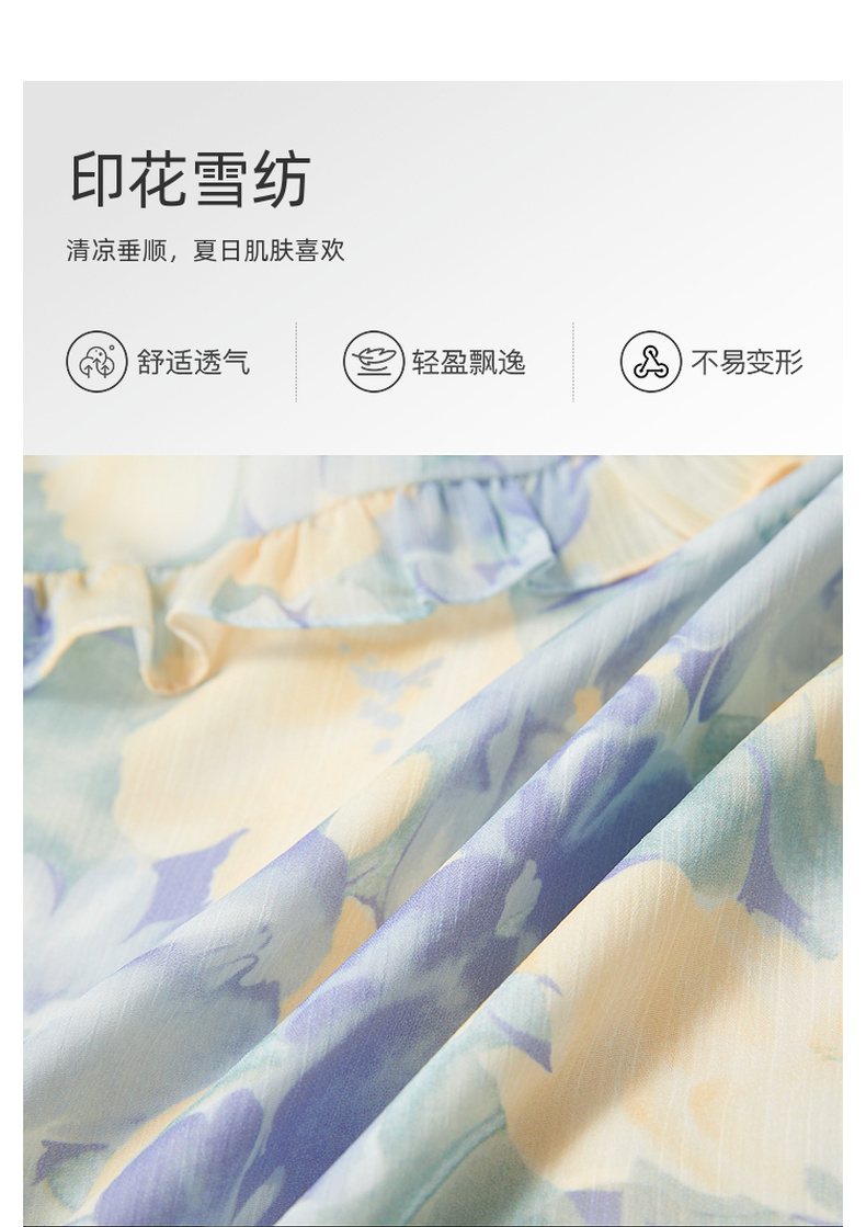 【莫奈花园】三彩独醒2025夏季新款荷叶边印花雪纺裙连衣裙度假风长裙仙女裙F