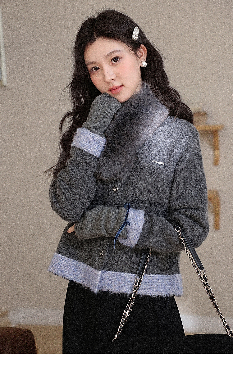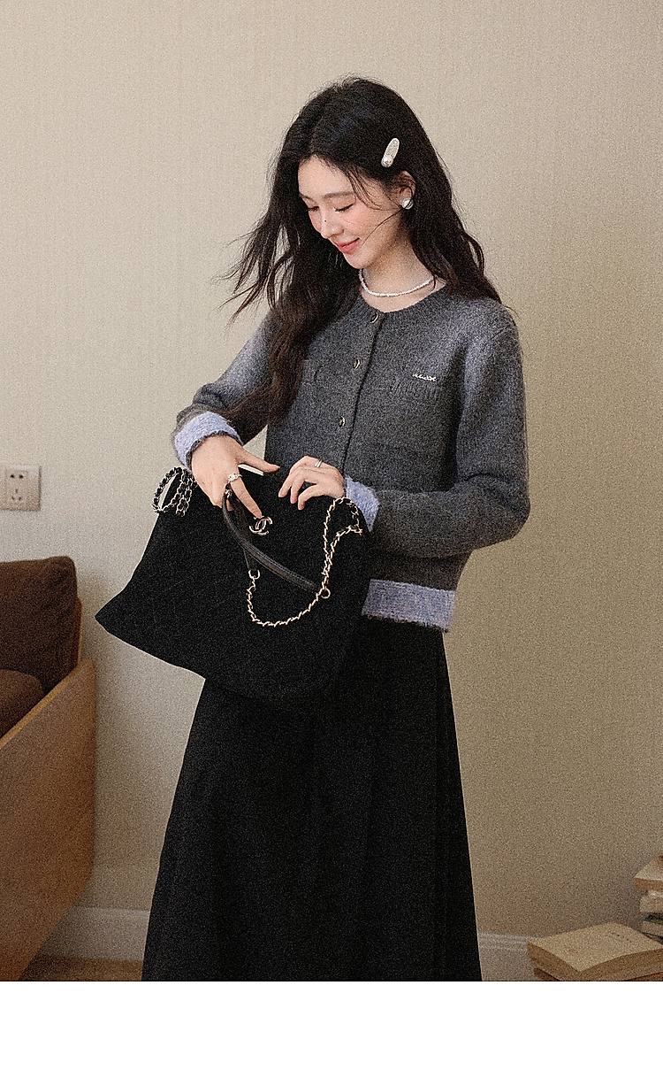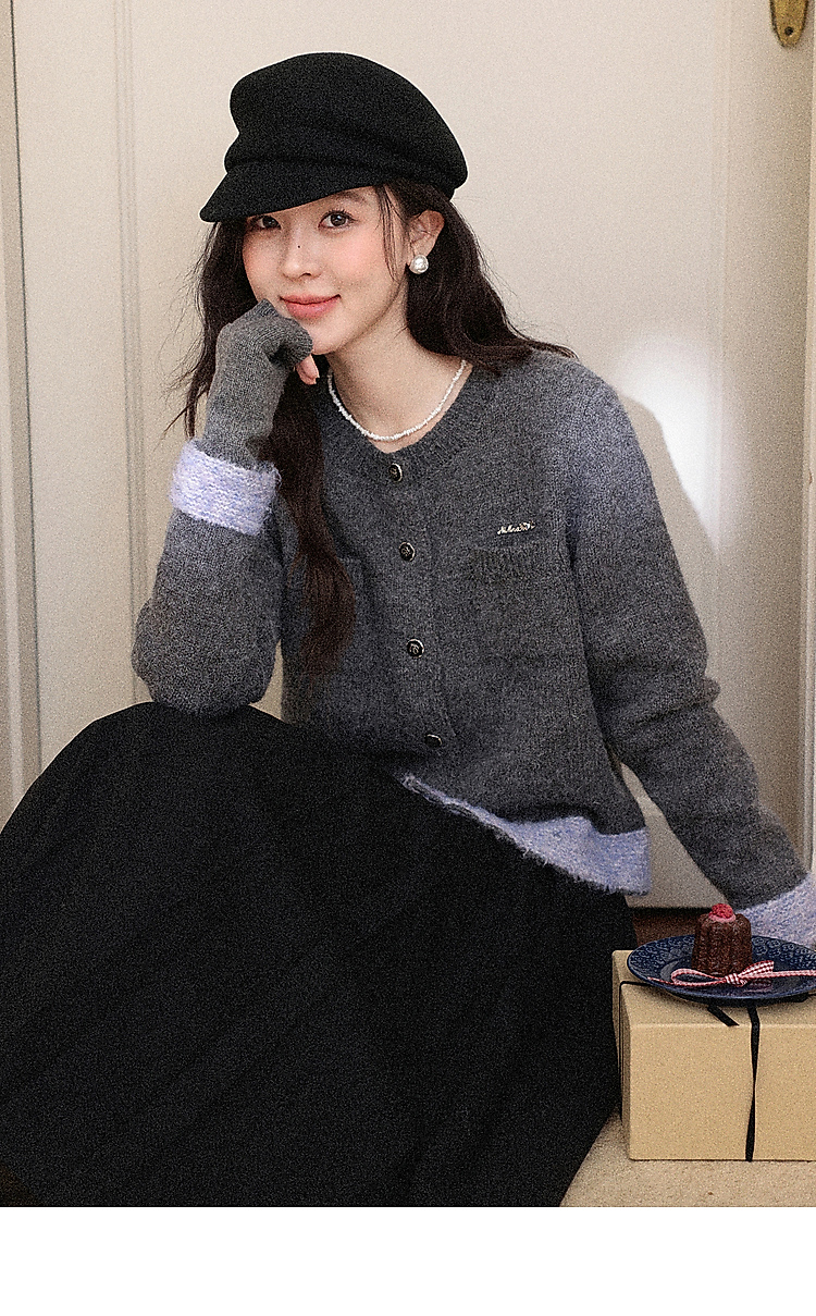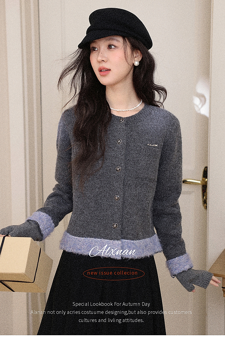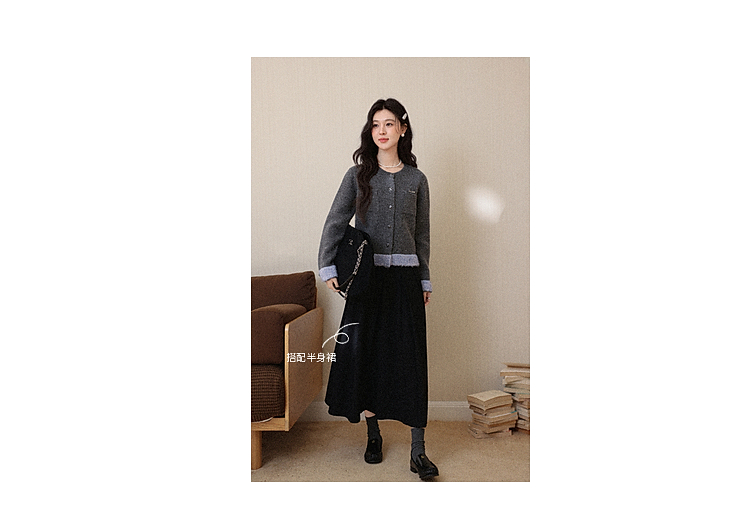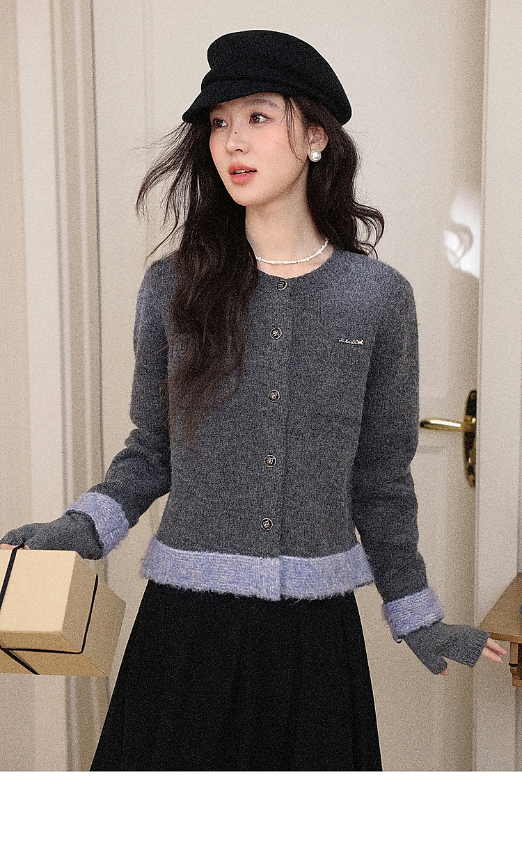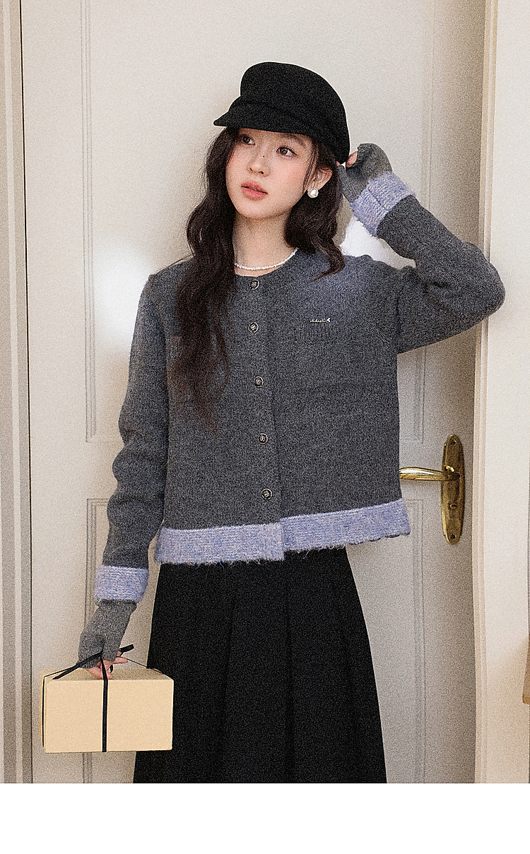 鹿向南「巴黎慢调」复古花灰色长袖毛衣女秋冬撞色设计感针织开衫