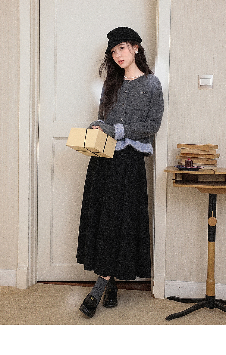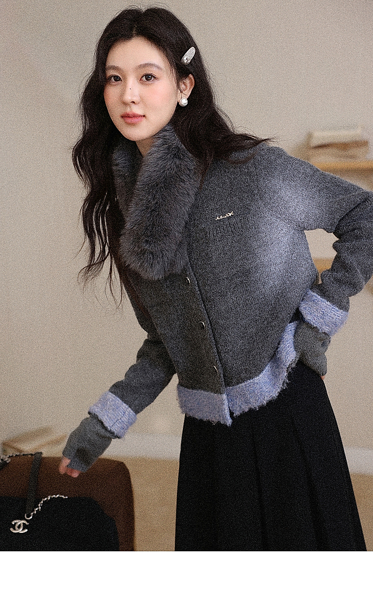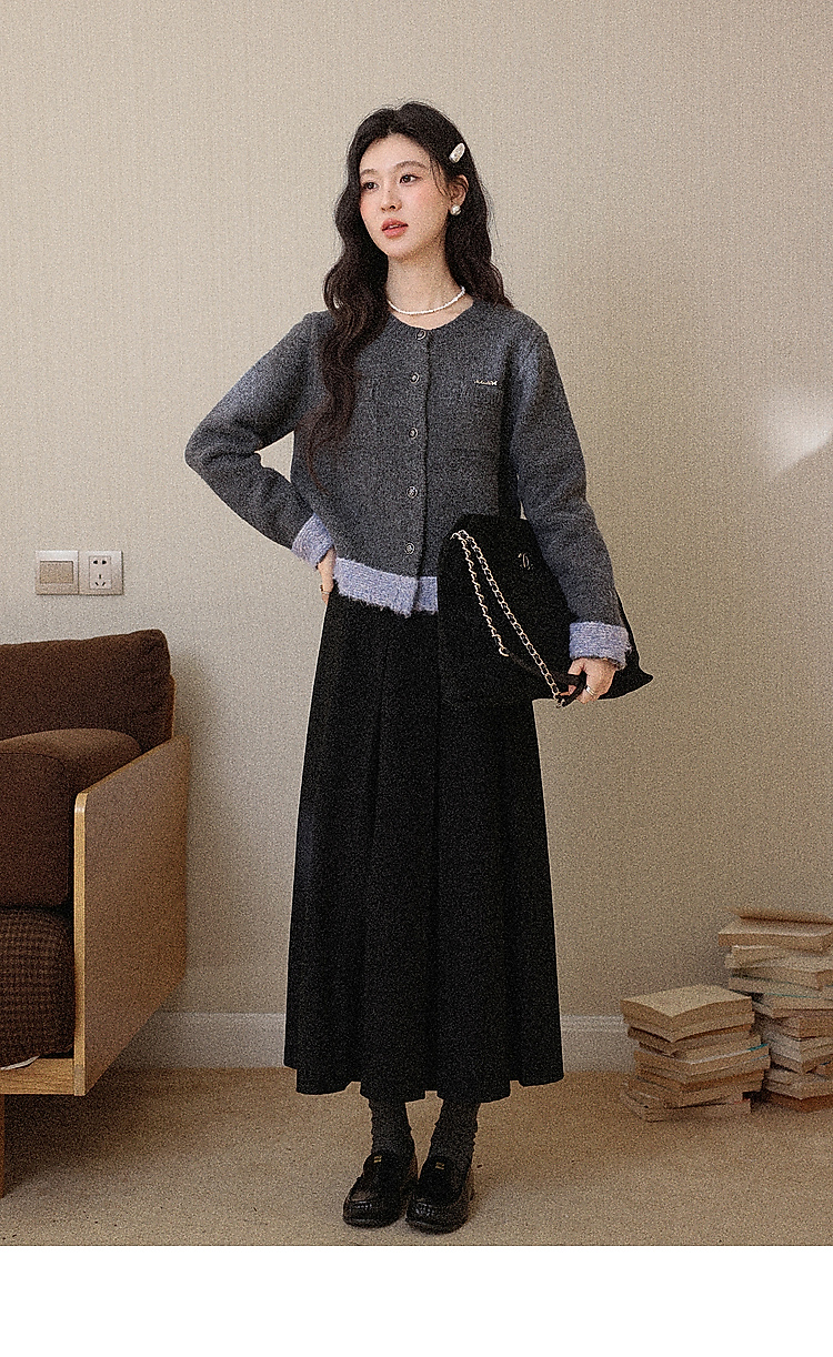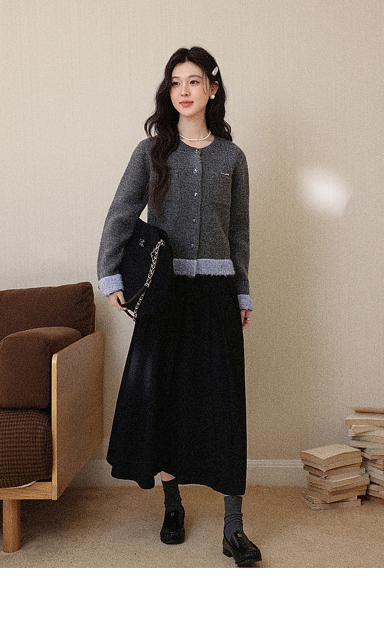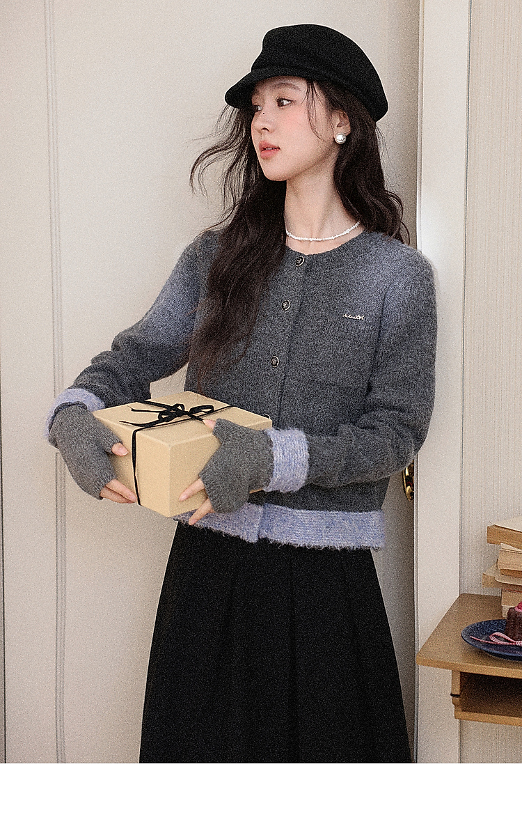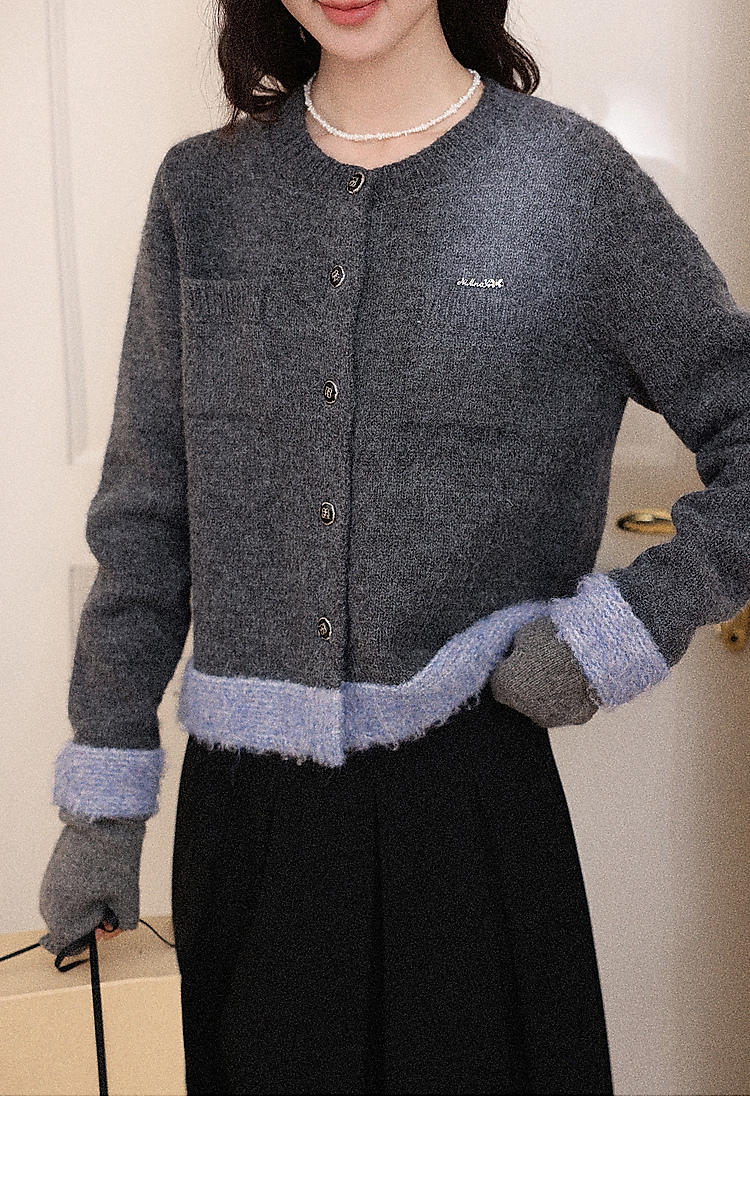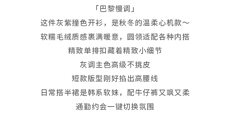 鹿向南「巴黎慢调」复古花灰色长袖毛衣女秋冬撞色设计感针织开衫