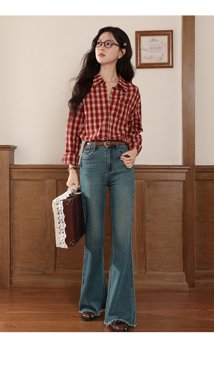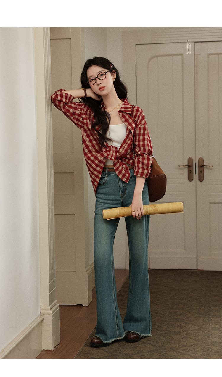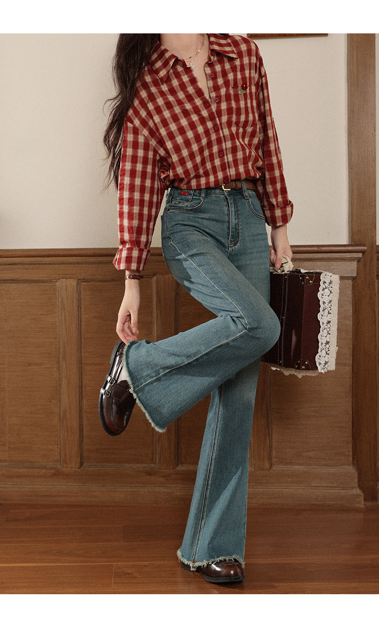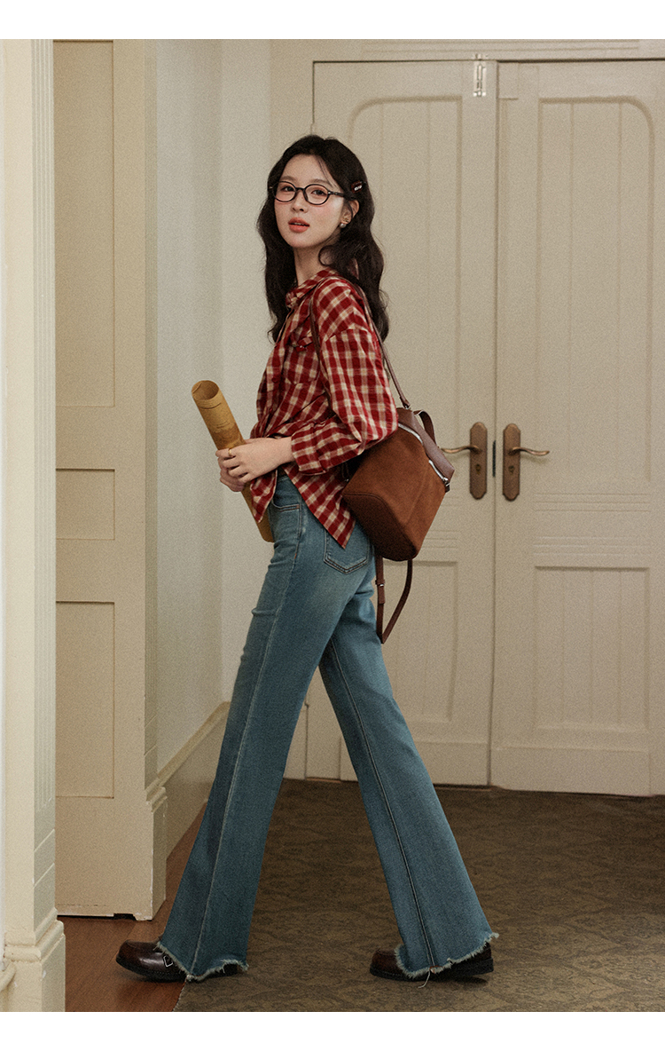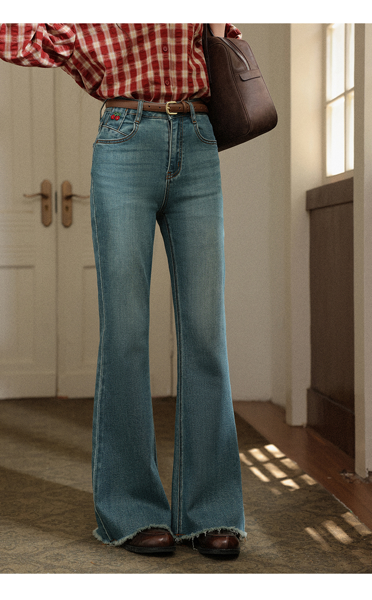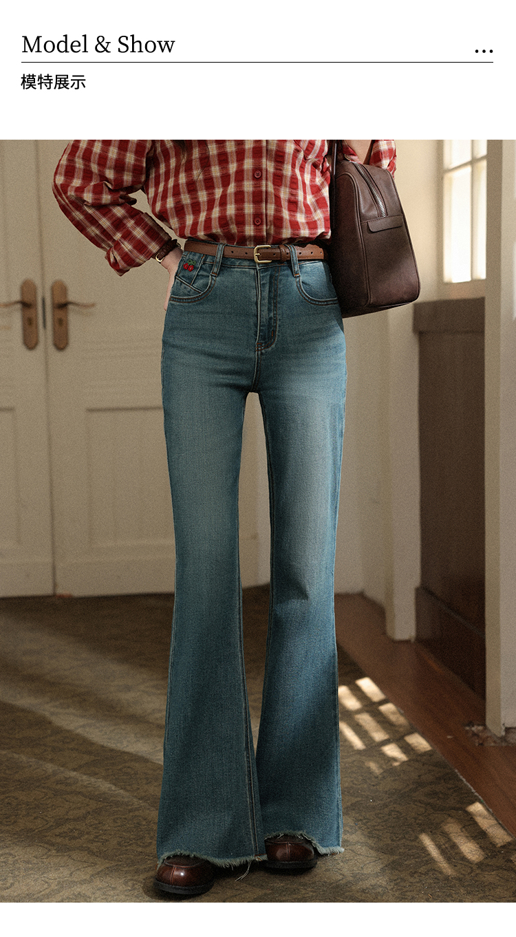 【65折秒杀】鹿向南「风拾温柔」蓝色微喇裤女早秋修身高腰显瘦毛边拖地牛仔裤L56703