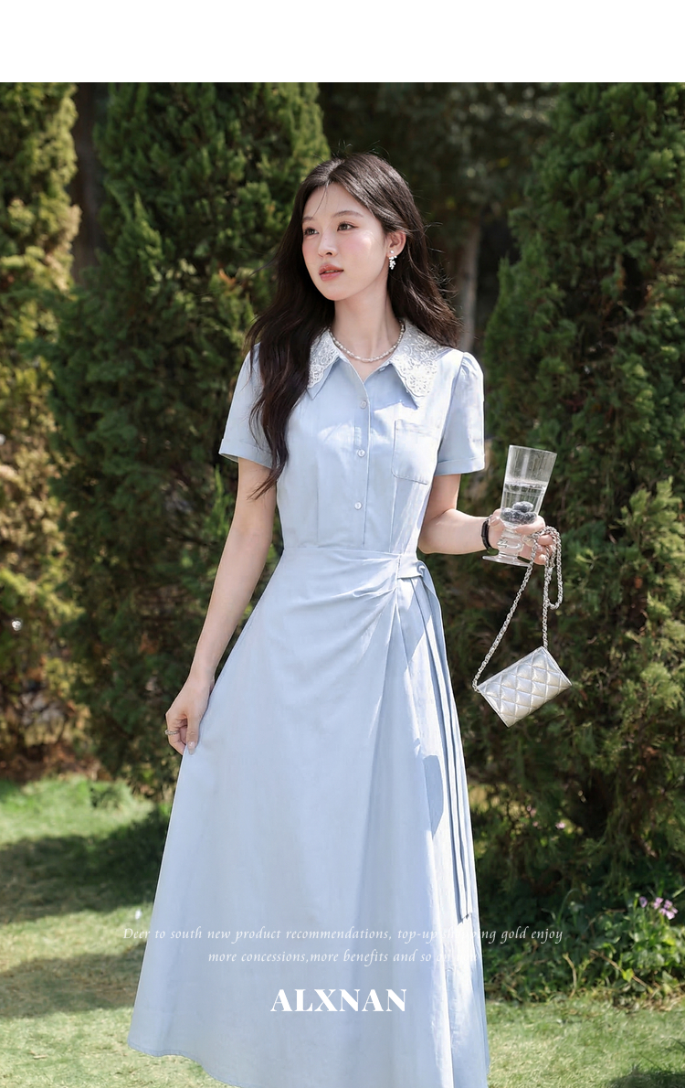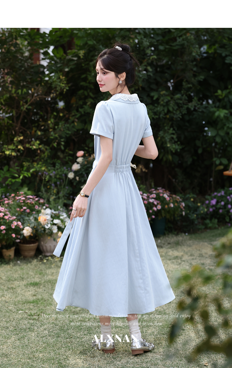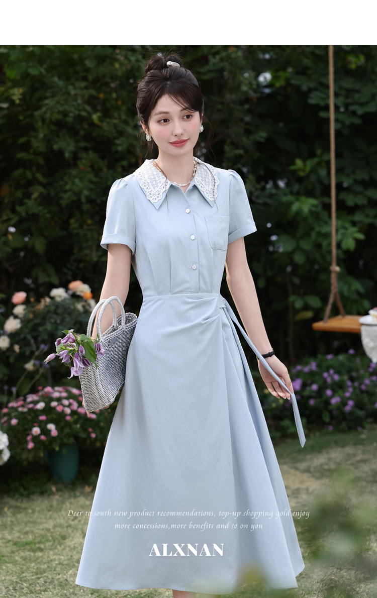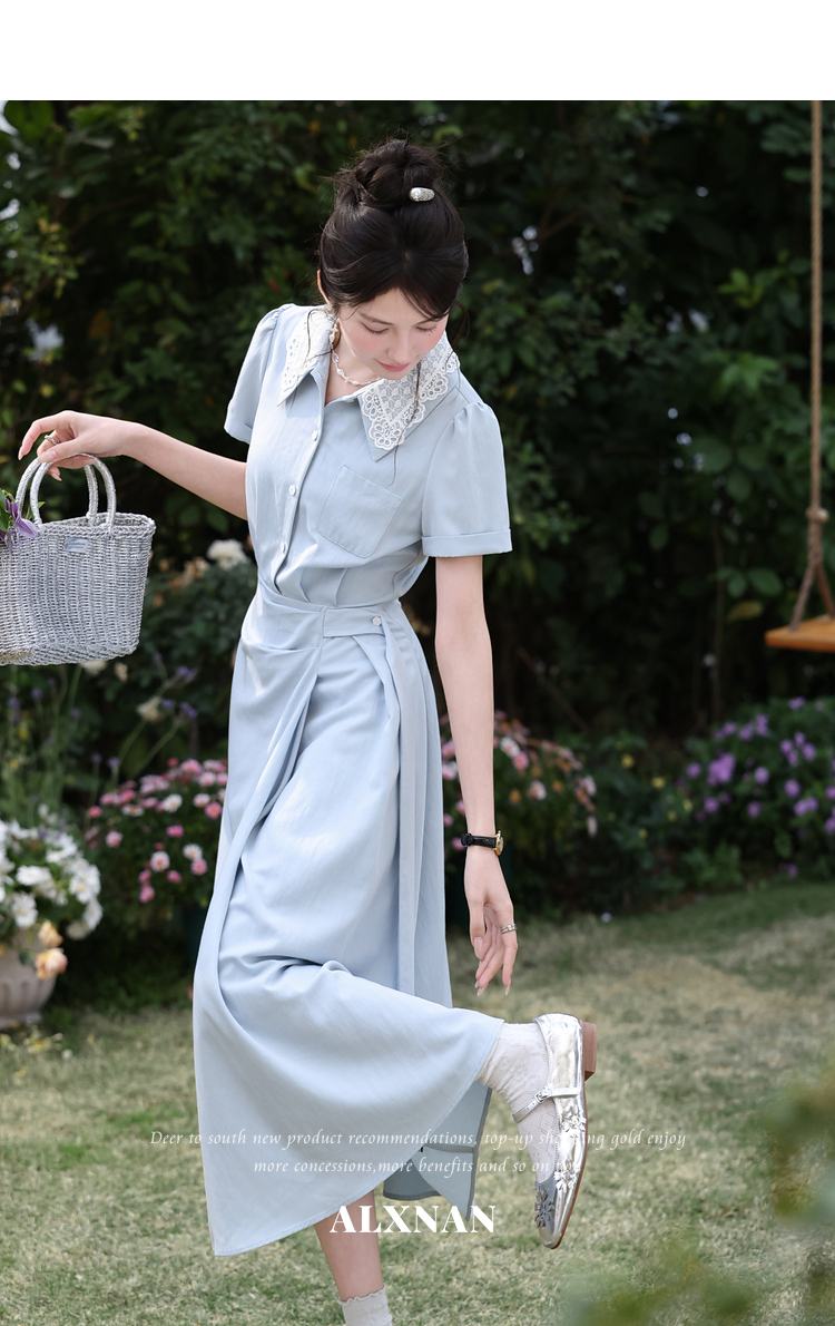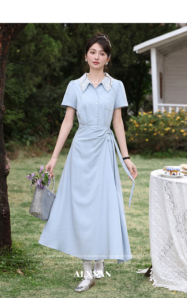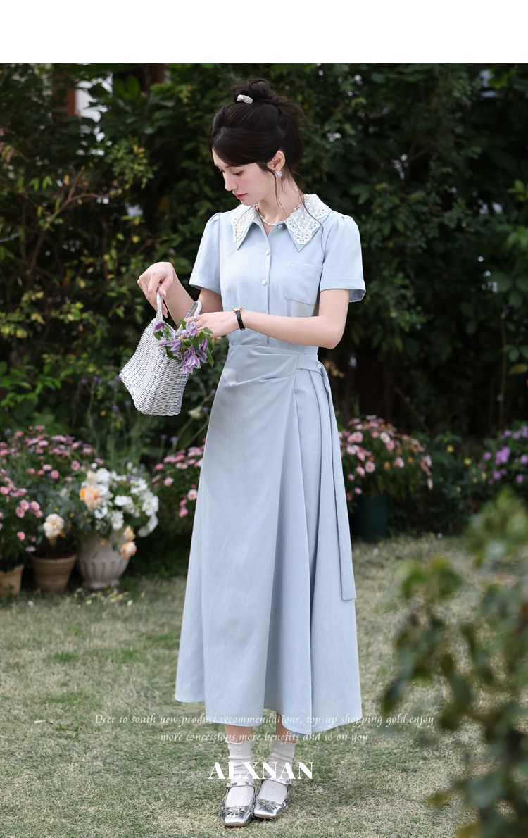 鹿向南「苍兰信笺」法式气质蓝色收腰短袖连衣裙女夏季通勤长裙子