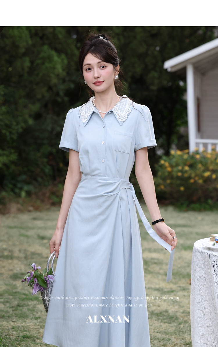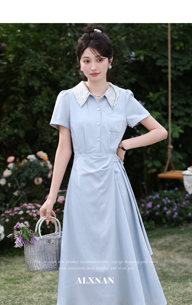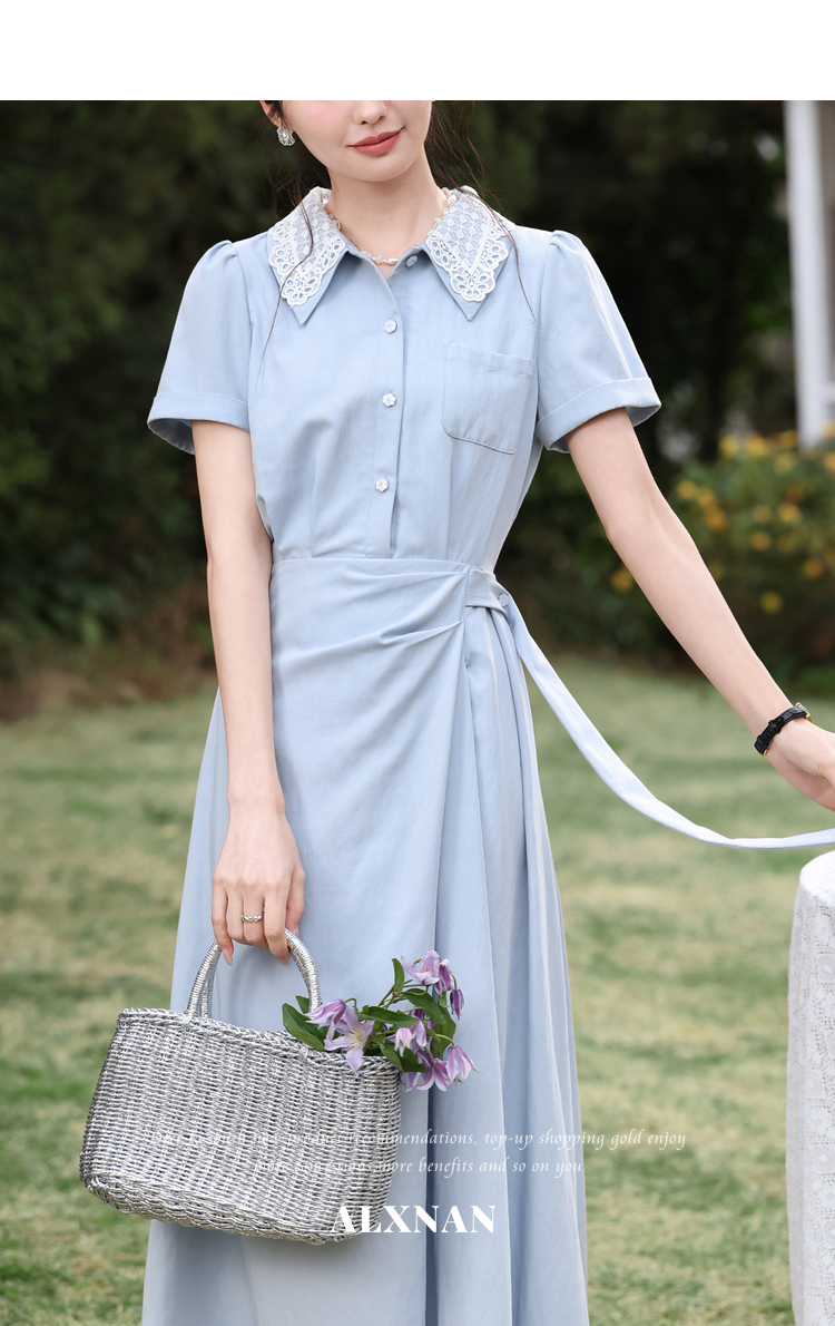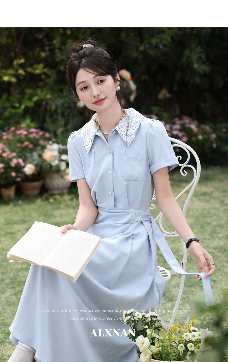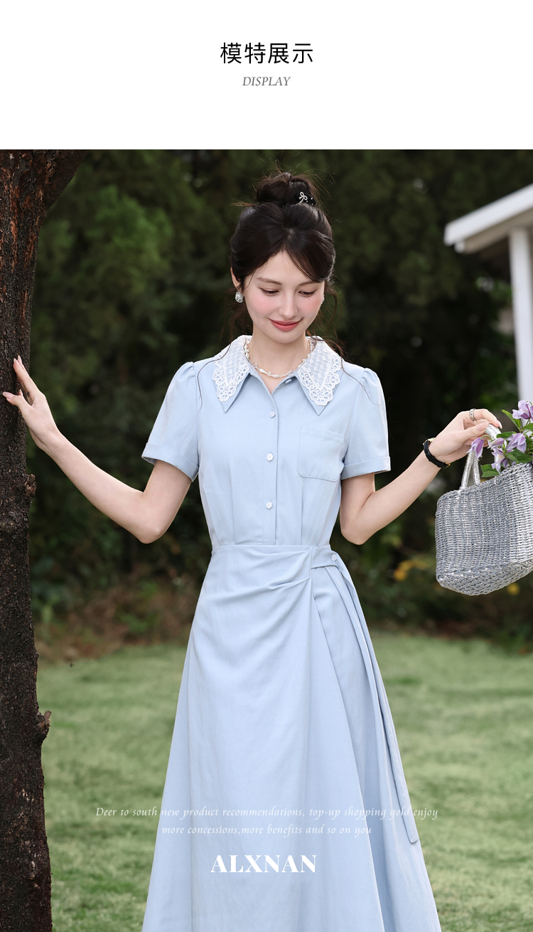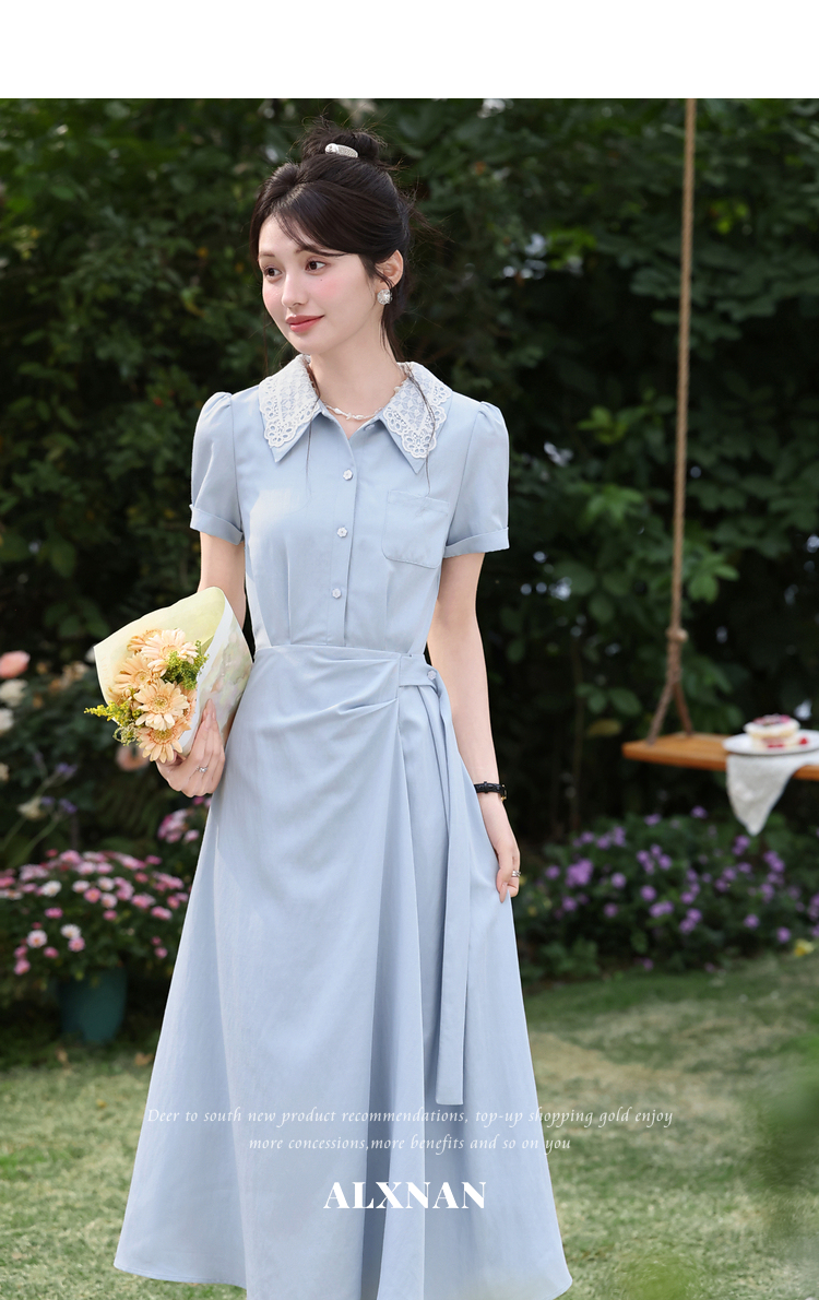 鹿向南「苍兰信笺」法式气质蓝色收腰短袖连衣裙女夏季通勤长裙子