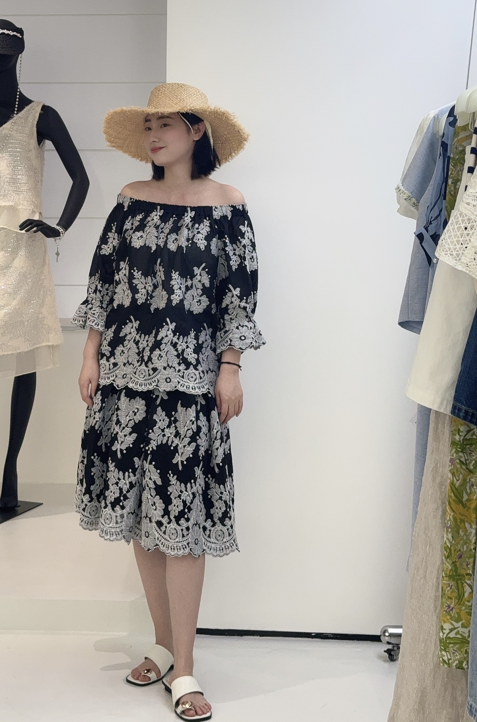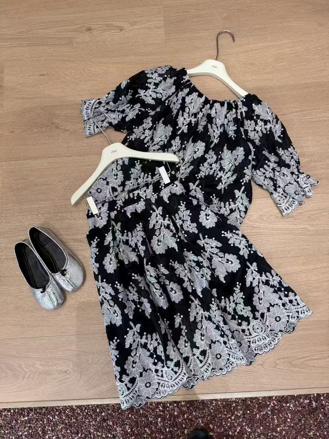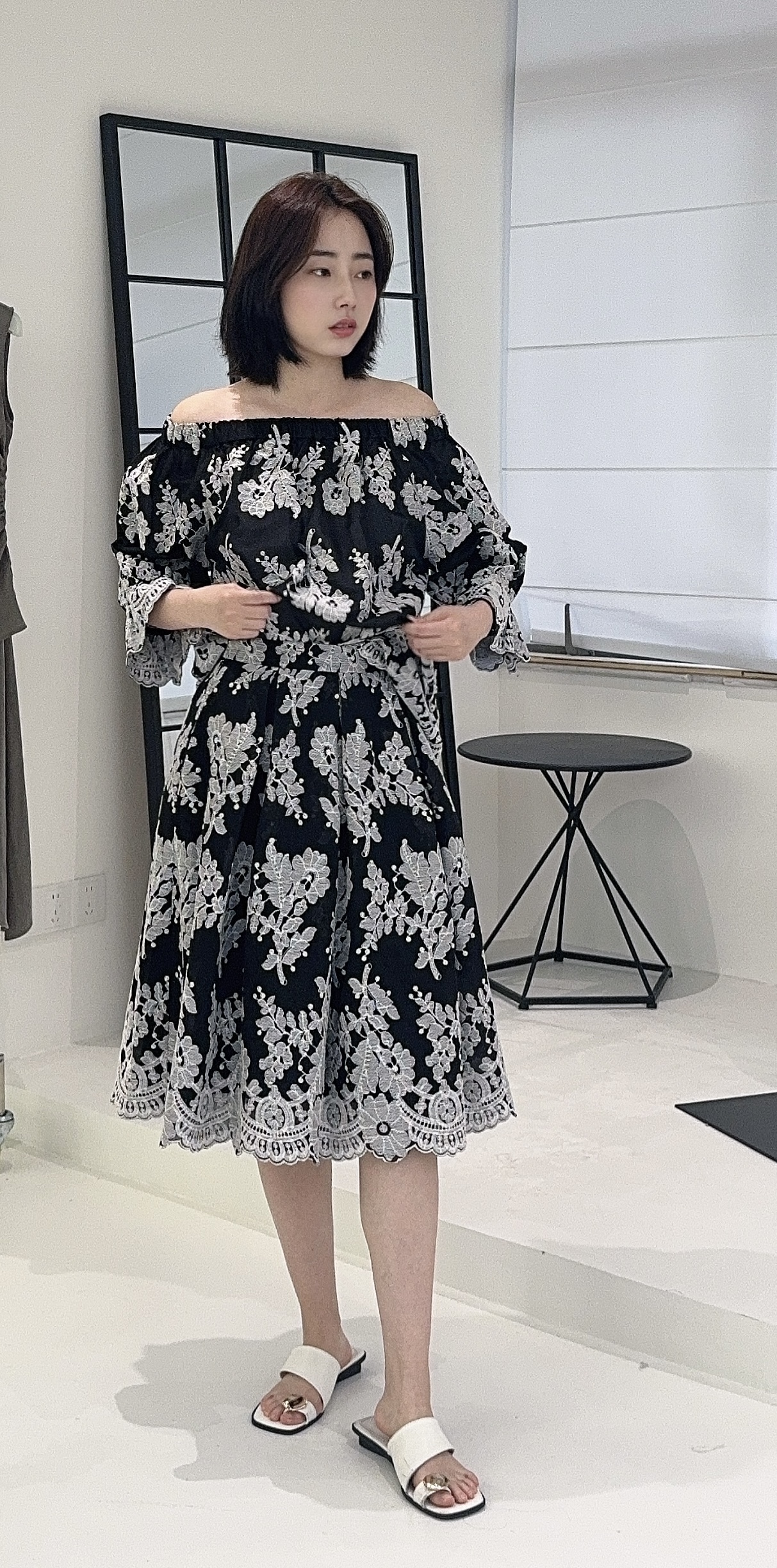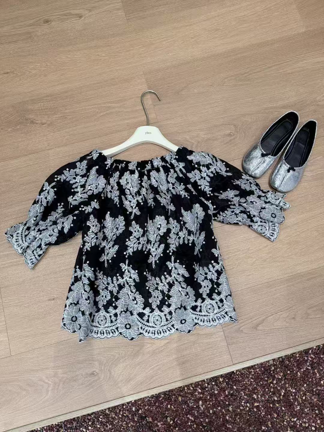 YLMS·悠路铭衫 夏款气质宽领黑白印花半袖一字领短袖