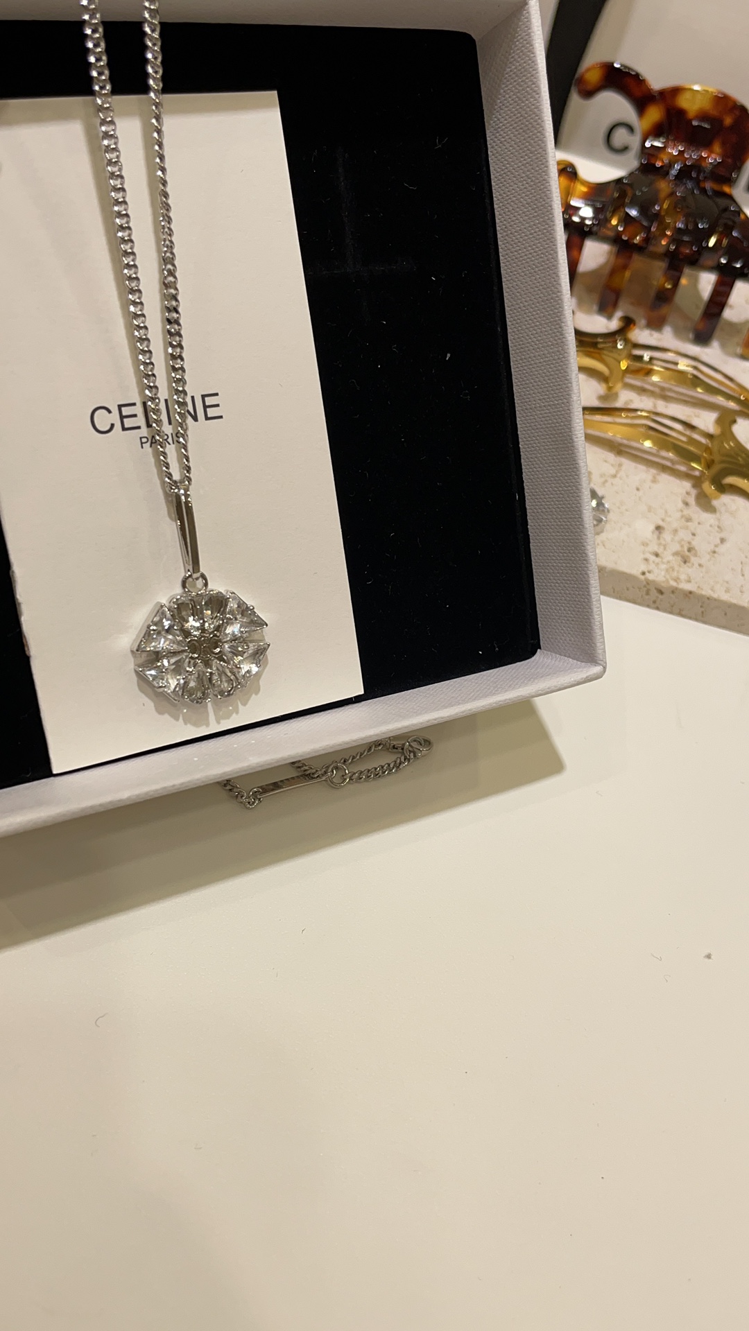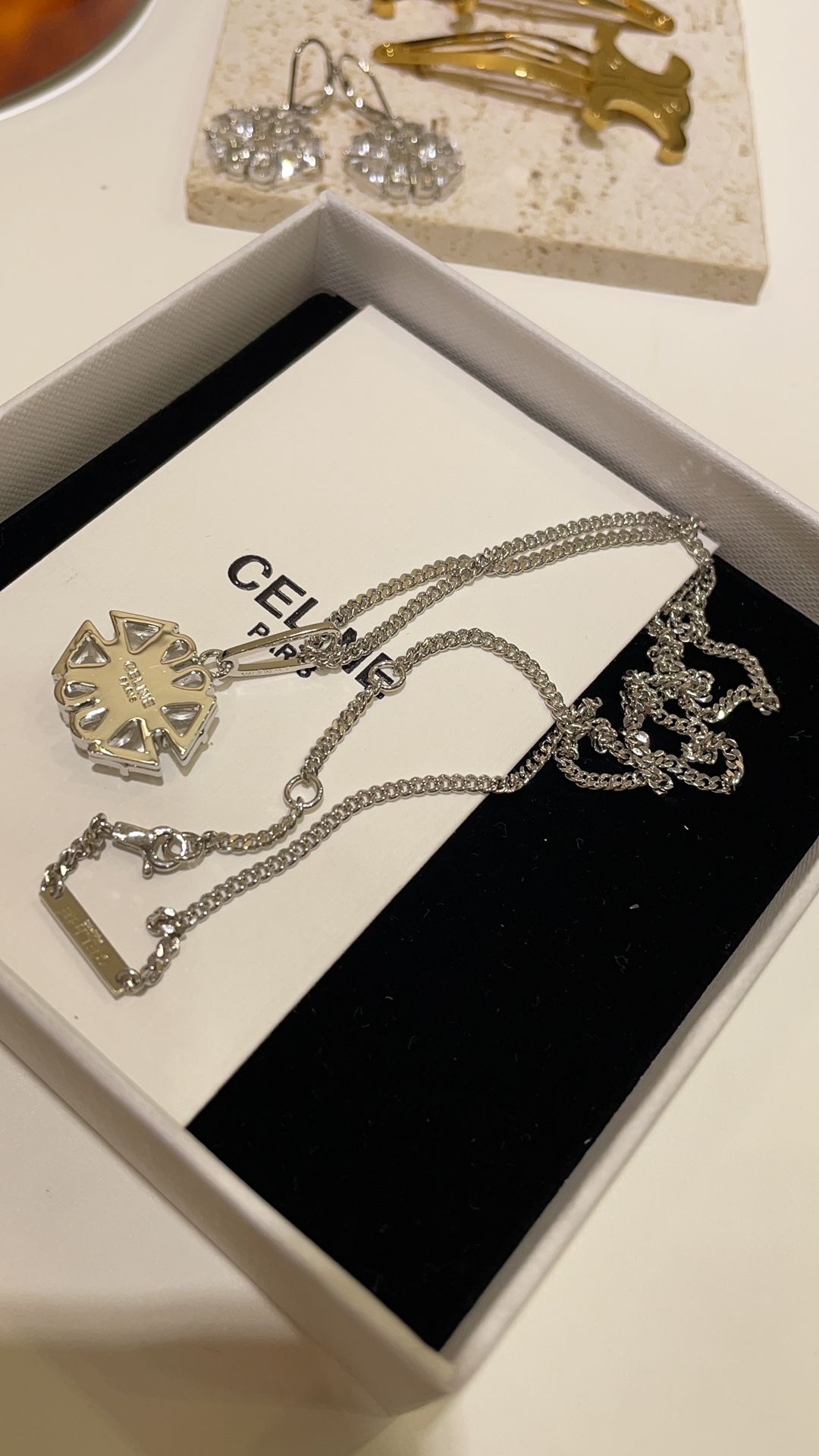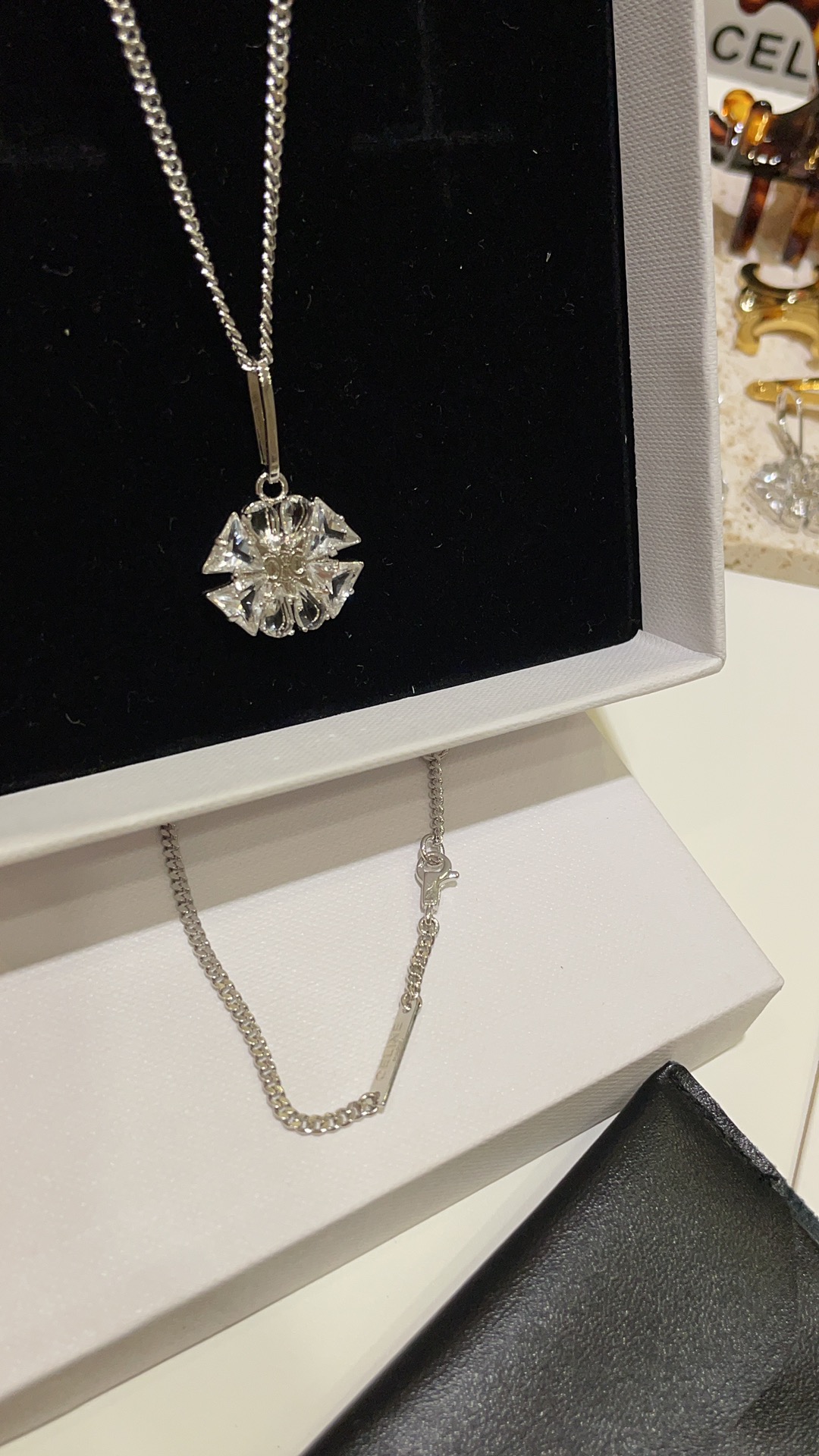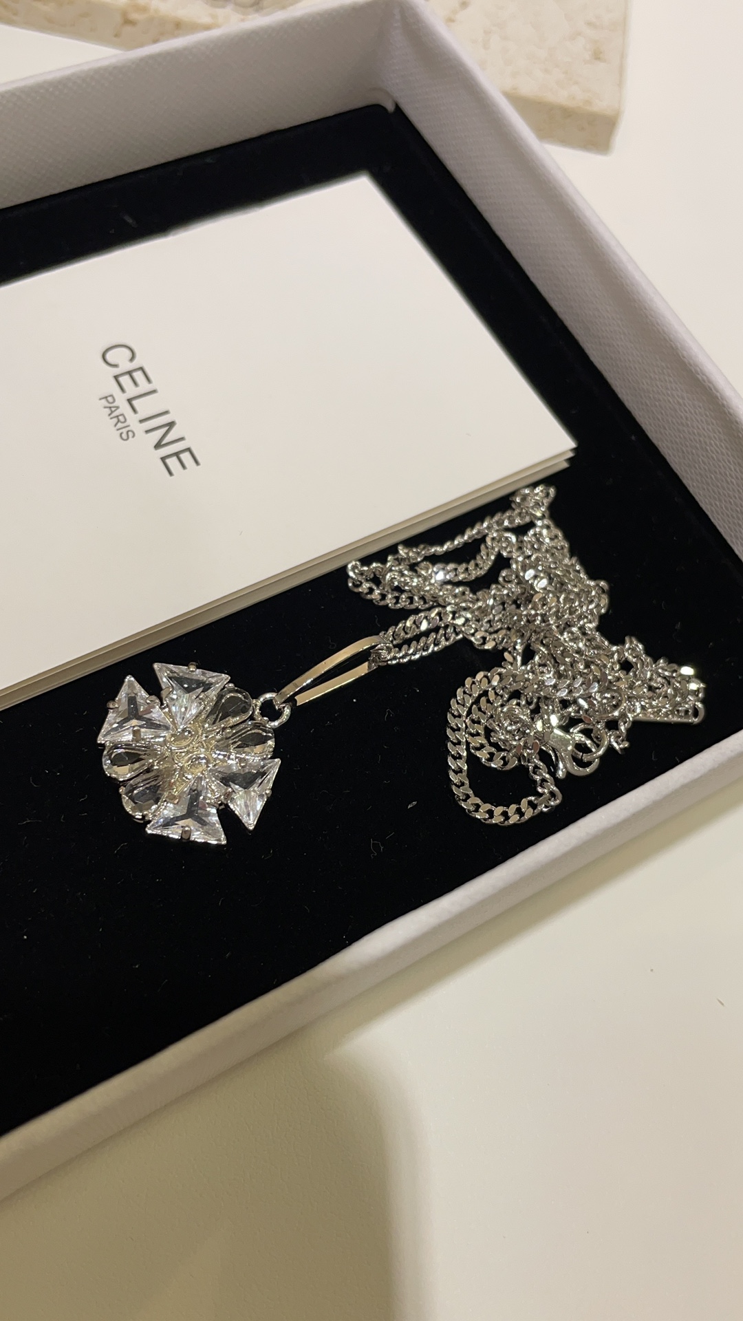 赛家 新款凯旋门徽标银色水晶花朵项链