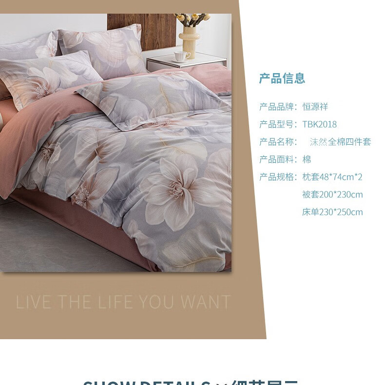 恒源祥礼业TBK2018沫然全棉四件套双人纯棉套件 1.5m(被套:200*230cm)