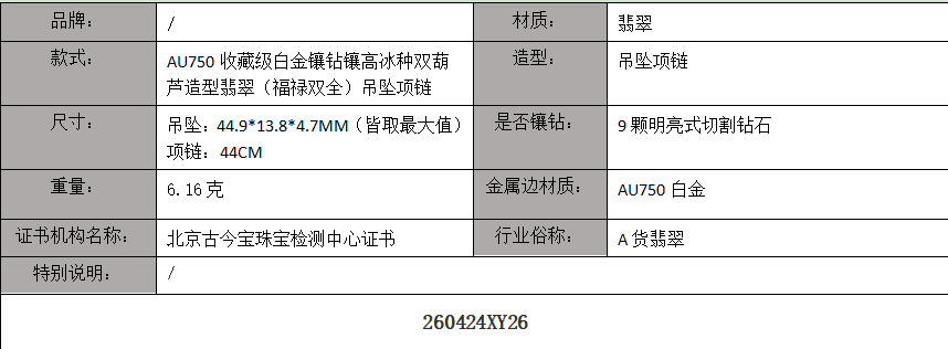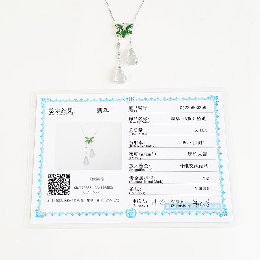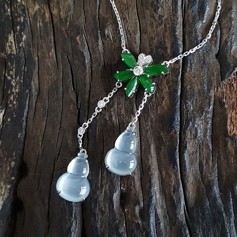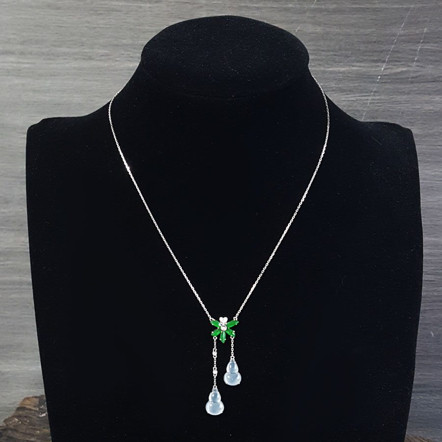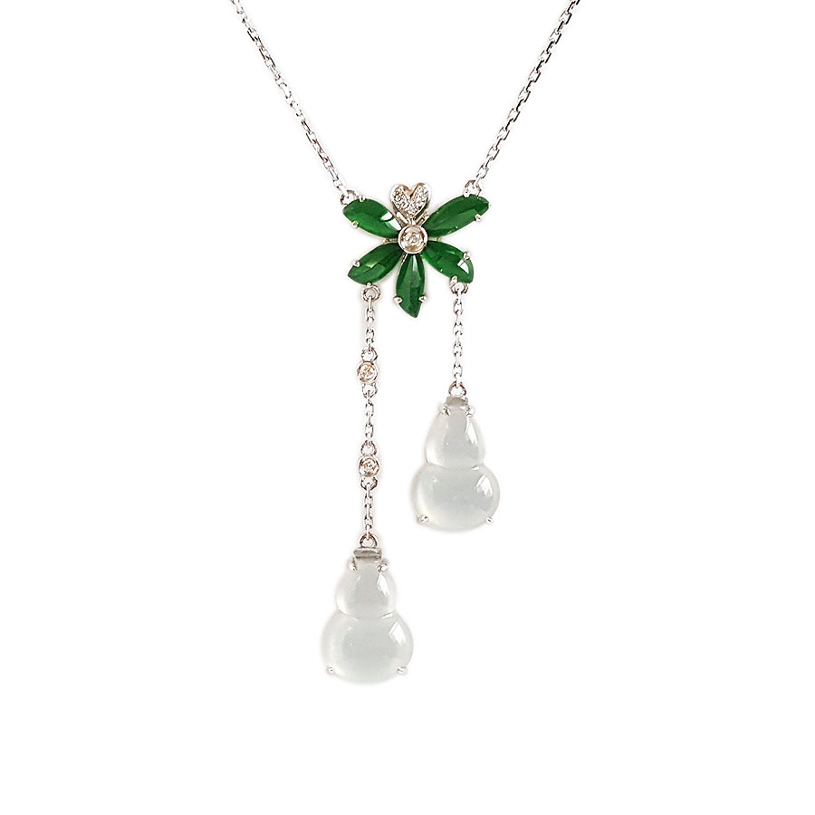 【天然正品】AU750收藏级白金镶钻镶高冰种双葫芦造型翡翠(福禄双全)吊坠项链260424XY26