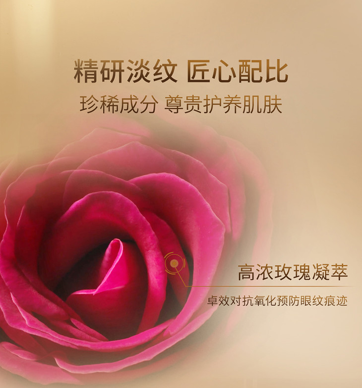 富含玫瑰精油,能加速眼周循环,改善黑眼圈、眼袋和黯沉,令眼周肌肤更显轻透净澈平滑。 精致的乳霜质地,蕴含丰富养护能量,能卓效呵护娇嫩眼部肌肤,柔亮微粒瞬间赋予眼部光采,眼周立显柔嫩透亮,找回年轻明眸美丽。