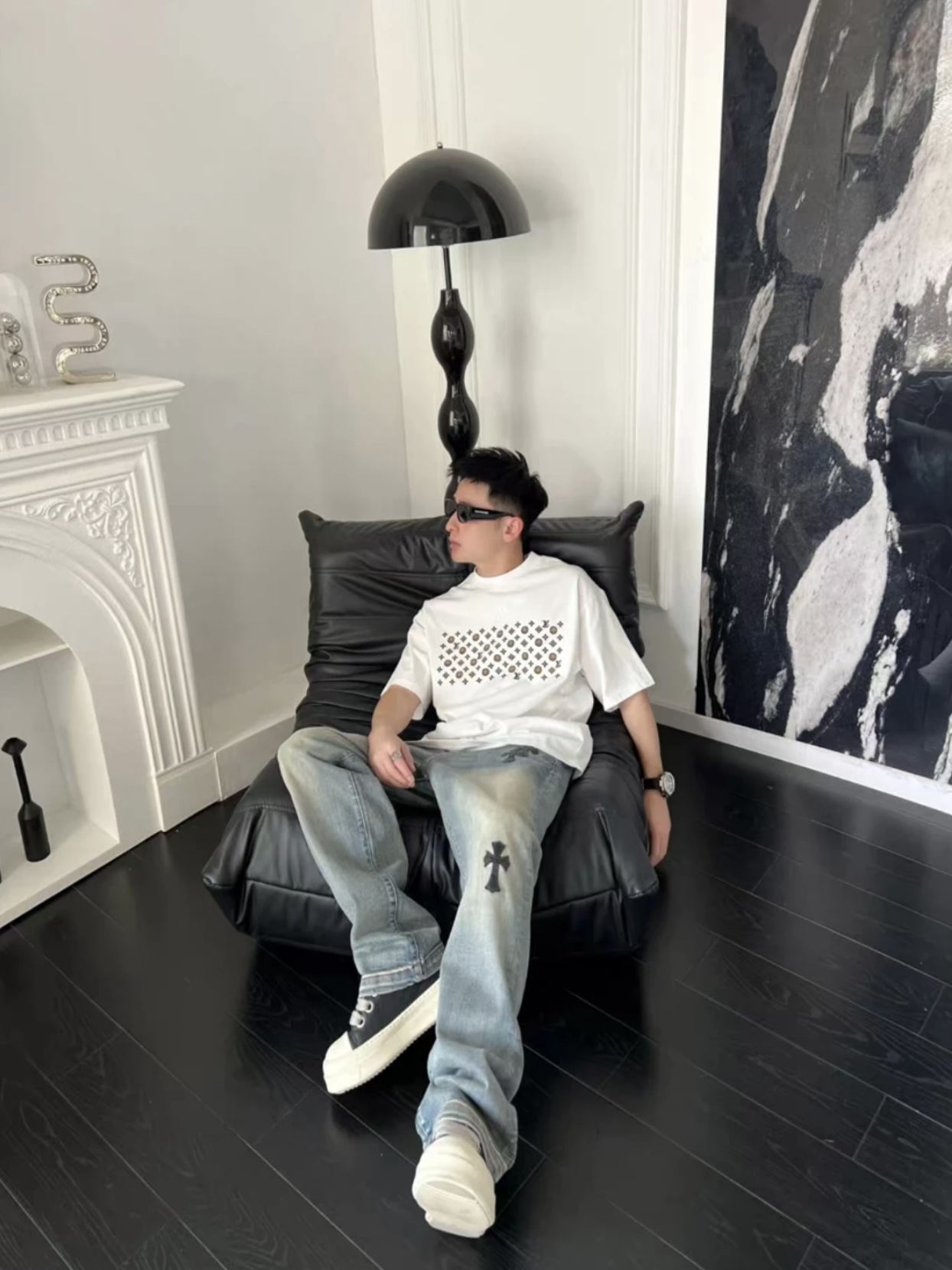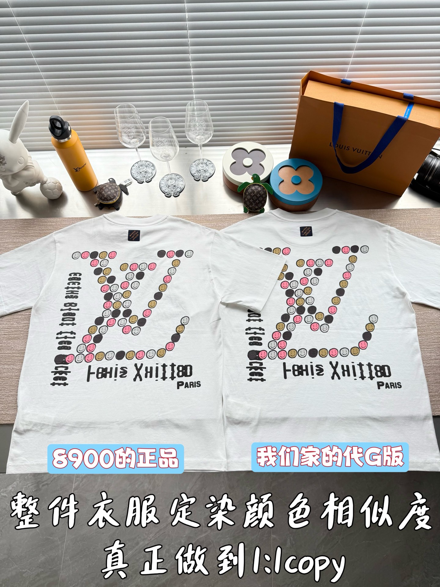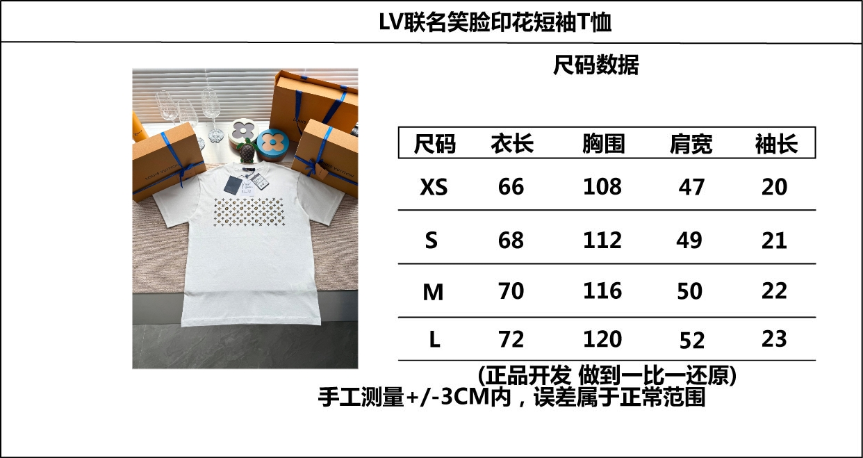 Louis Vuitton25ss联名笑脸印花短袖T恤‼️整件衣服8900购买ZP拆解打造,采用定制白色纯棉面料,做到100%全棉进口纱线,前后幅饰以联名LV字母标识图案印花设计,定织标志性罗纹领口,超紧密度局部编织,袖口 下摆双层锁边高密度走线,真正做到1:1copy 码数:XS S M L