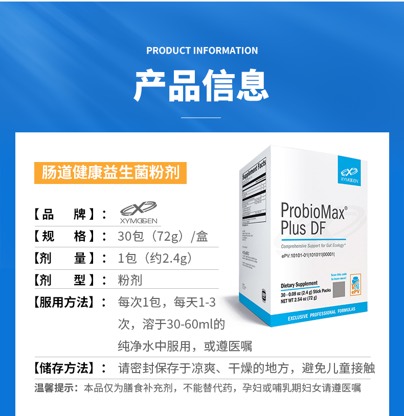 【效期至27年7月】肠道健康益生菌粉剂 XYMOGEN ProbioMax Plus DF 30包/盒