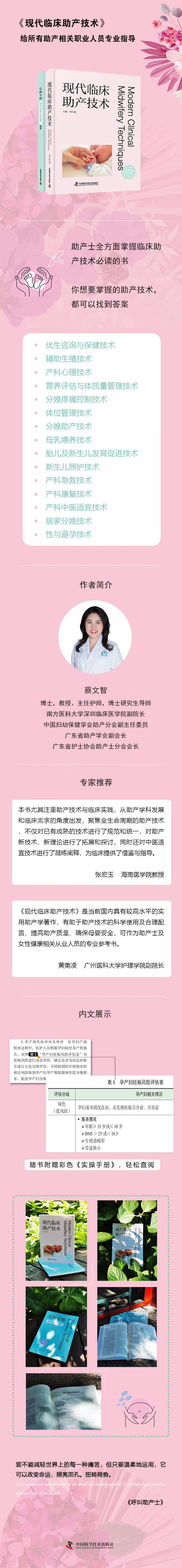 随着国家三胎政策的落地,人们对生育服务的要求不断增加,助产士的服务范围越来越广,助产实践逐步向连续性、系统化和专业化方向发展。WHO患者安全项目( patient safetyprogramme)将母婴健康定为全球低收入国家或经济转型国家的排名第20位的研究项目之一,国家卫生健康委同时提出了母婴安全行动提升计划,为如期实现“健康中国2030”的目标奠定了基础。为切实提高我国助产士的专业技术水平和临床实践能力,加强助产专业建设,我们编写了《现代临床助产技术》一书,旨在为临床不同层次的助产士等女性健康相关从业人员提供浅显易懂的实用性助产技术参考书,以期将助产新理念、新趋势和新技术在临床范围内进行普及和推广,建设一支高质量、高素质、结构优化的助产人才队伍。 本书精心遴选了核心助产技术,从助产学科发展和临床需求的角度出发,覆盖全生命周期的助产服务。全书共16章,从内容及形式上进行了创新,重点讲述助产技术的相关理论及实践,同时还增添了优生咨询与保健技术、产科心理技术、产科中医适宜技术、胎儿及新生儿发育促进技术及居家分娩技术等内容,从孕前到产后形成完整的技术链,拓展了助产士的工作范畴和服务模式;从助产技术的适应证、禁忌证、操作步骤及方法等方面进行阐述,同时设置知识拓展模块,注重循证,培养读者主动获取新知识的能力和评判性思维。书中相关助产技术操作流程图及量表可查阅随书附赠的操作流程图及相关量表实用手册。 在南方医科大学教学团队的带领下,我们组织了近20名长期从事母婴保健服务、且具备硕士及博士学历的助产专家,其中既有临床一线资深专科助产士,又有管理者和高校教师。我们结合实际工作实践、参考临床助产相关Z新指南、循证研究和操作规范,精心编写了本书。南方医科大学基于坚实的专业基础与背景,在2014年成为首批助产本科试点招生院校,率先开设了助产本科教育,被国家卫生计生委指定为招生试点单位;在2017年助产学科首次进入教育B高等教育本科专业招生目录,南方医科大学作为首批招收助产学本科生的高校之一,始终保持专业敏感性,这为本图书的编写奠定了基础。 我们要感谢参与本书编写的每一位编者,他们不辞辛苦地完成了内容的撰写与多次的审校,同时也要感谢中国科学技术出版社编辑的精心编校。我们衷心希望本书的出版能够帮助同行加强助产专业知识及技能储备,并将其应用于临床工作中,以提高母婴健康水平。 由于临床助产技术不断发展,书中所述皆来源于临床实践经验,可能存在些许疏漏之处,敬请同行们批评和指正,以便再版时改进与修订。